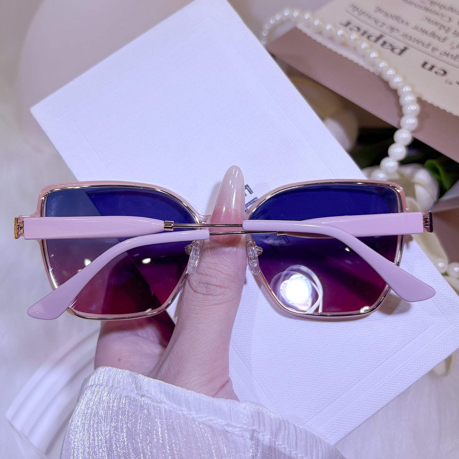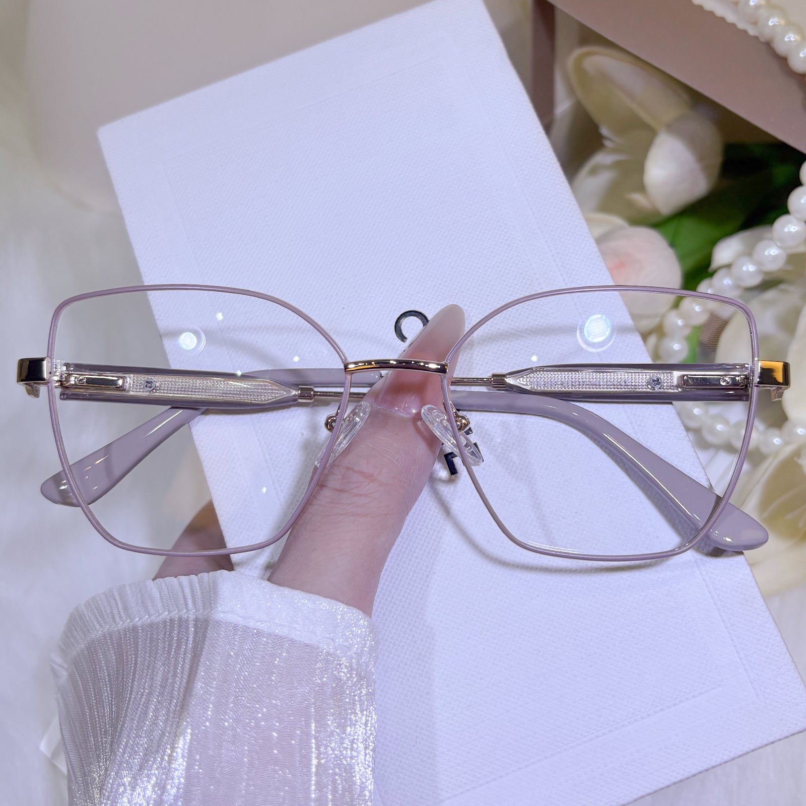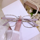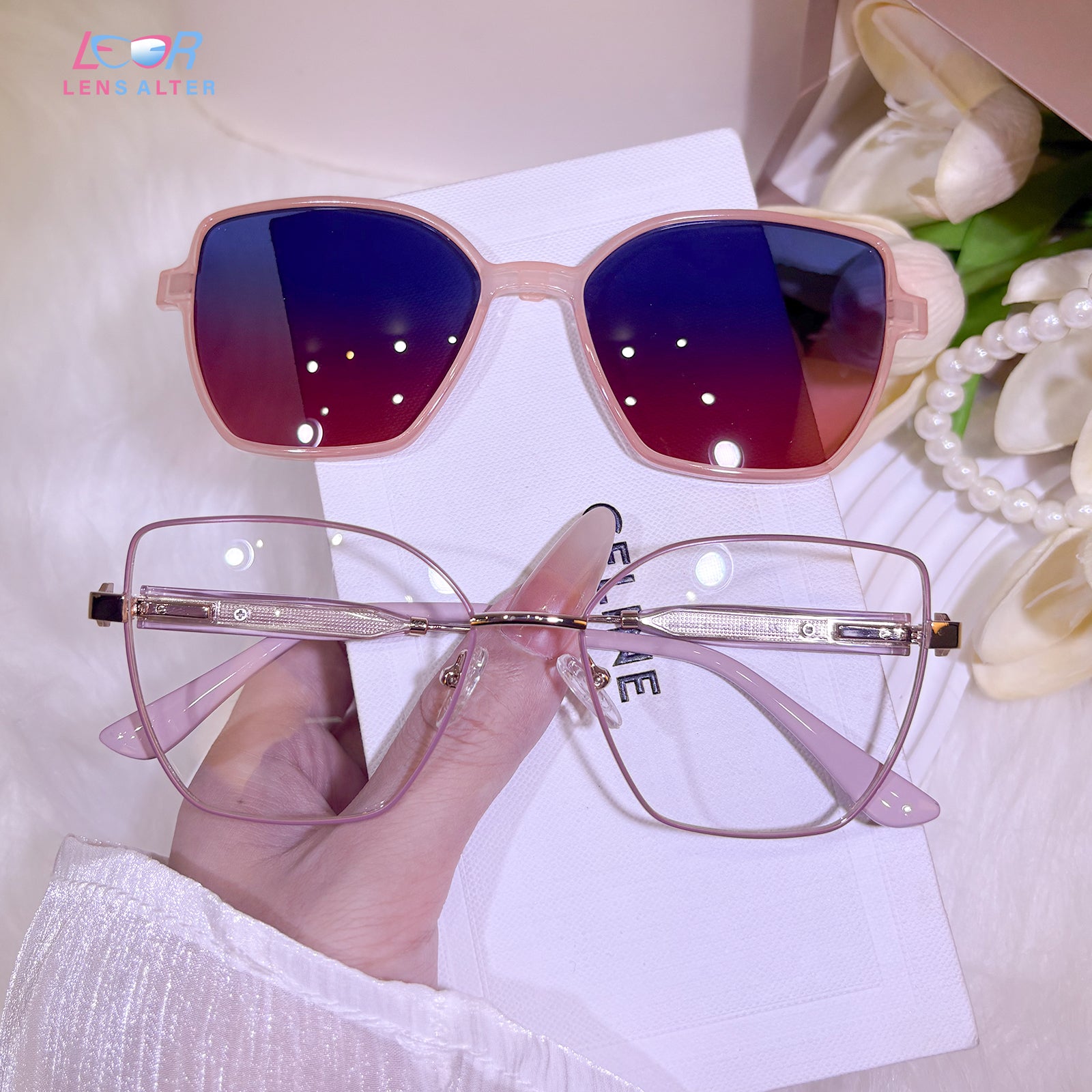 Dual elegance in soft focus. This purple-and-pink TR frame pairs a minimalist cat-eye with a sleek clip-on sun layer. It’s two looks in one—dreamy by default, luminous in the sun—crafted for the modern woman who values both style and adaptability.