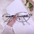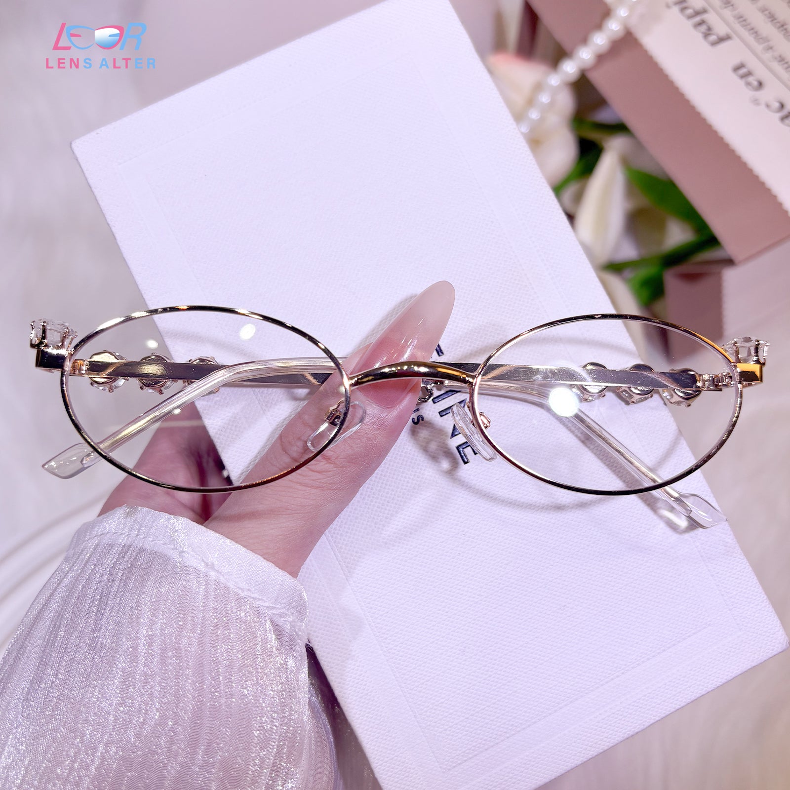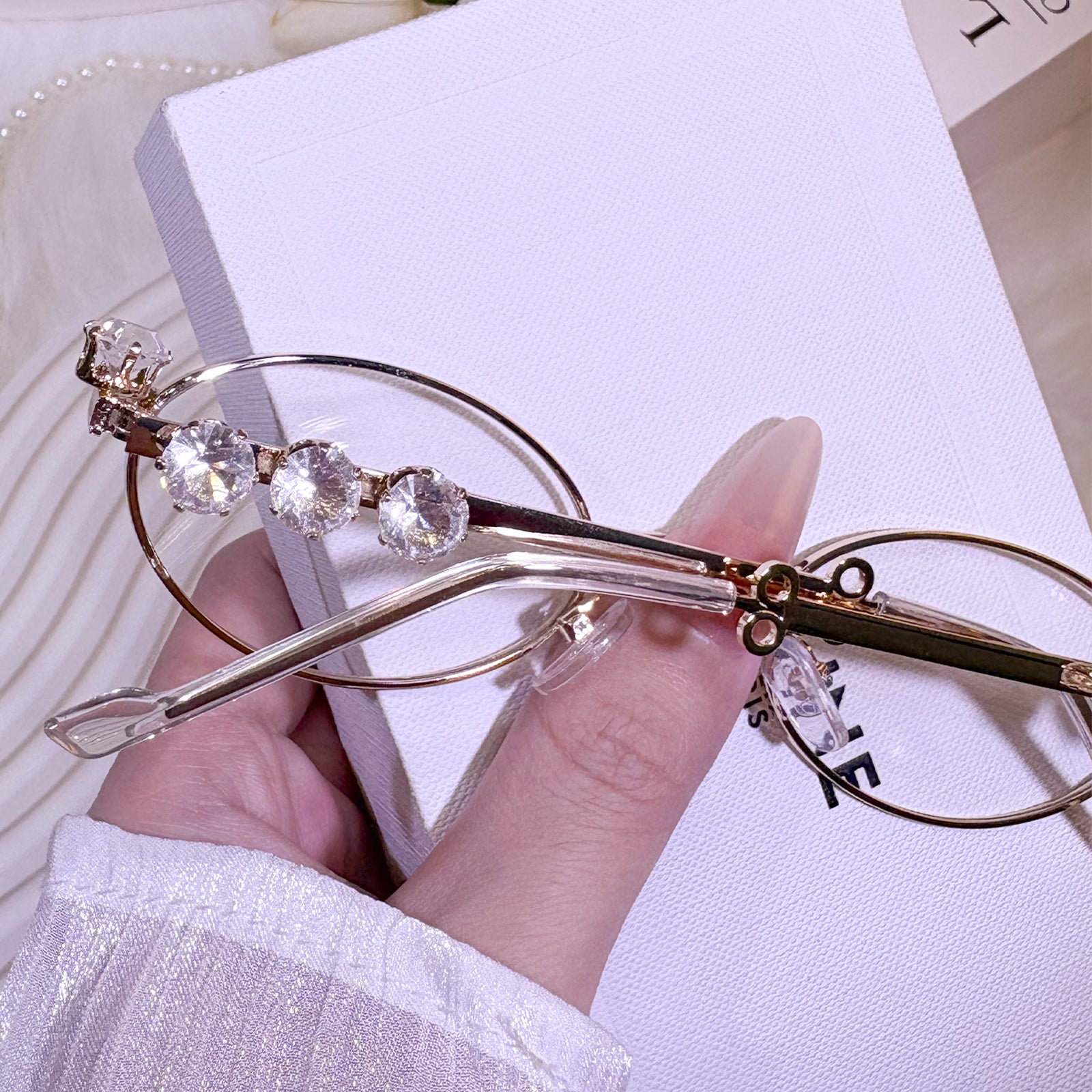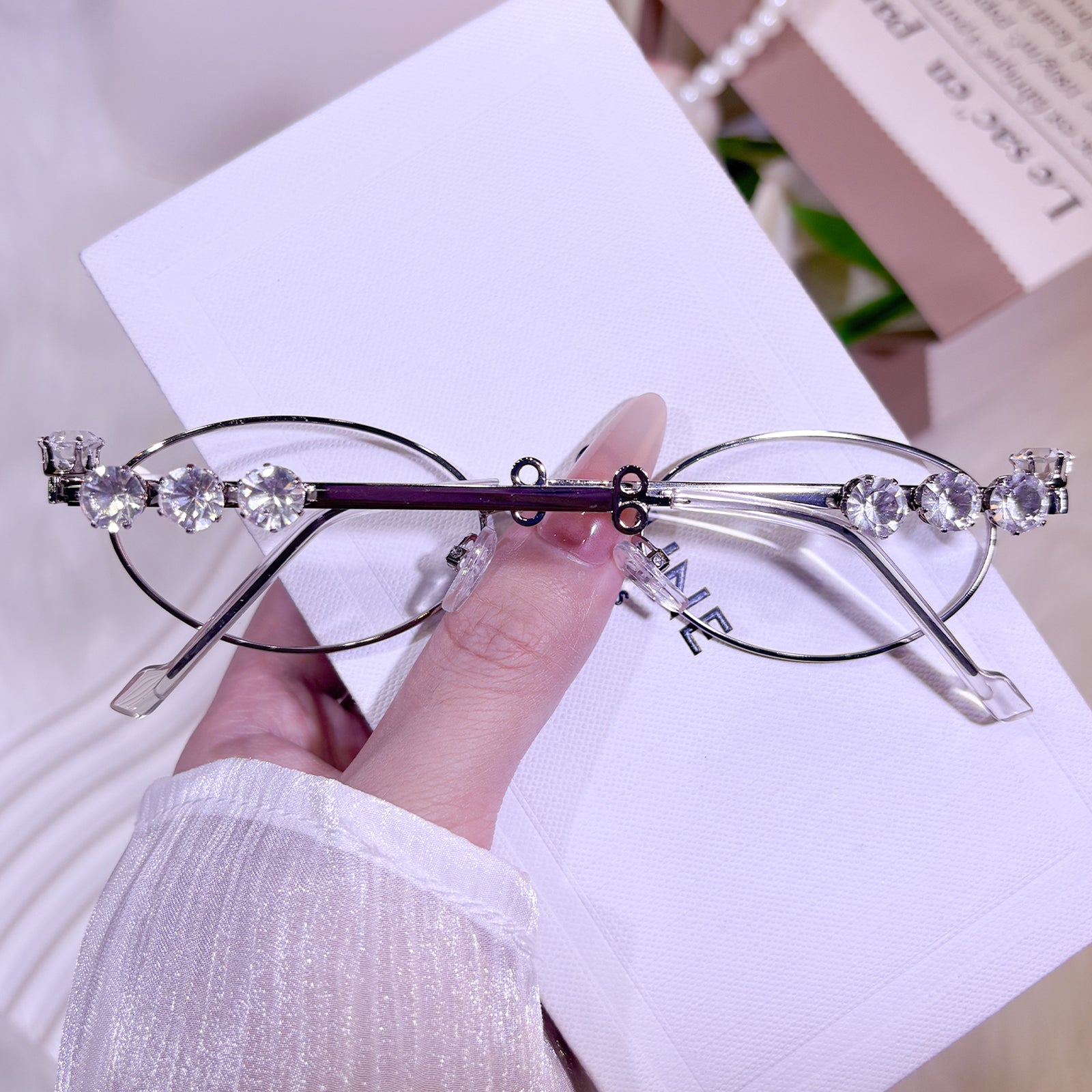 Step into the spotlight with these Y2K-inspired oval metal frames, sparkling with dazzling rhinestones that capture vintage glam. Perfectly feminine and irresistibly chic, they add a radiant shine to any outfit. Bold, stylish, and undeniably eye-catching—these frames are made for those who love to shine.