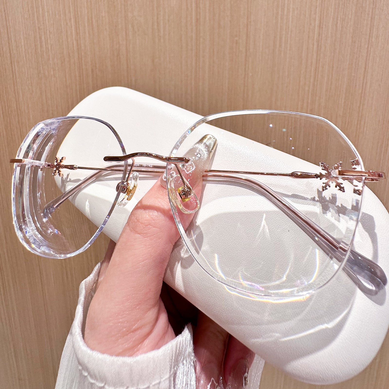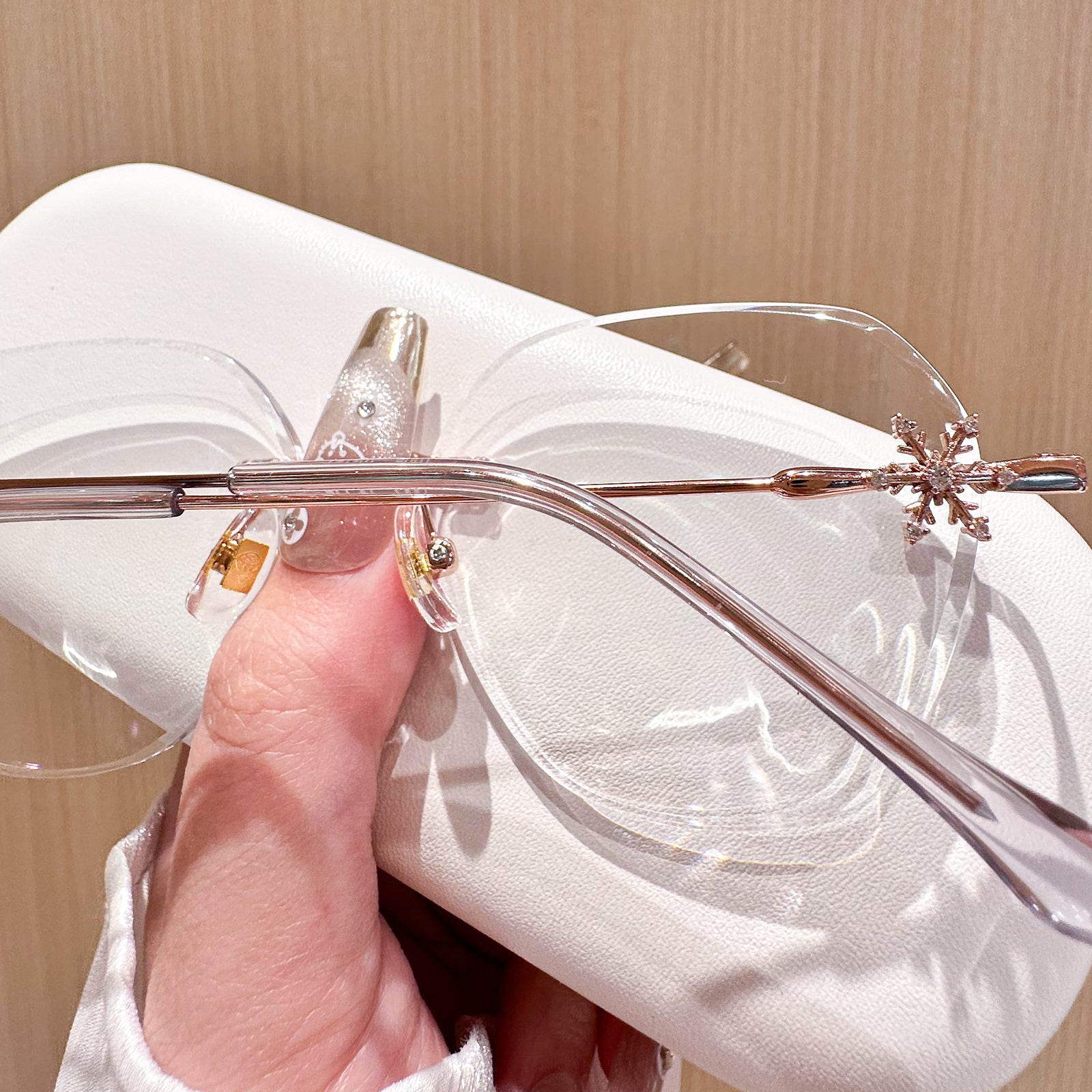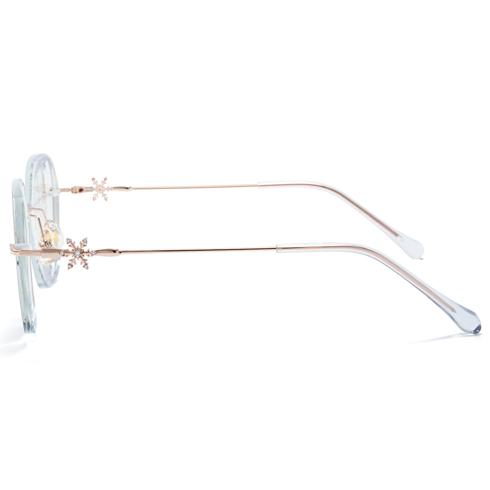 استمتع بسحر الشتاء مع هذه النظارات الهندسية الأنيقة بدون إطار، والمزينة بزخارف ندفة الثلج الرقيقة على الصدغ. مثالي للأشهر الباردة، يضيف هذا التصميم الساحر لمسة من السحر والرقي، مما يجعله إكسسوارًا مثاليًا للحصول على مظهر موسمي حالم.