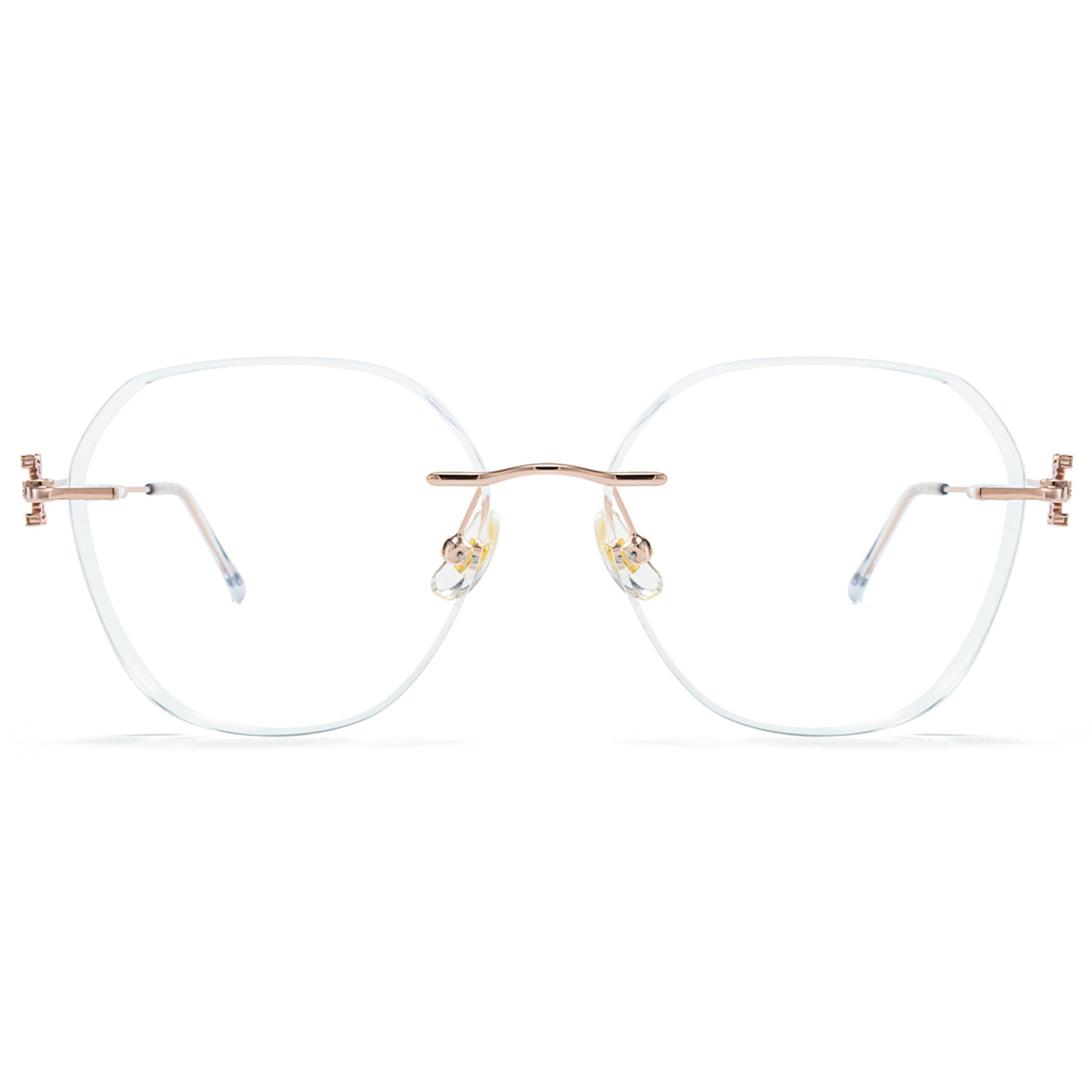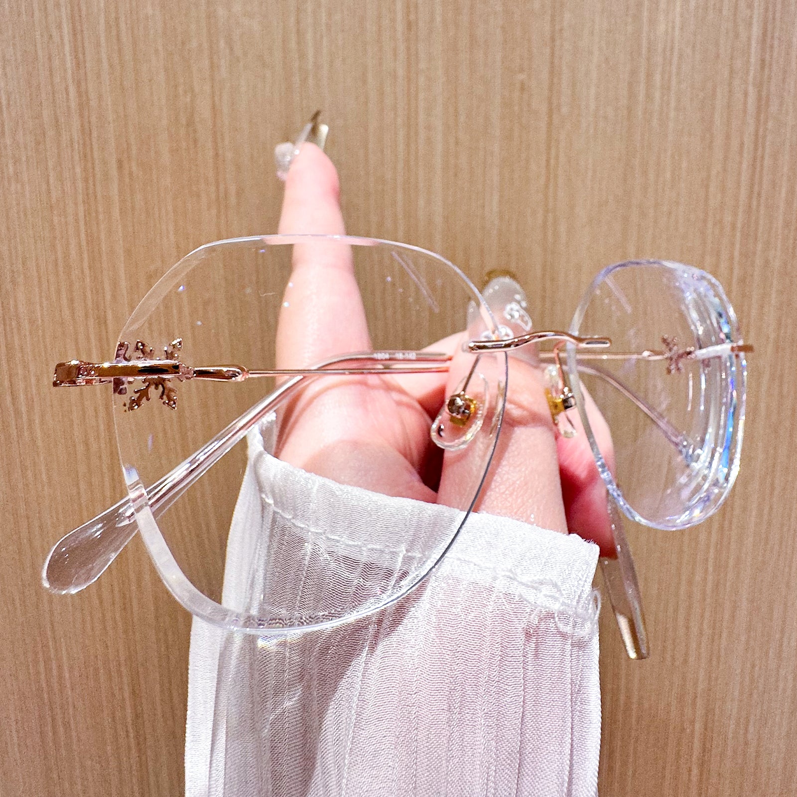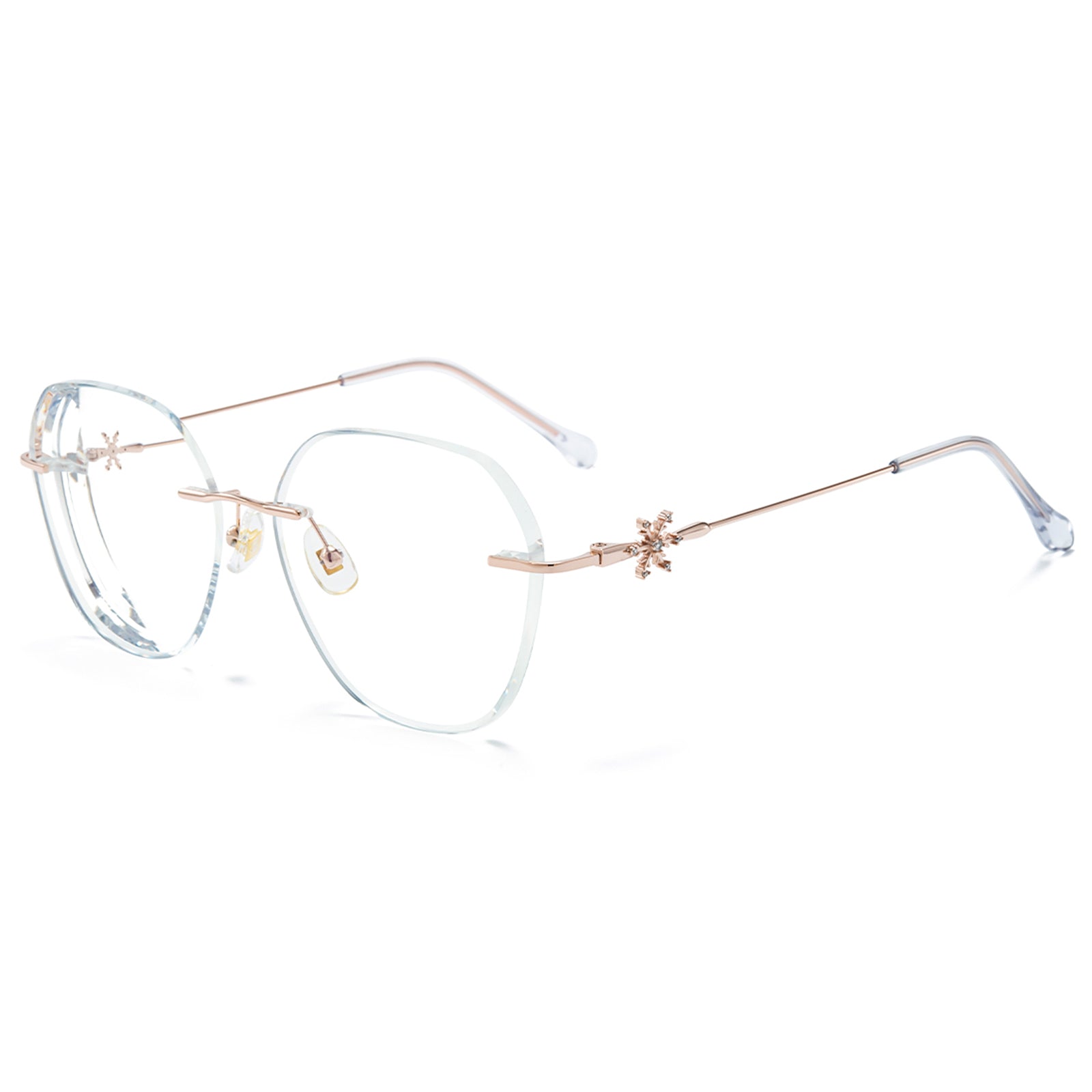 استمتع بسحر الشتاء مع هذه النظارات الهندسية الأنيقة بدون إطار، والمزينة بزخارف ندفة الثلج الرقيقة على الصدغ. مثالي للأشهر الباردة، يضيف هذا التصميم الساحر لمسة من السحر والرقي، مما يجعله إكسسوارًا مثاليًا للحصول على مظهر موسمي حالم.