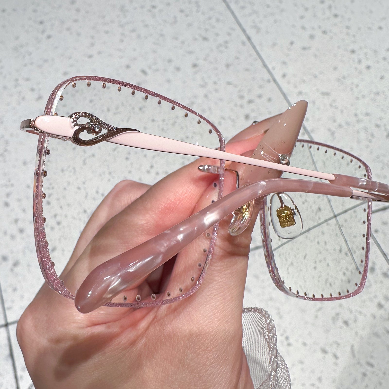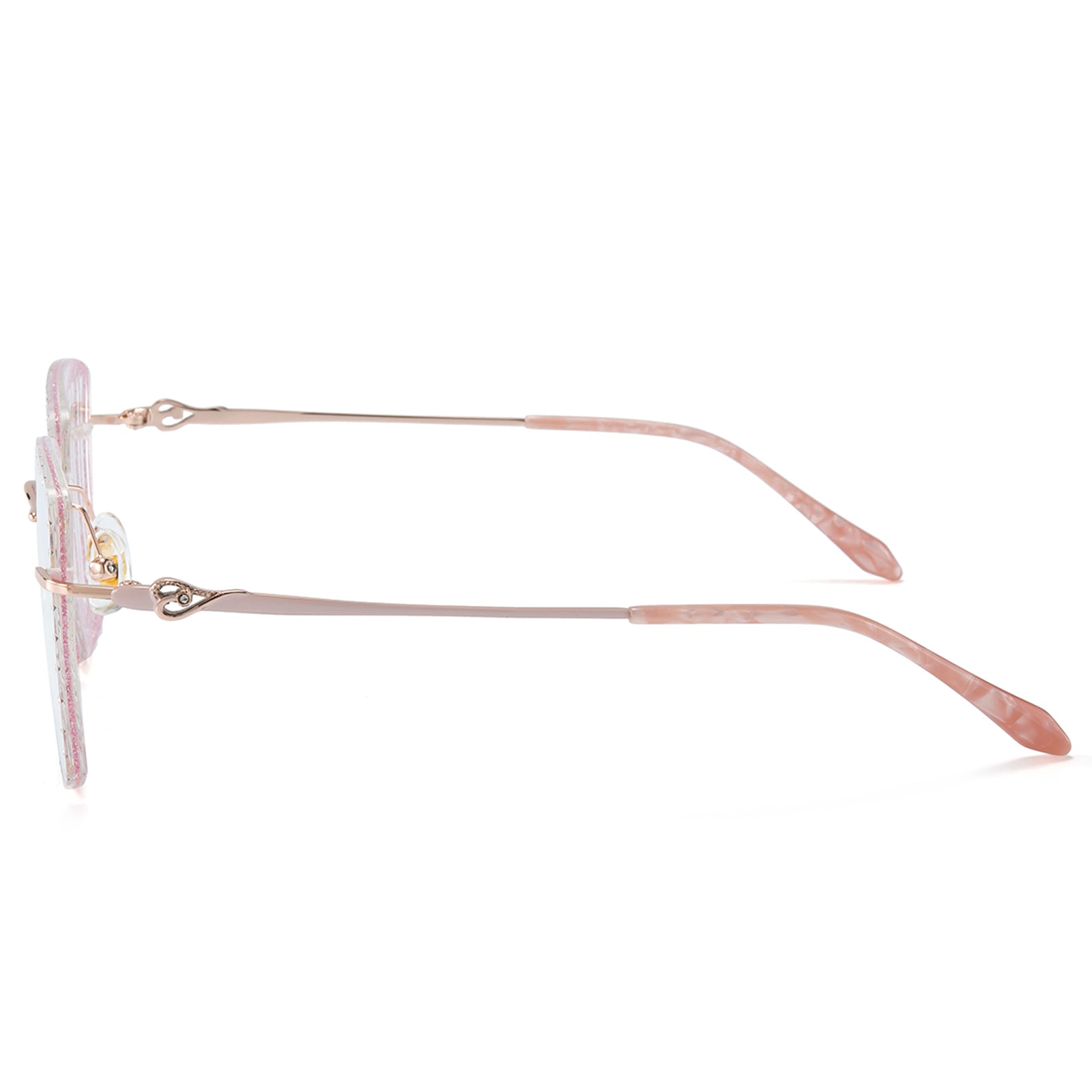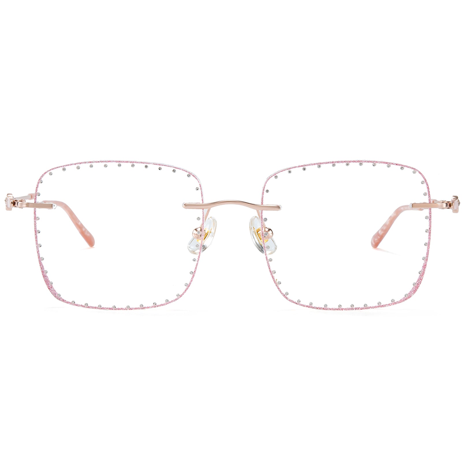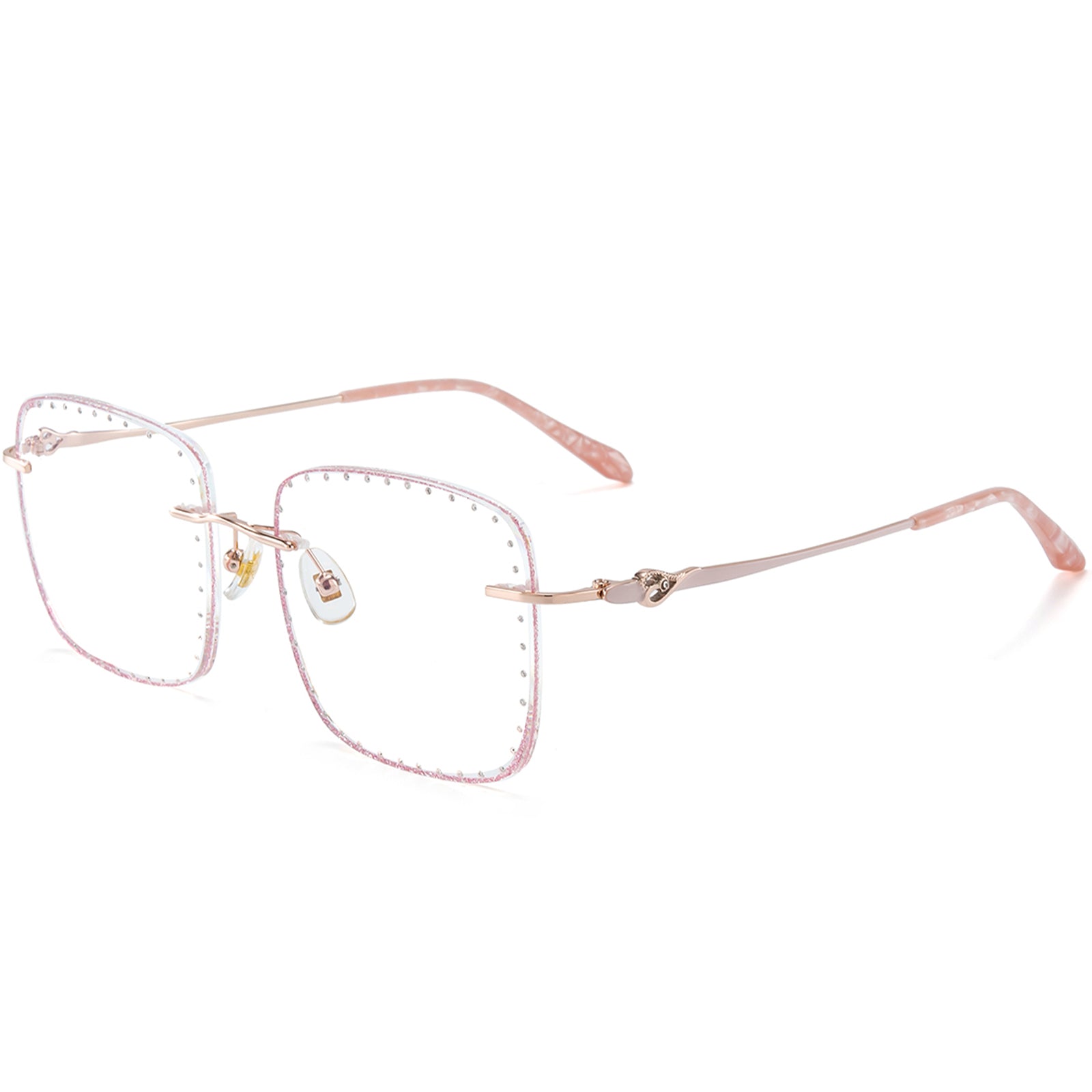 تتميز هذه النظارات المربعة بدون إطار بإطار معدني وردي متطور، وعدسات مرصعة بالألماس، وأنماط حب ساحرة على الصدغ. مصممة للشابات اللاتي يقدرن النبل والأناقة.