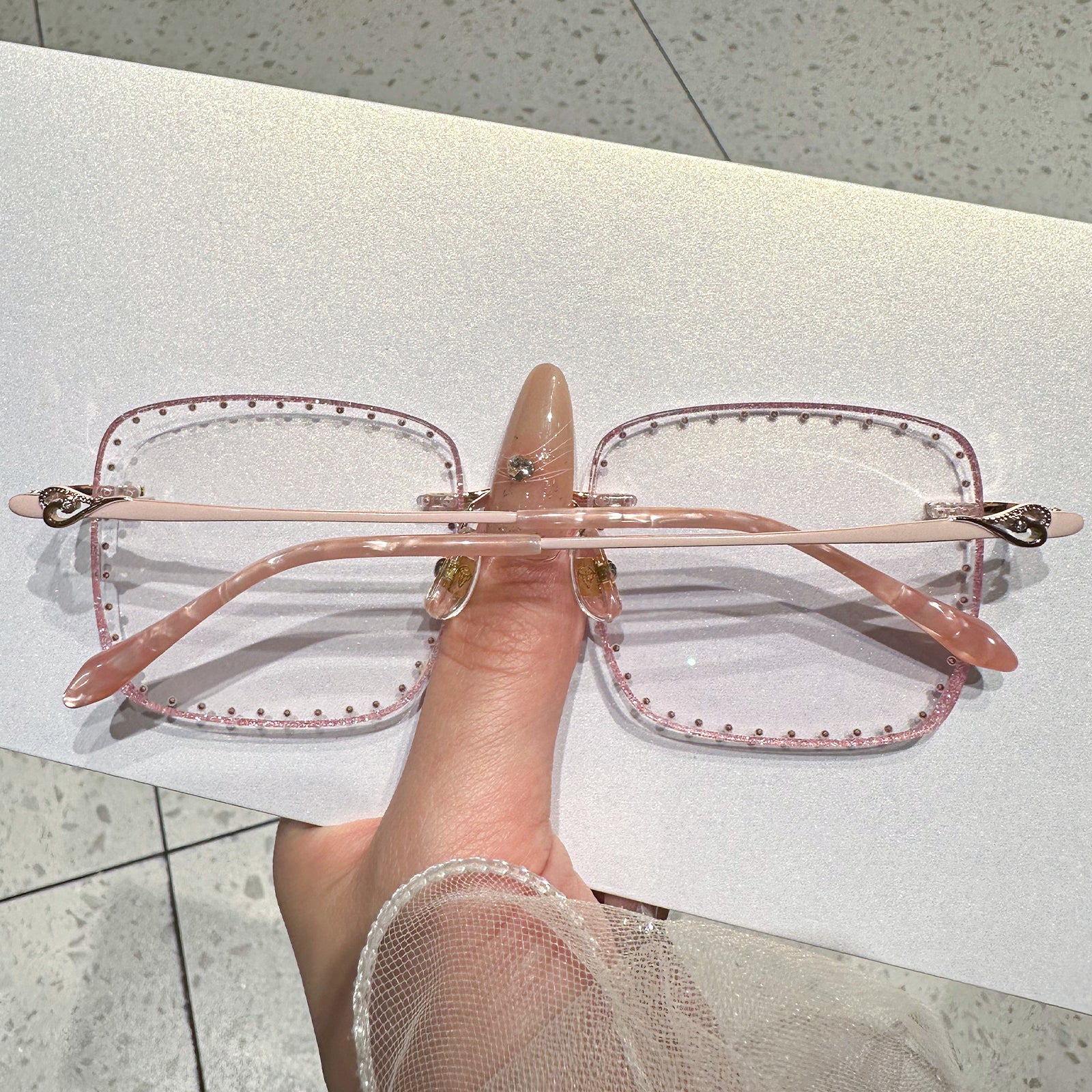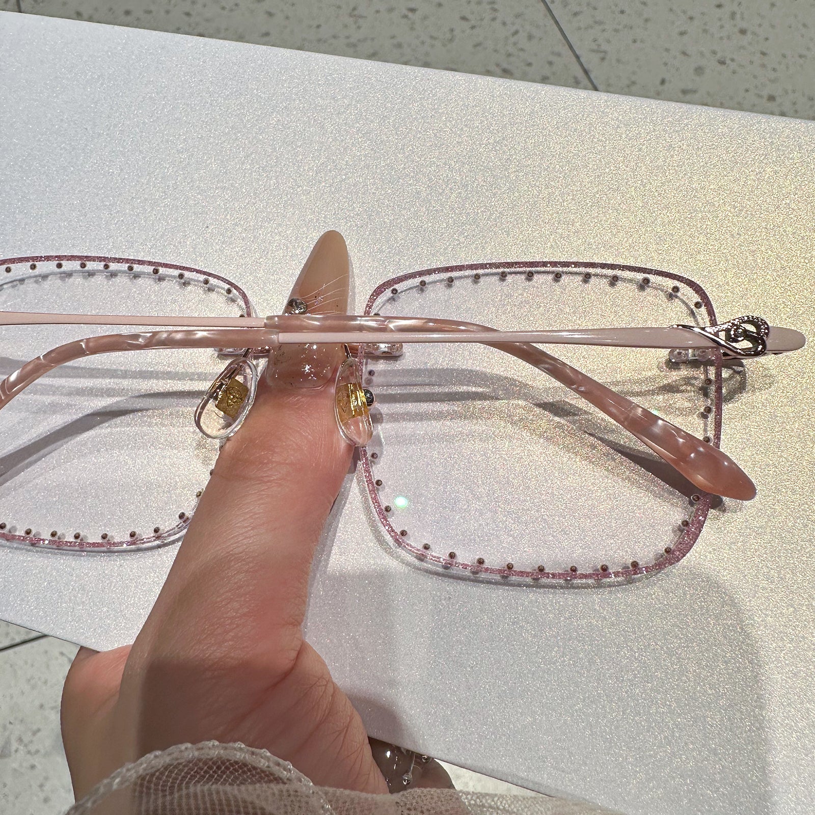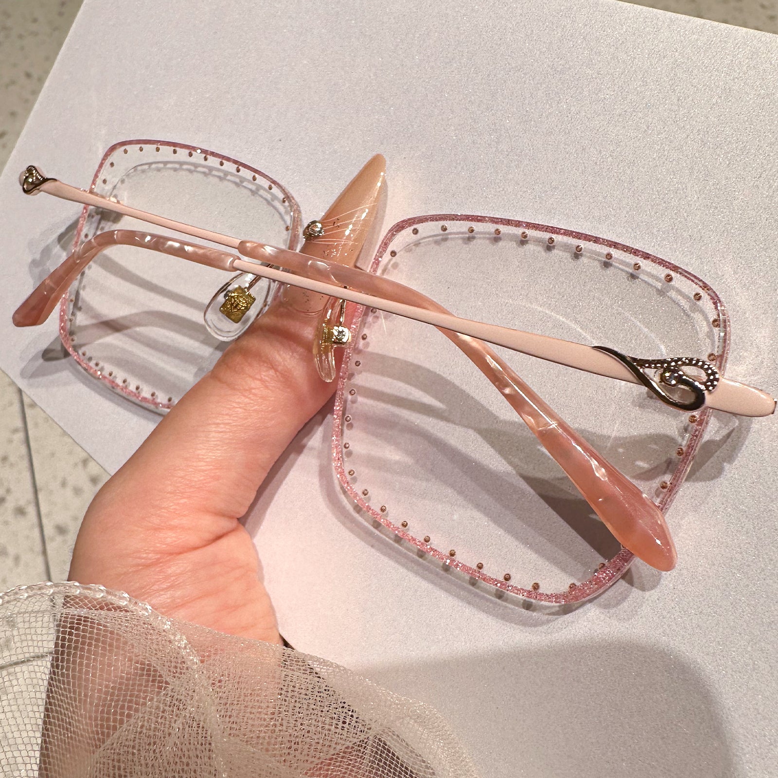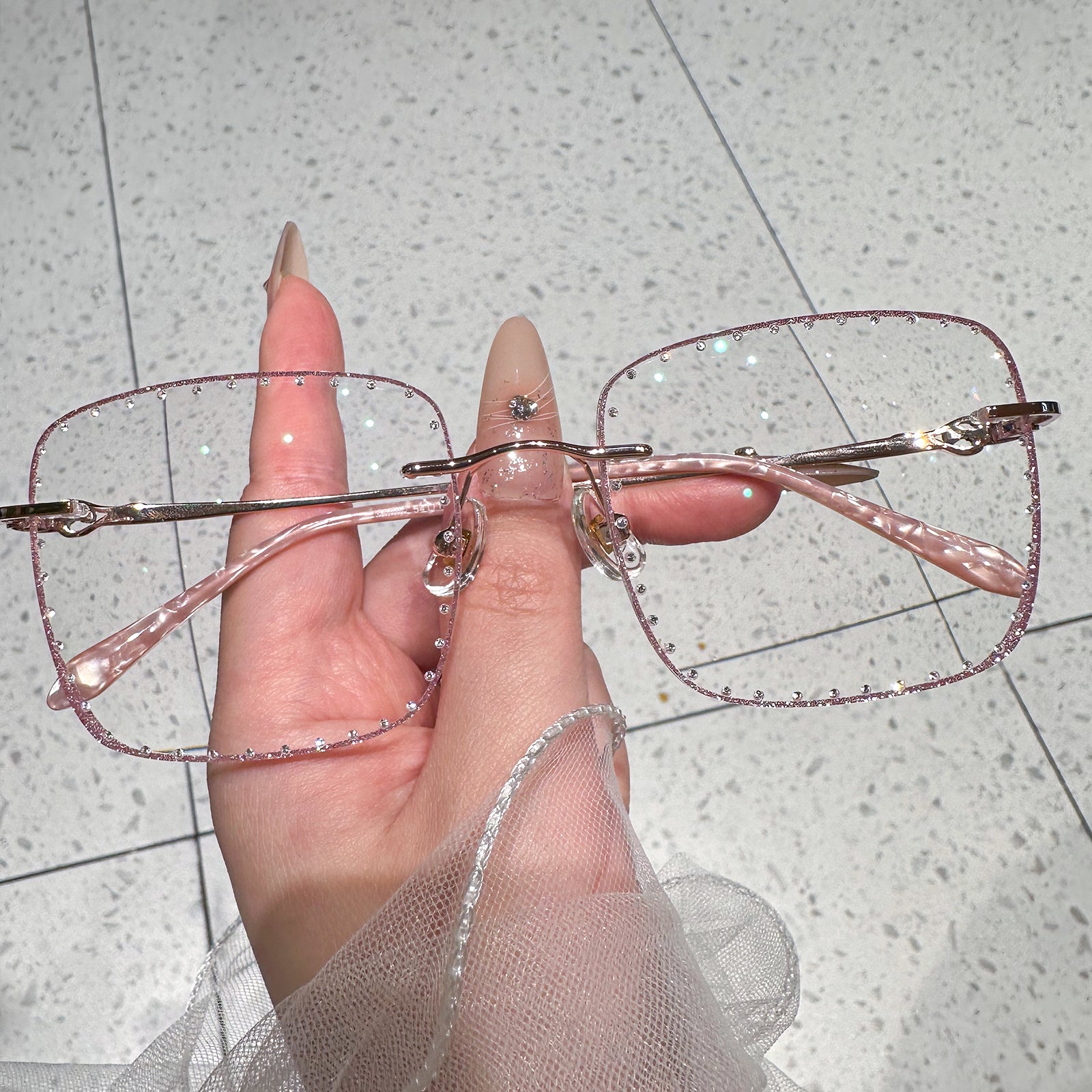 تتميز هذه النظارات المربعة بدون إطار بإطار معدني وردي متطور، وعدسات مرصعة بالألماس، وأنماط حب ساحرة على الصدغ. مصممة للشابات اللاتي يقدرن النبل والأناقة.