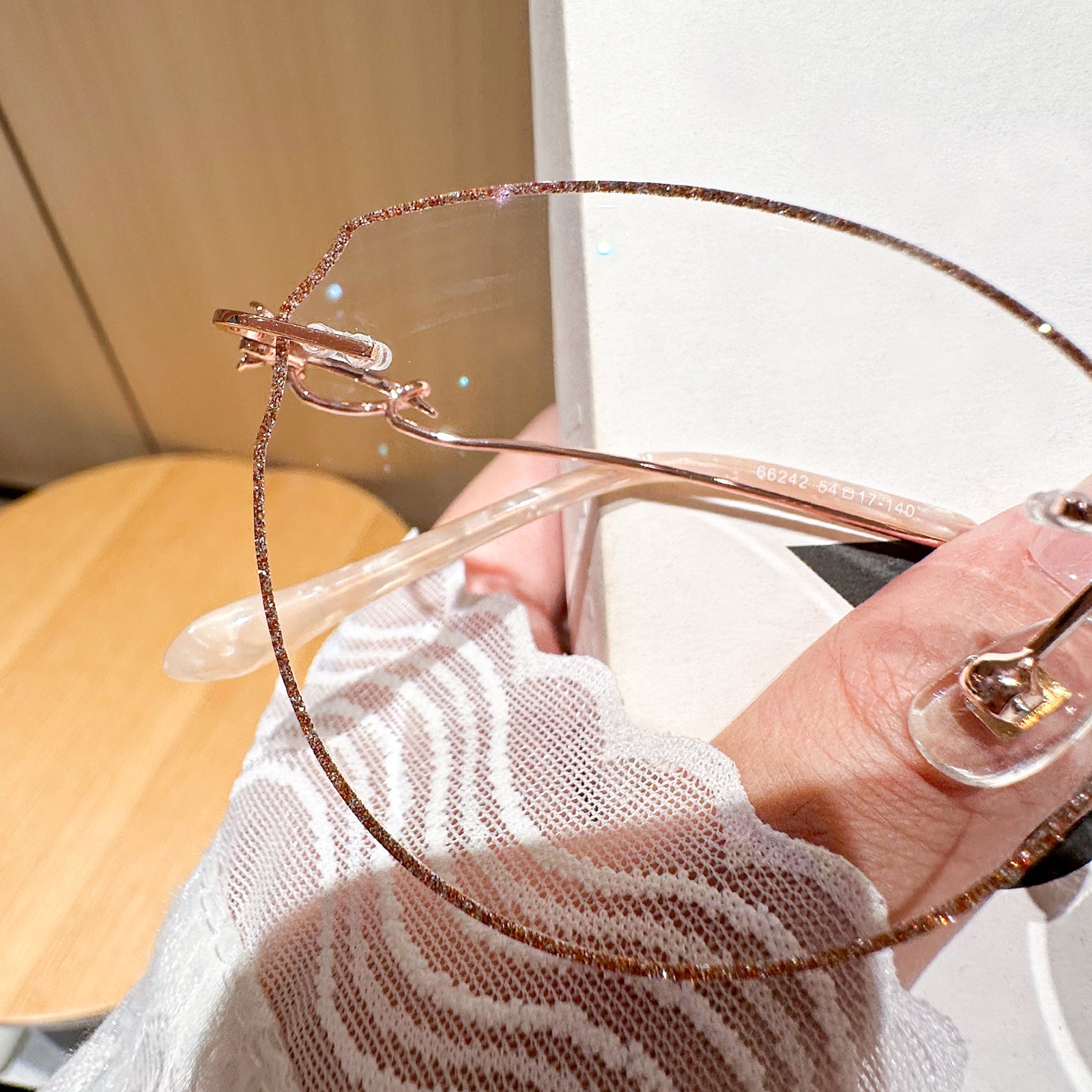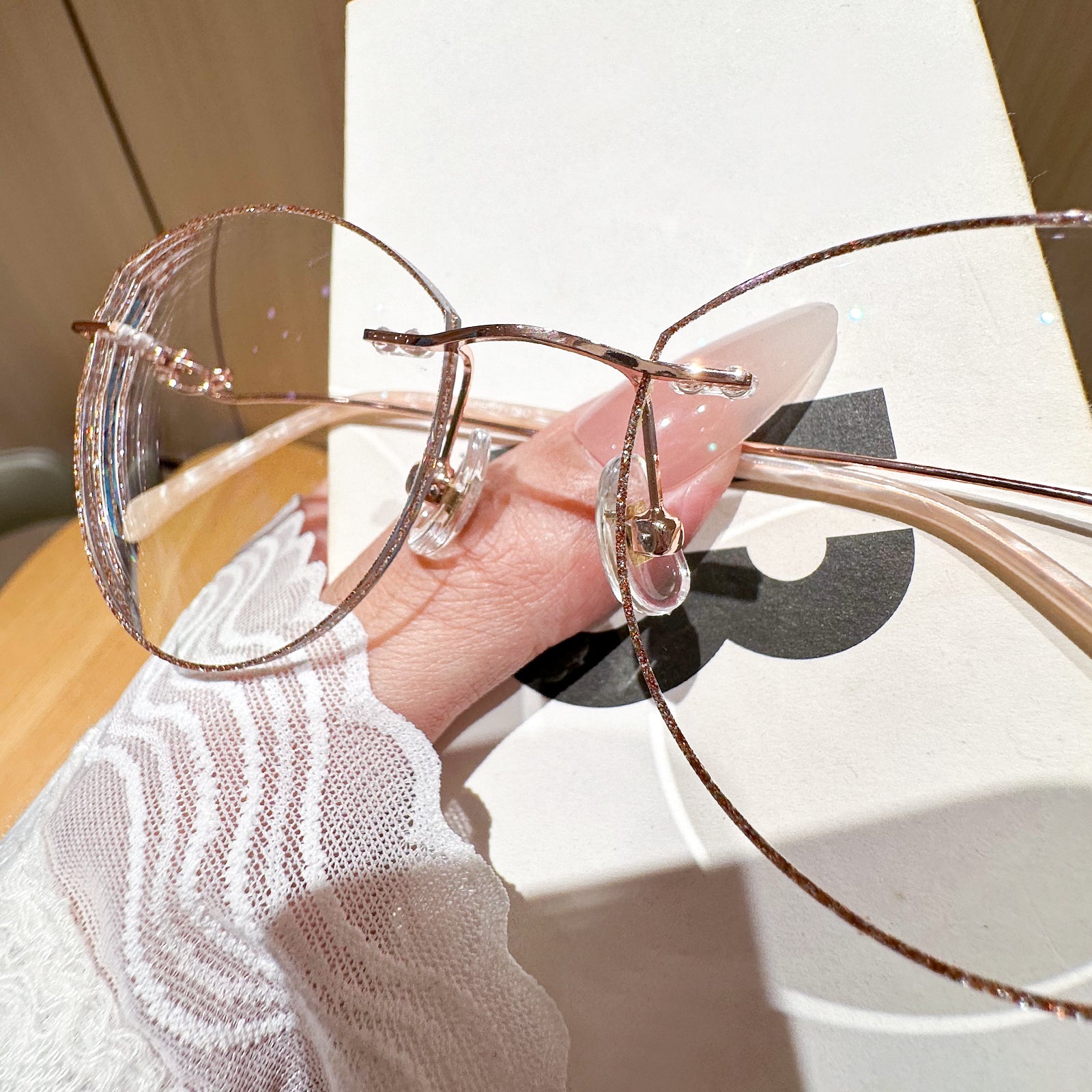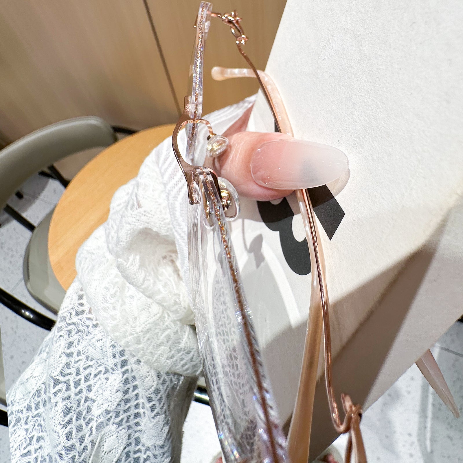 تمتع بالأناقة مع هذه النظارات الأنيقة بدون إطار، والتي تتميز ببريق رقيق على العدسات وزخارف نباتية رقيقة على الصدغ. مصممة للمرأة المتطورة، تضيف هذه الإطارات لمسة من التألق والسحر، مما يجعلها الخيار الأمثل لمظهر رشيق وخالد.