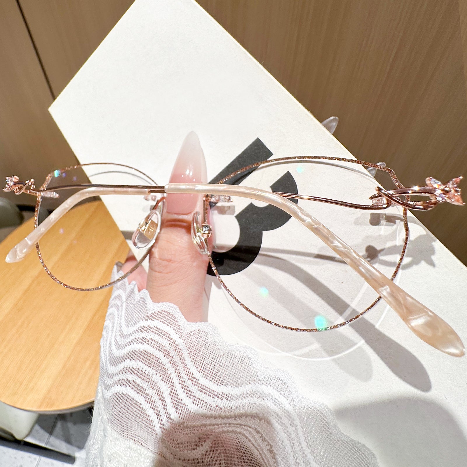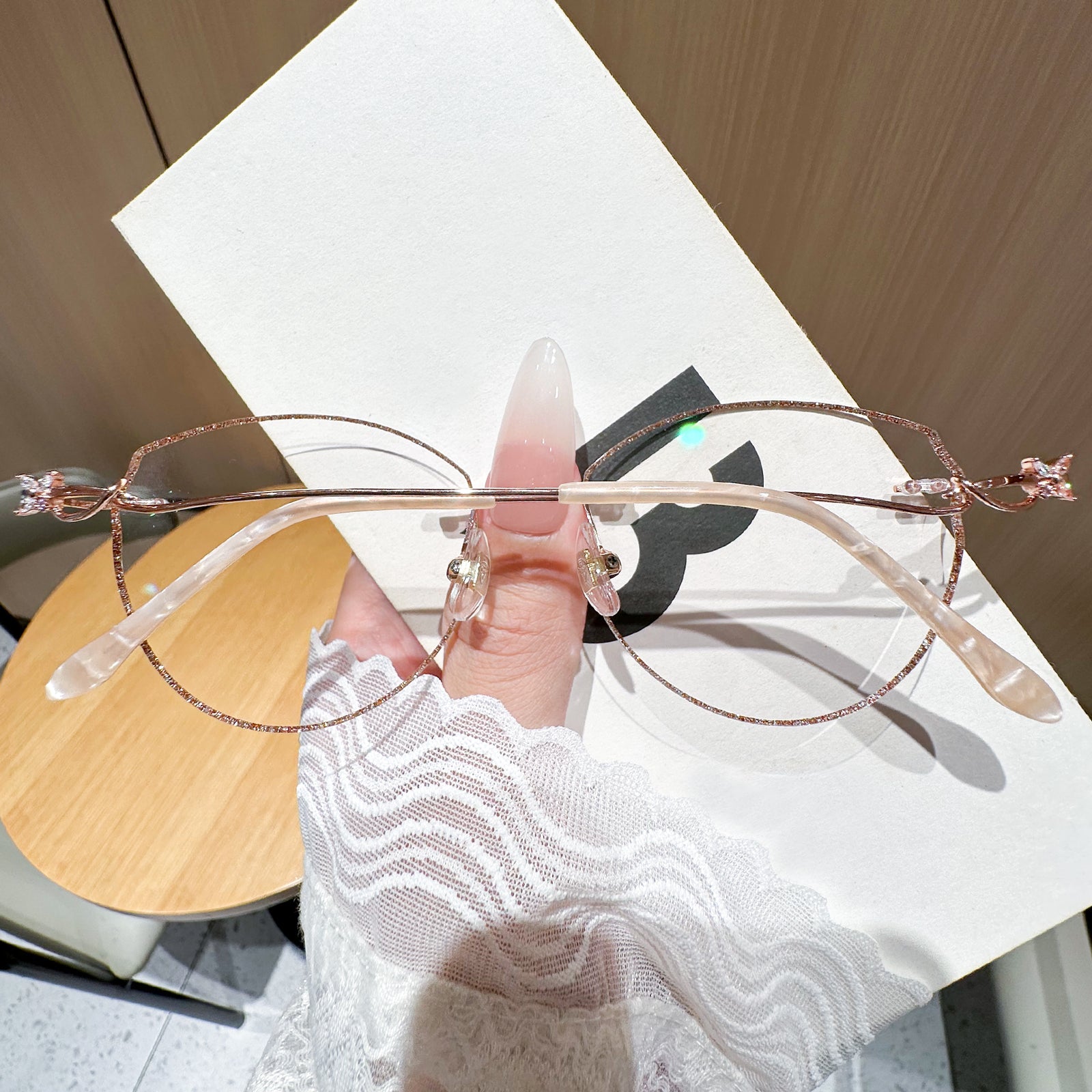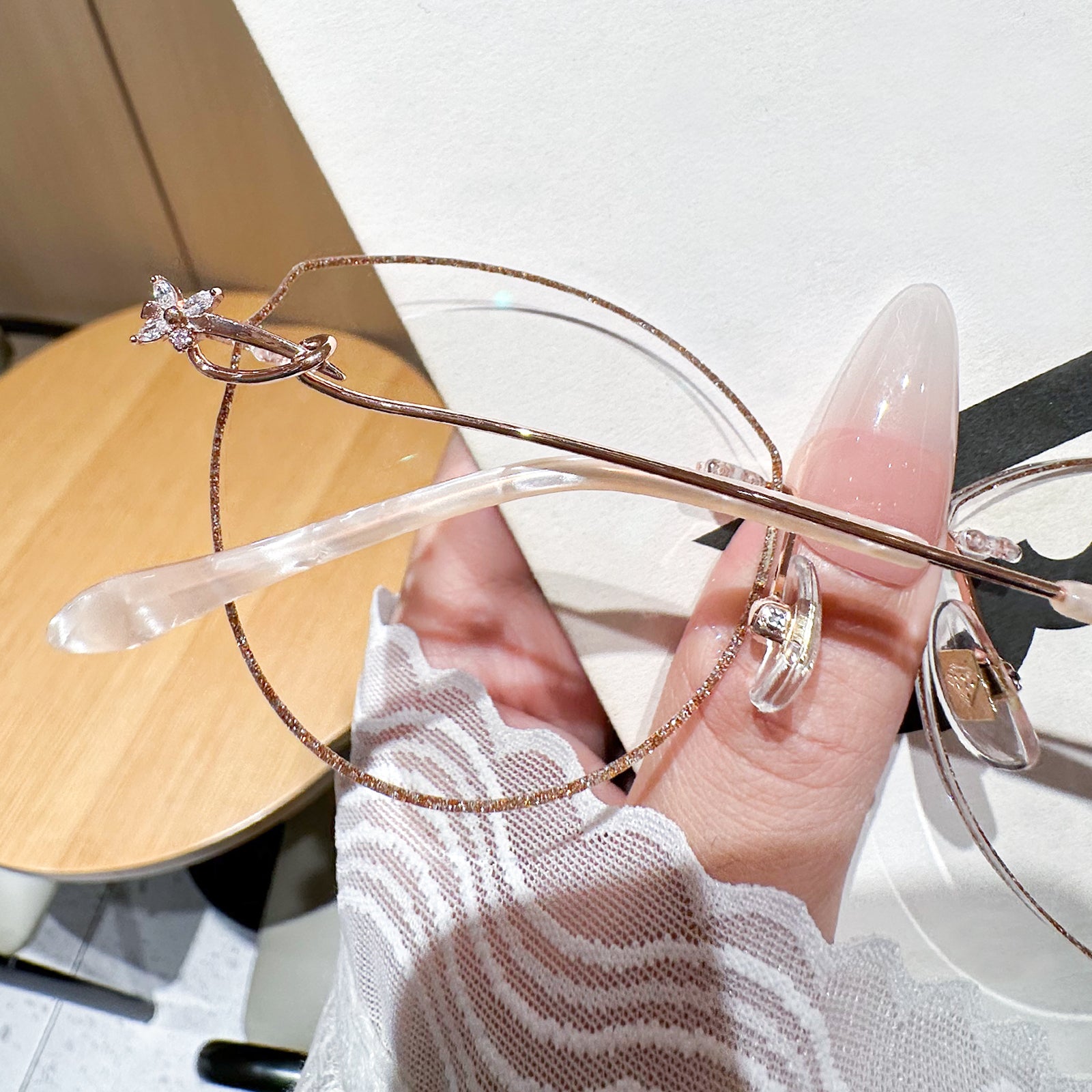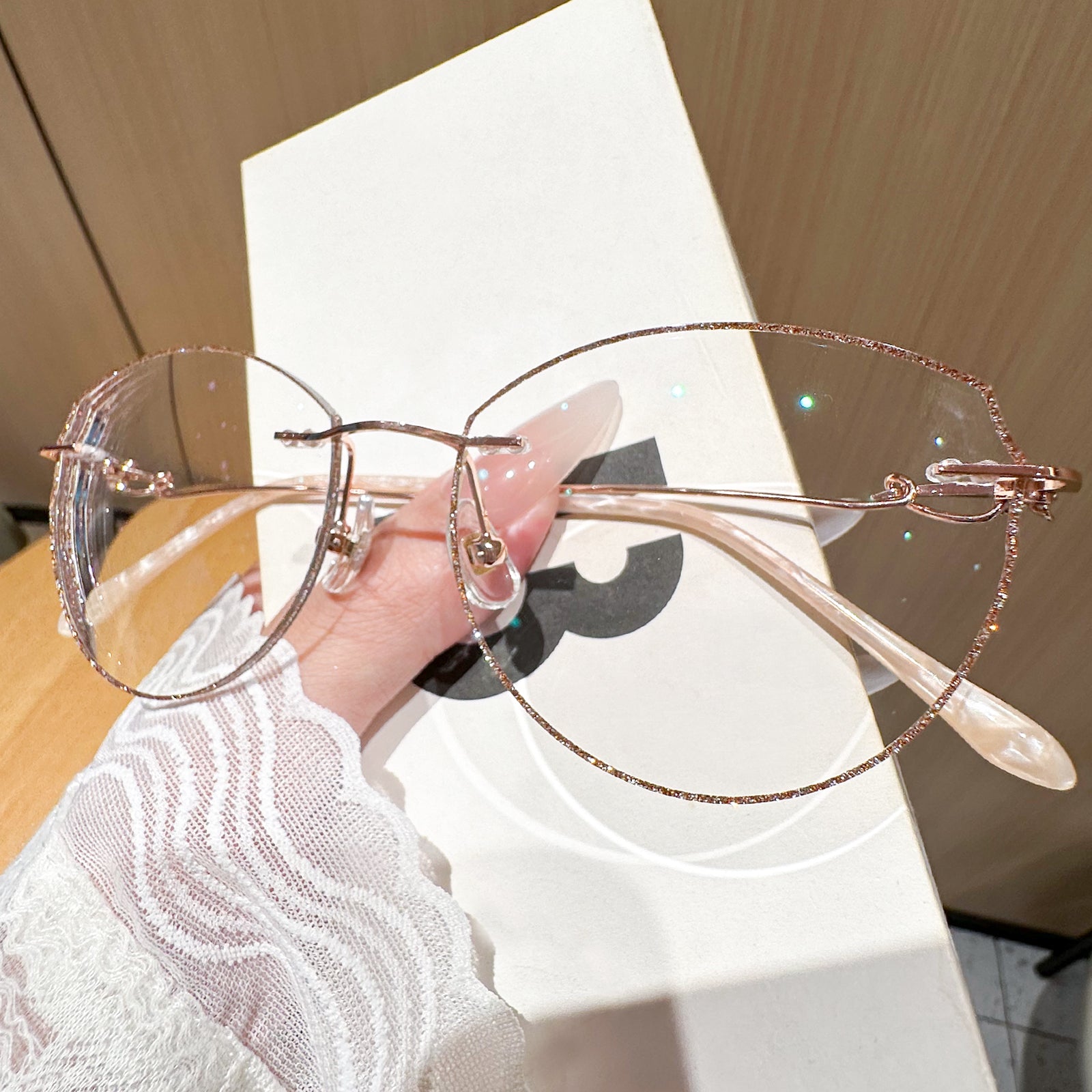تمتع بالأناقة مع هذه النظارات الأنيقة بدون إطار، والتي تتميز ببريق رقيق على العدسات وزخارف نباتية رقيقة على الصدغ. مصممة للمرأة المتطورة، تضيف هذه الإطارات لمسة من التألق والسحر، مما يجعلها الخيار الأمثل لمظهر رشيق وخالد.