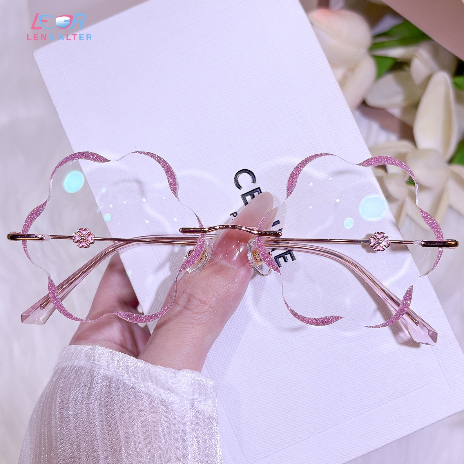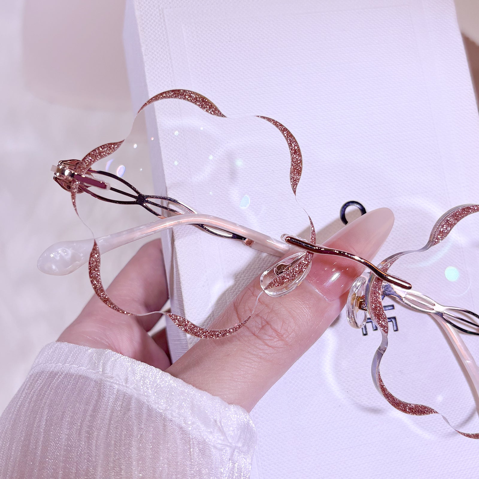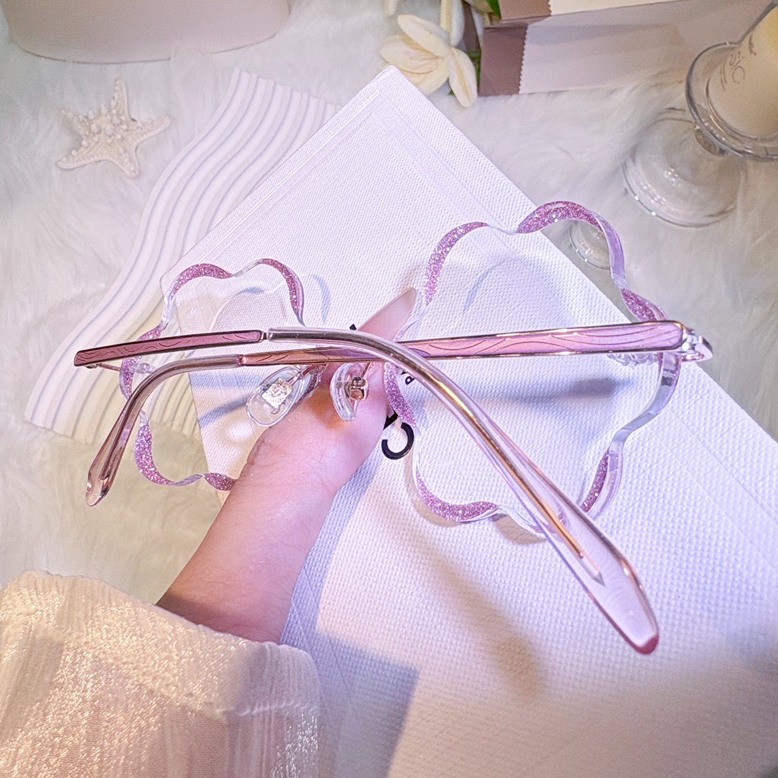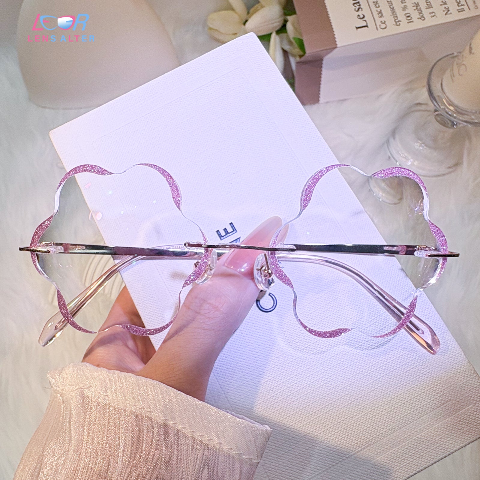 | Exlusive Design | This feminine rimless eyeglass design features dreamy petal-shaped lenses, delicately outlined with shimmering gold glitter for an enchanting sparkle. The metal temples are adorned with charming little flower accents, adding a sweet and whimsical touch. Light, elegant, and full of personality — perfect for those who love a playful yet graceful statement.