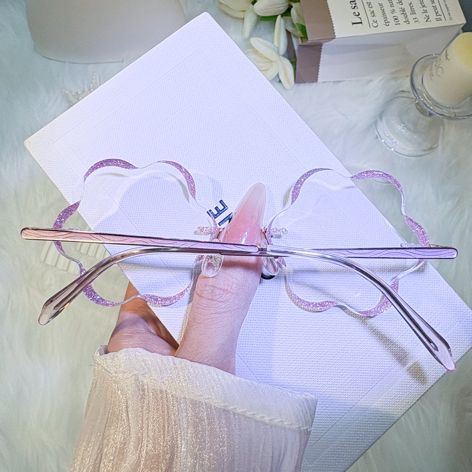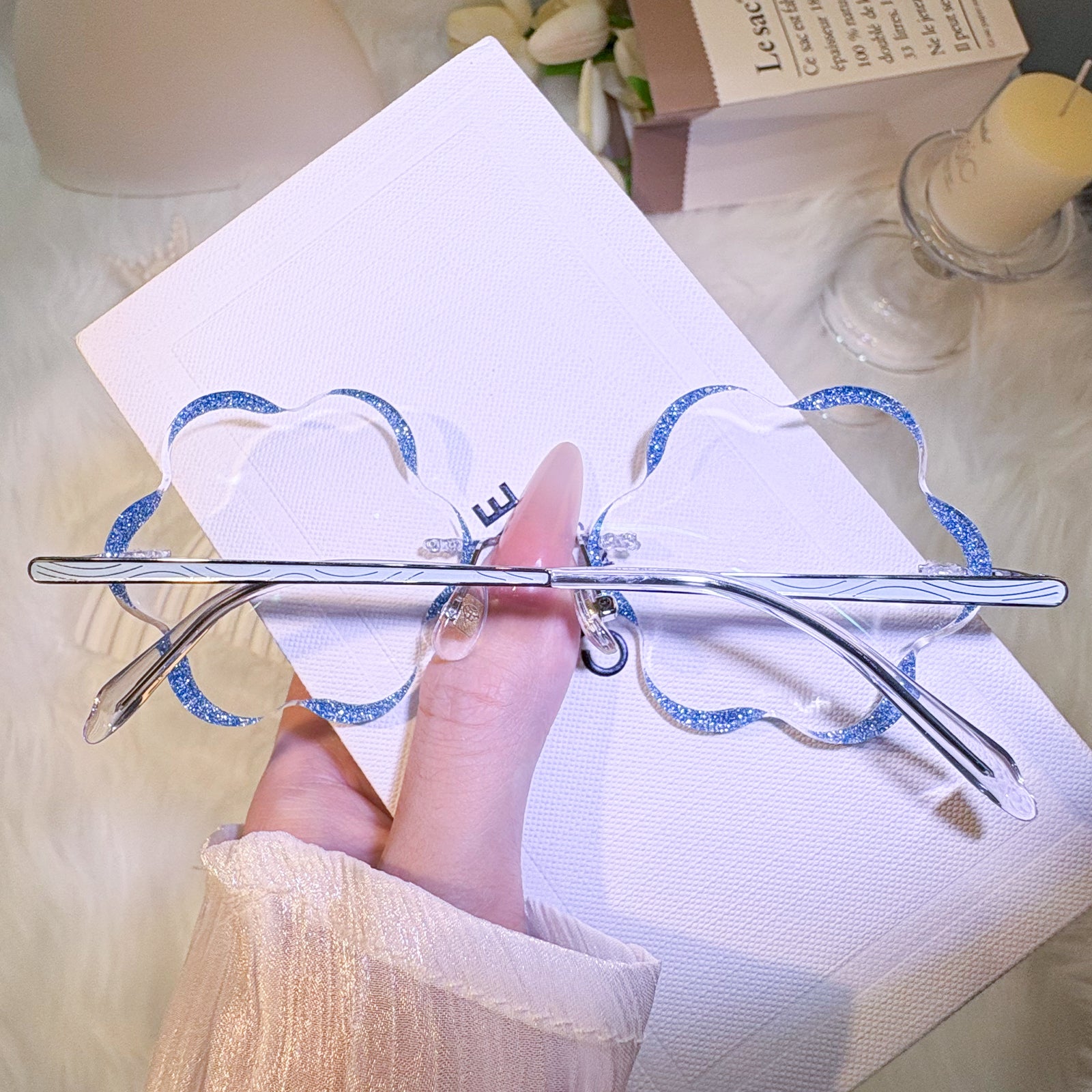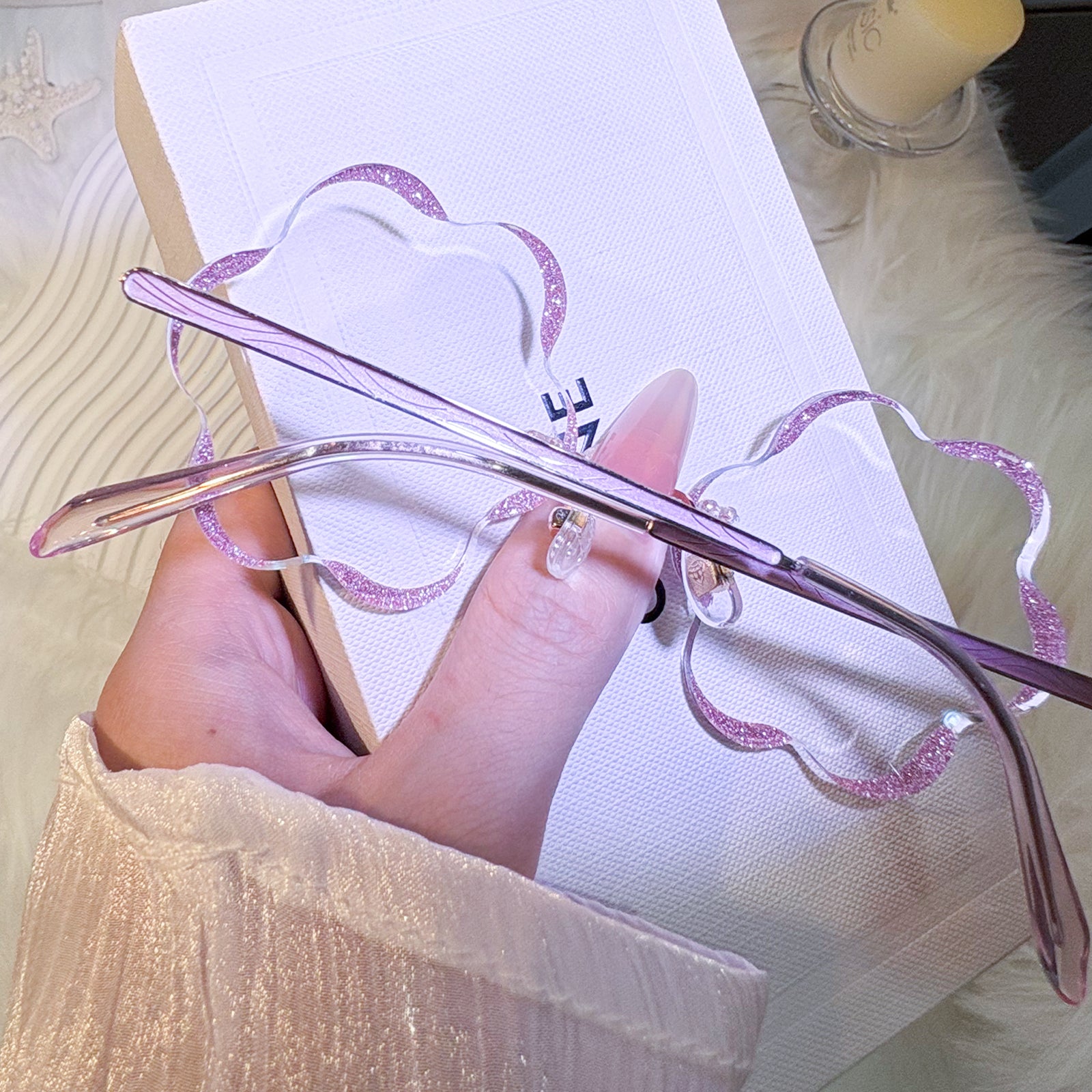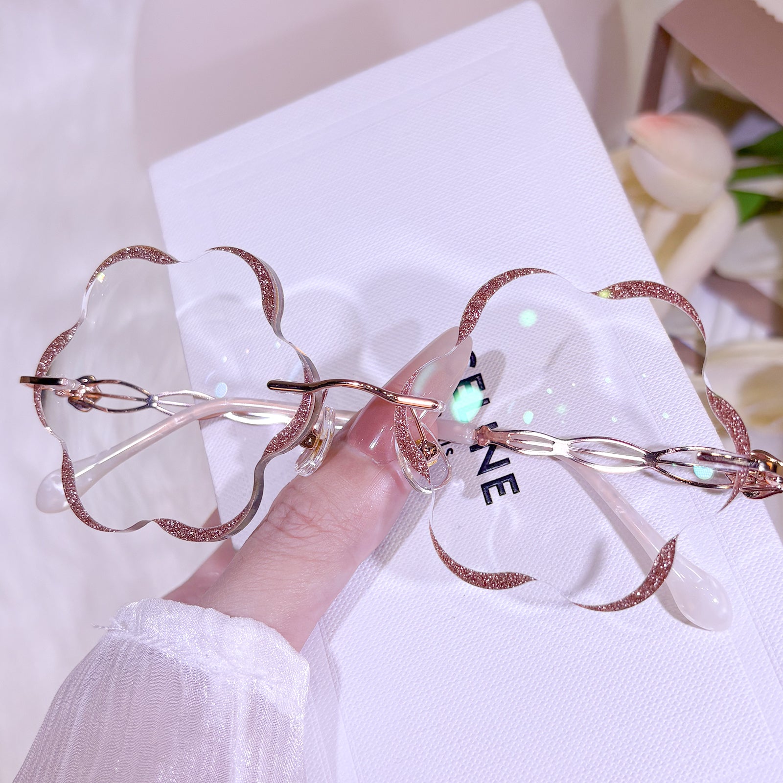 | Exlusive Design | This feminine rimless eyeglass design features dreamy petal-shaped lenses, delicately outlined with shimmering gold glitter for an enchanting sparkle. The metal temples are adorned with charming little flower accents, adding a sweet and whimsical touch. Light, elegant, and full of personality — perfect for those who love a playful yet graceful statement.
