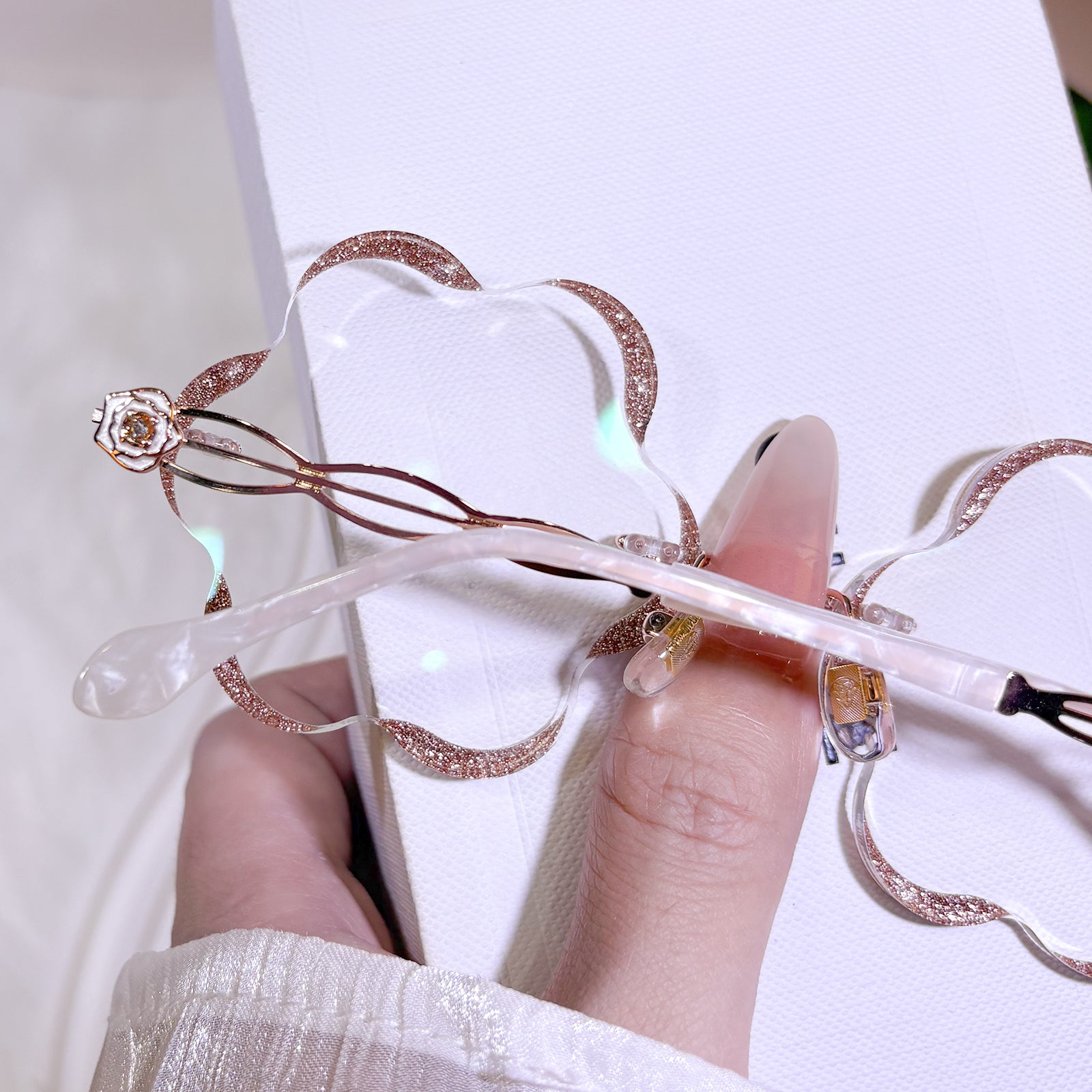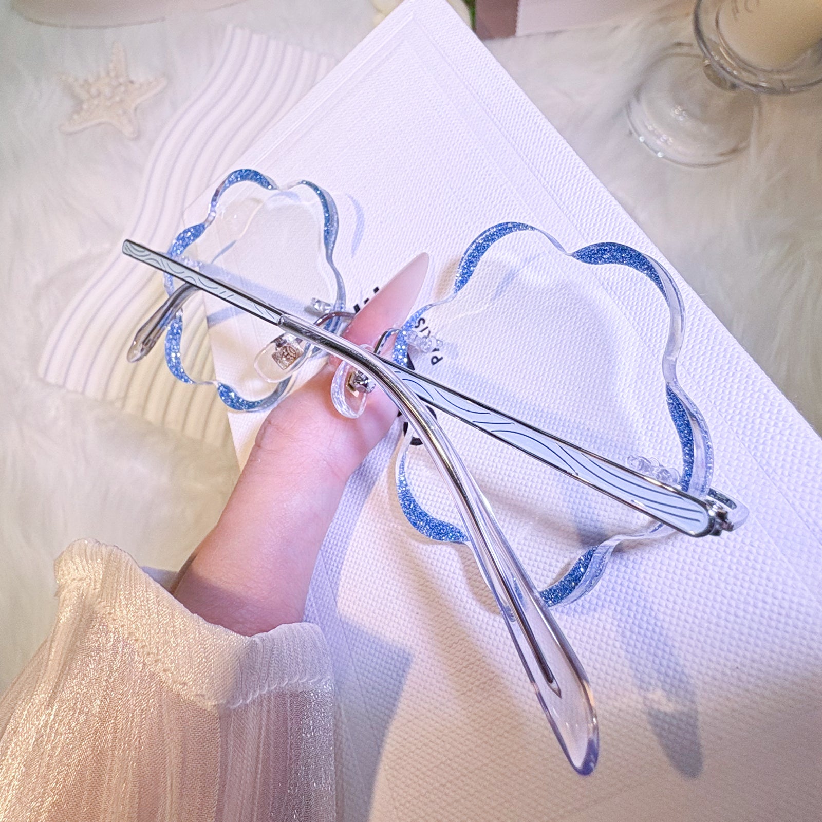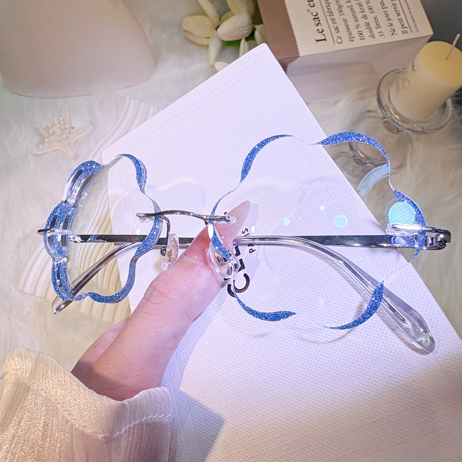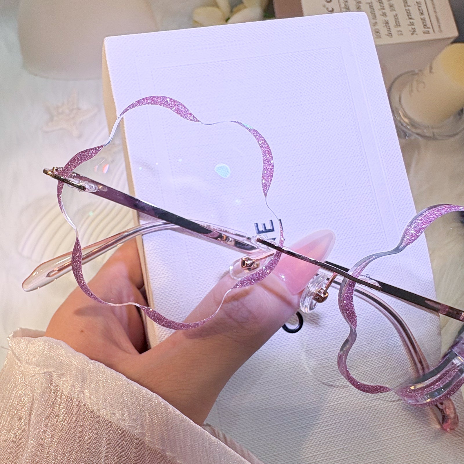 | Exlusive Design | This feminine rimless eyeglass design features dreamy petal-shaped lenses, delicately outlined with shimmering gold glitter for an enchanting sparkle. The metal temples are adorned with charming little flower accents, adding a sweet and whimsical touch. Light, elegant, and full of personality — perfect for those who love a playful yet graceful statement.