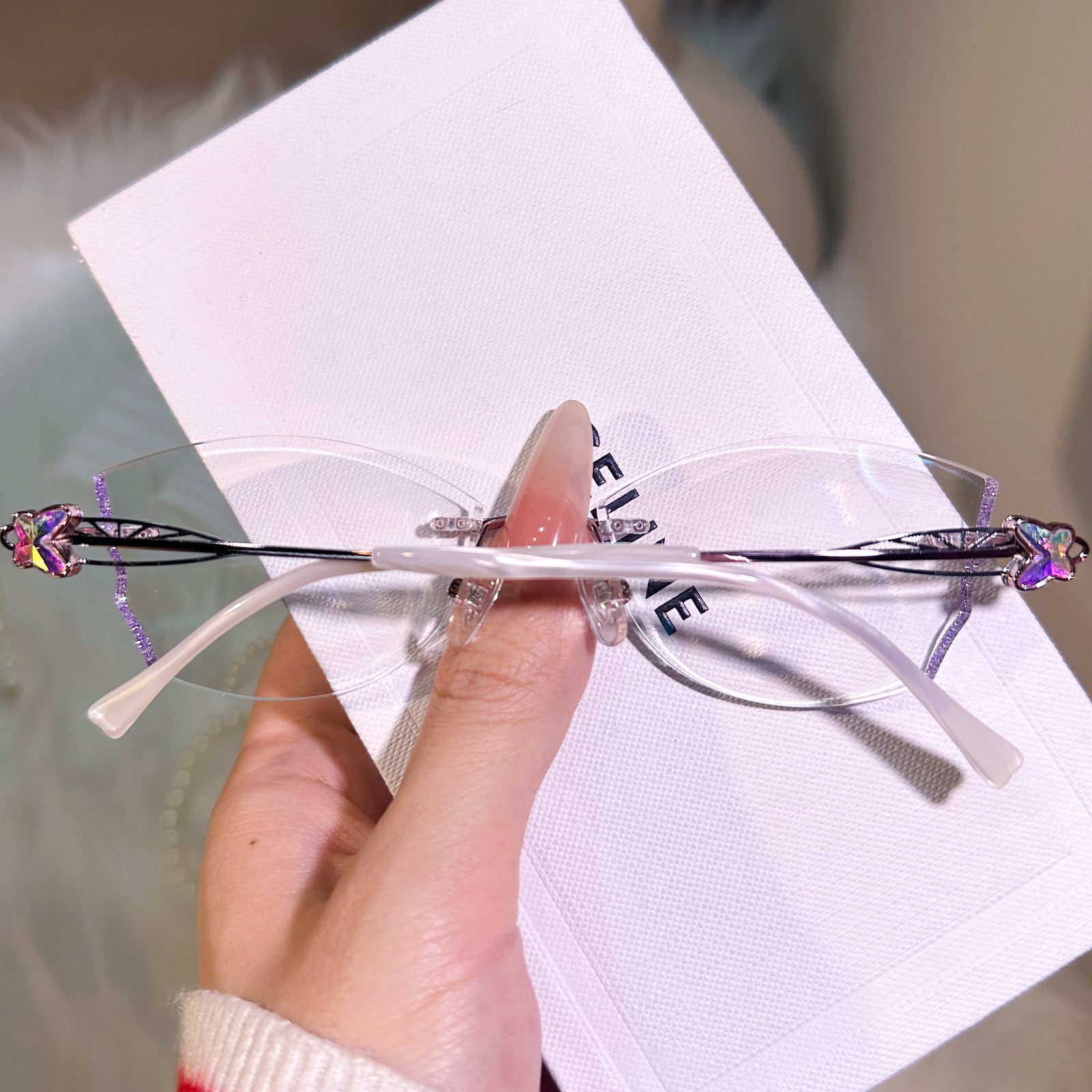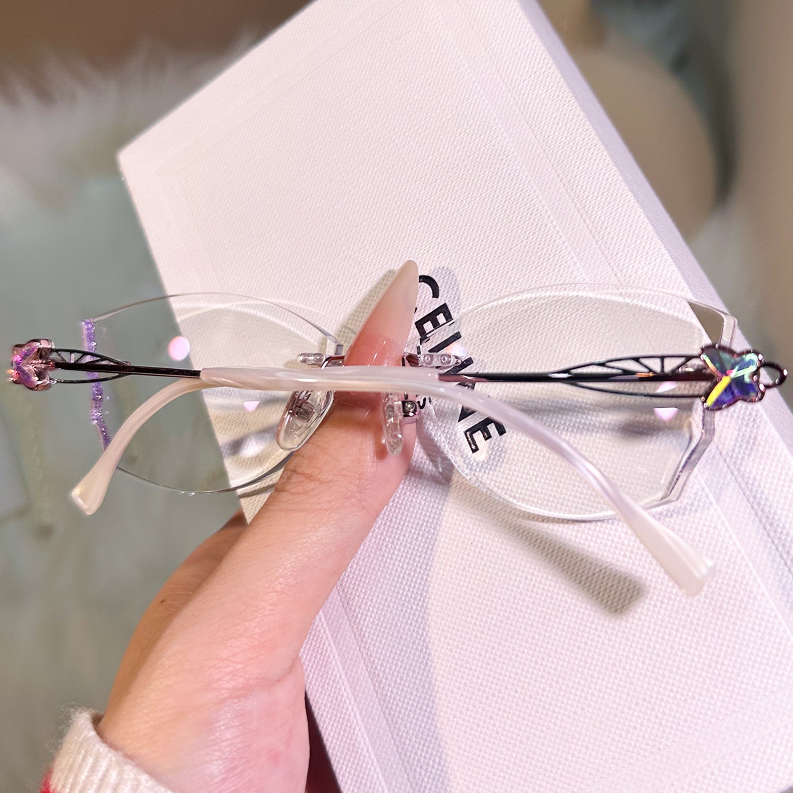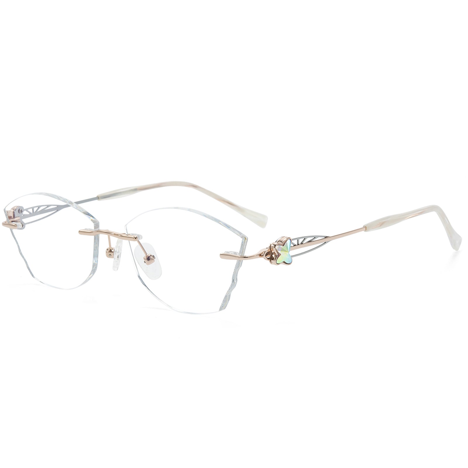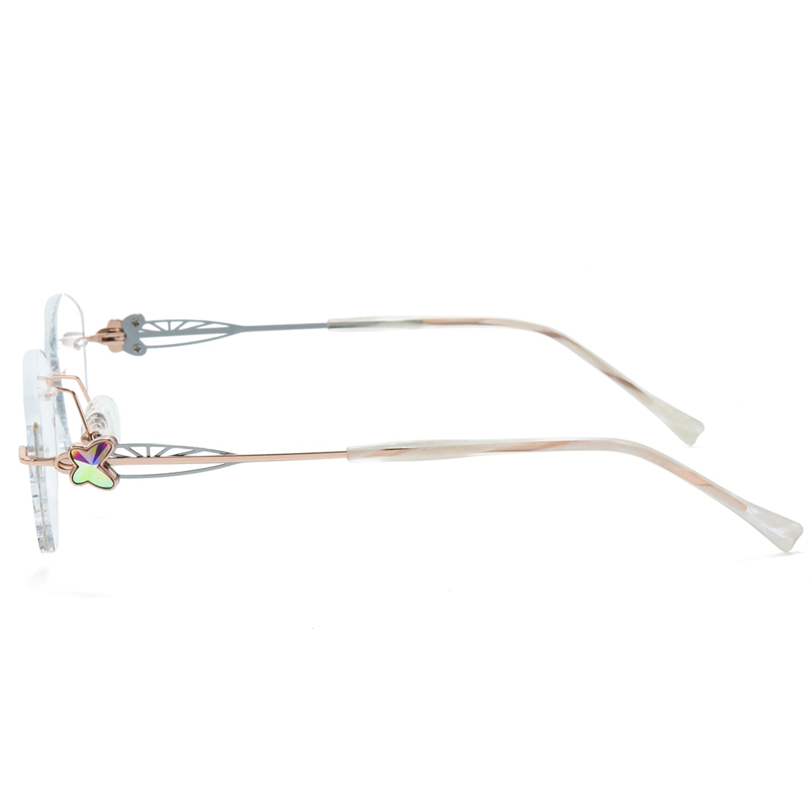 Dazzling rimless glasses feature glitter-infused lenses and sparkling butterfly accents on the temples. A perfect blend of elegance and charm, they add a touch of magic to any look.