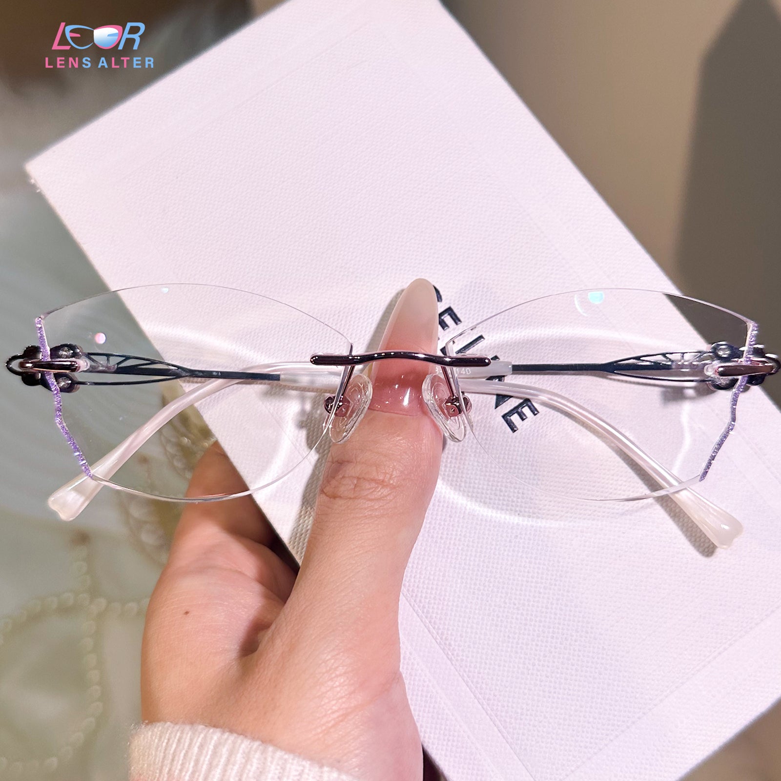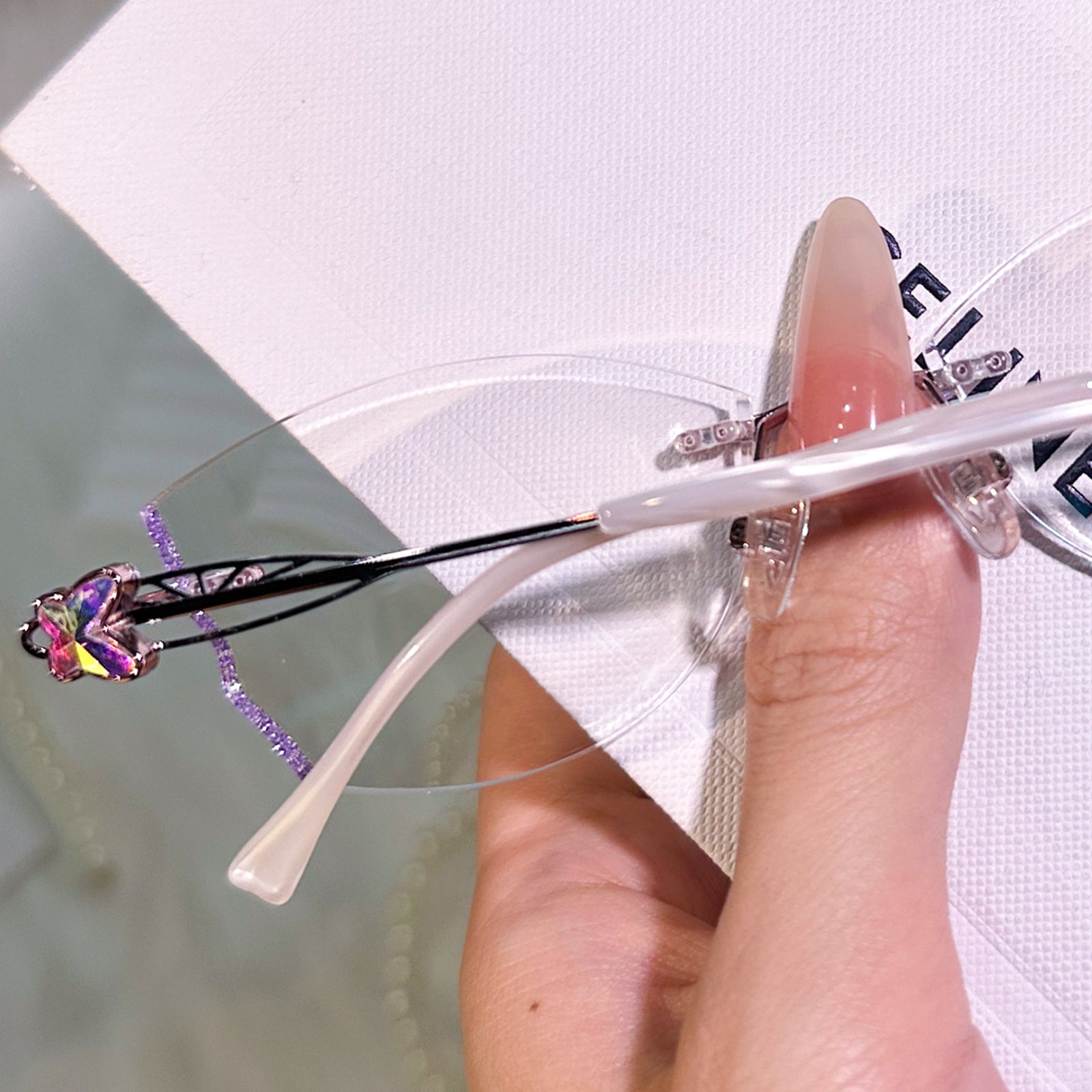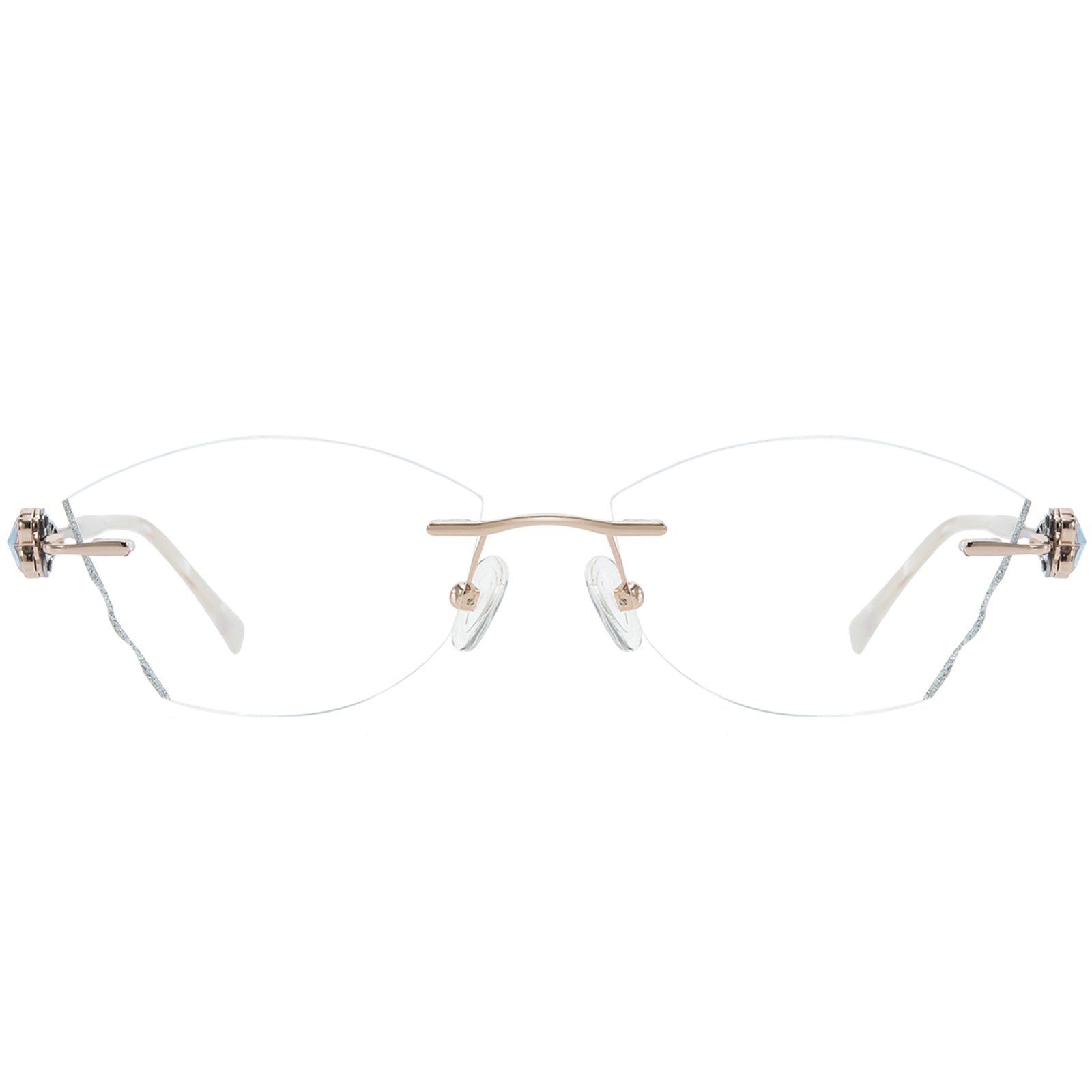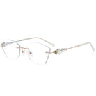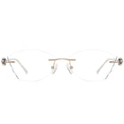 Dazzling rimless glasses feature glitter-infused lenses and sparkling butterfly accents on the temples. A perfect blend of elegance and charm, they add a touch of magic to any look.