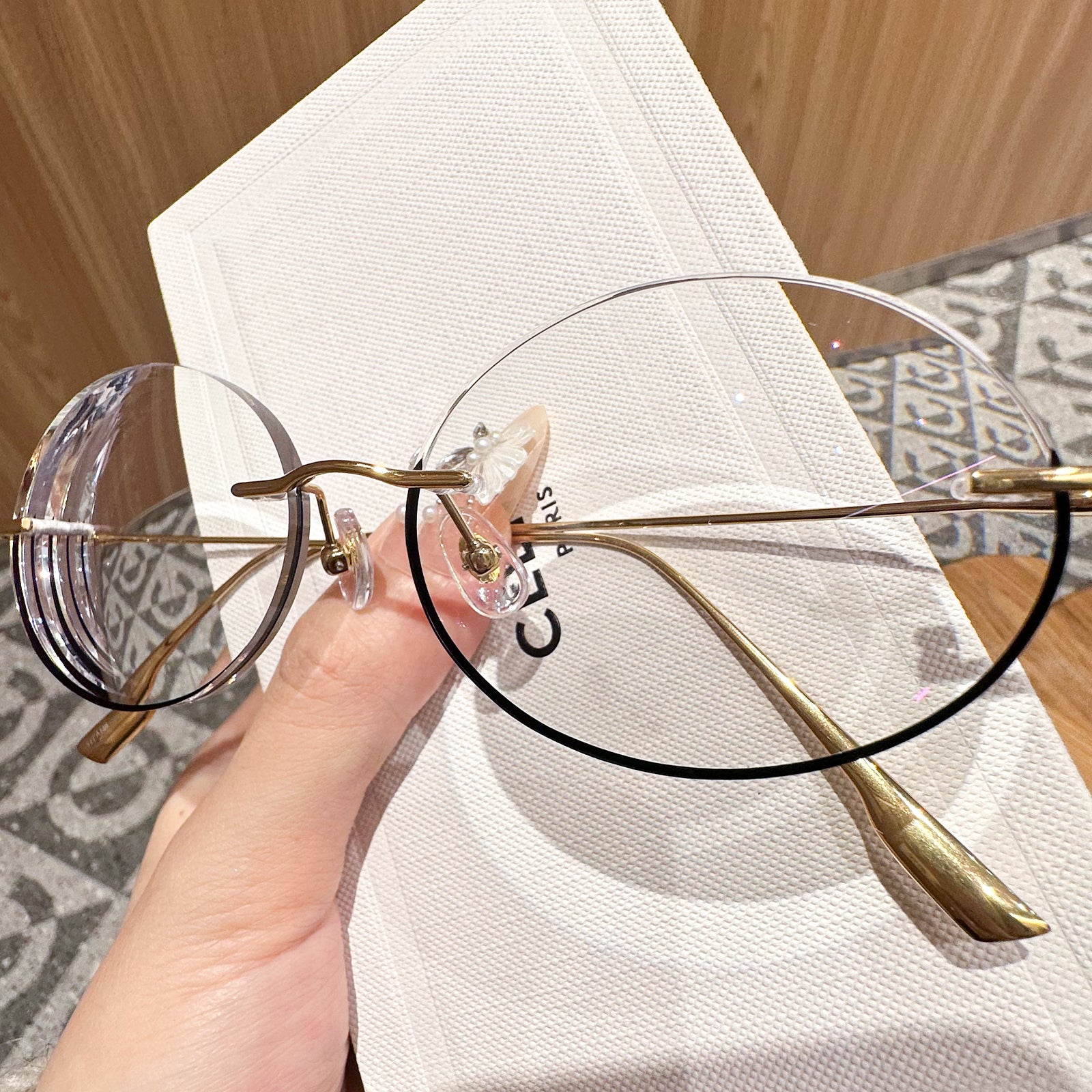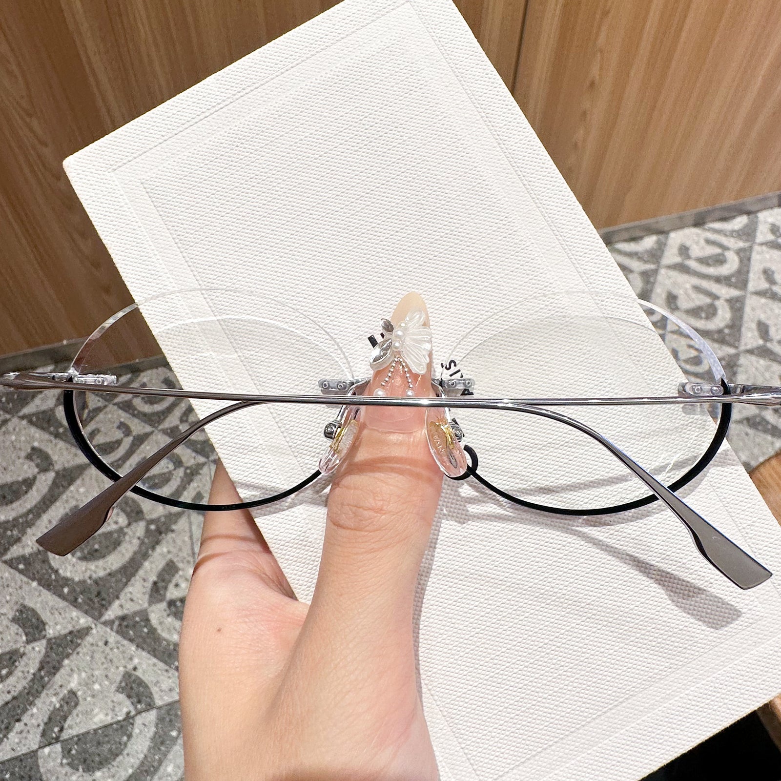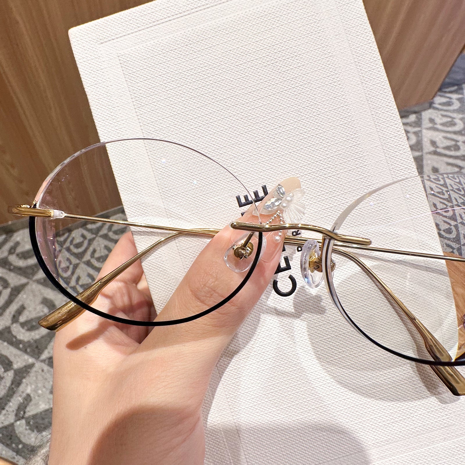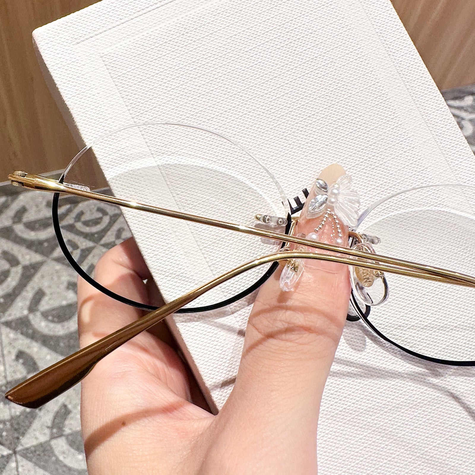 These oval rimless glasses feature a unique half-black rim design on the lenses, paired with sleek and refined temples for a sophisticated yet understated look. Perfect for those who appreciate subtle elegance!