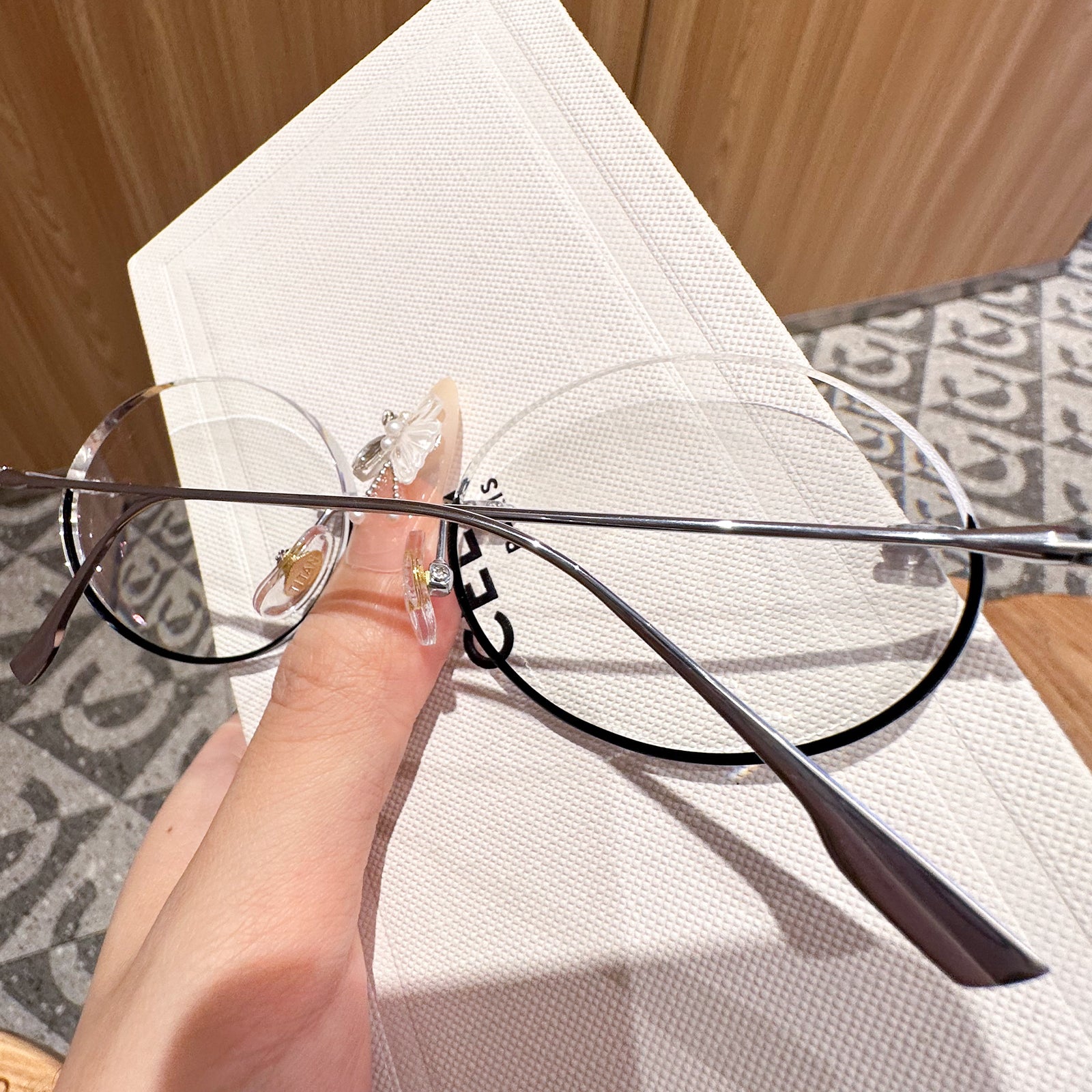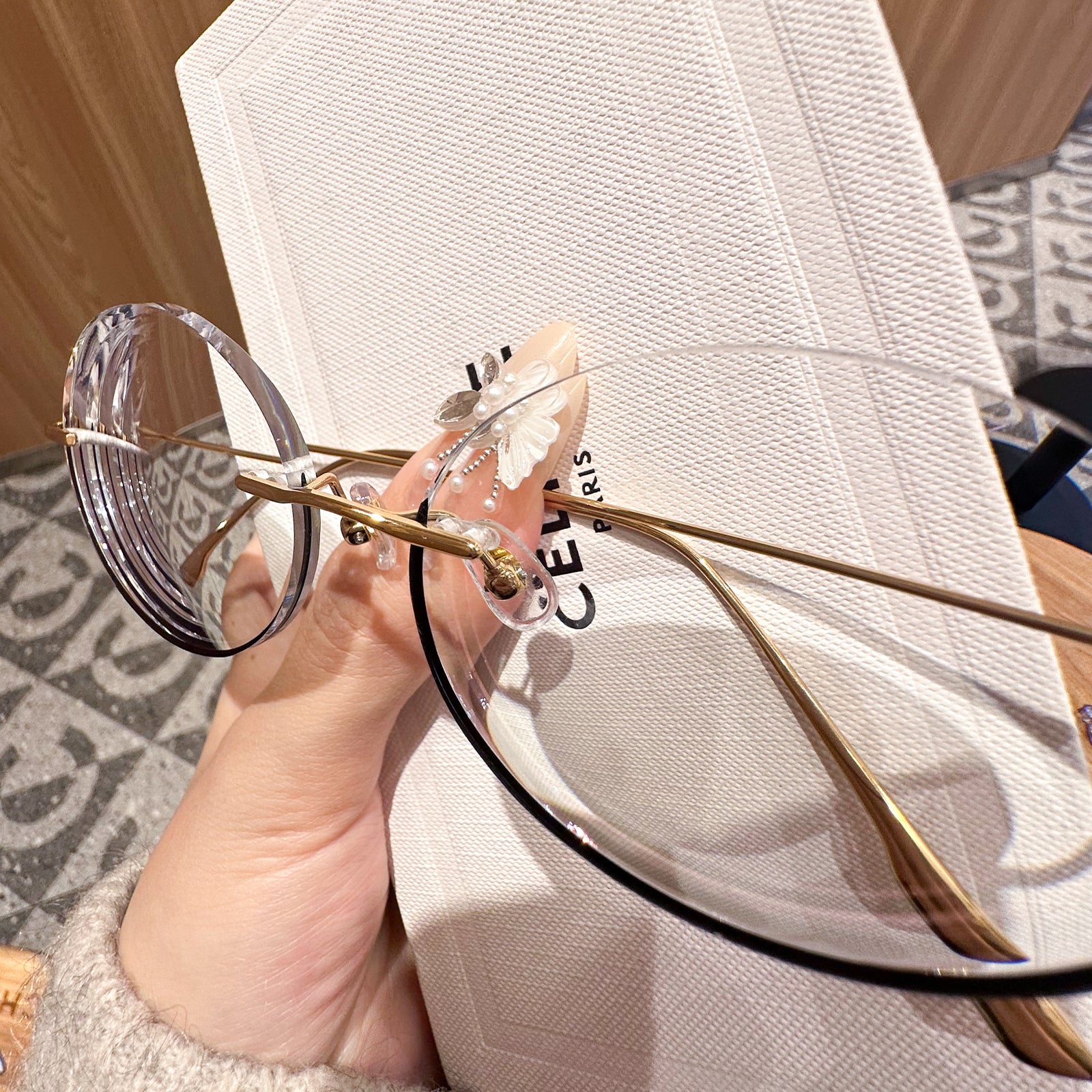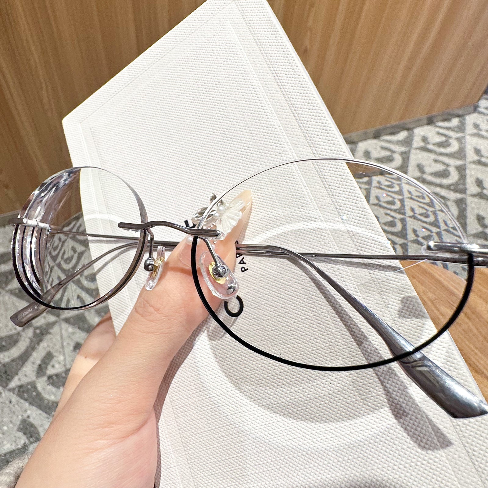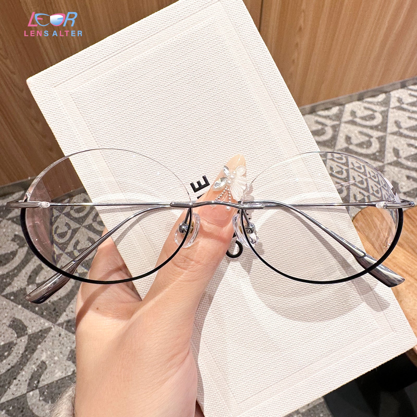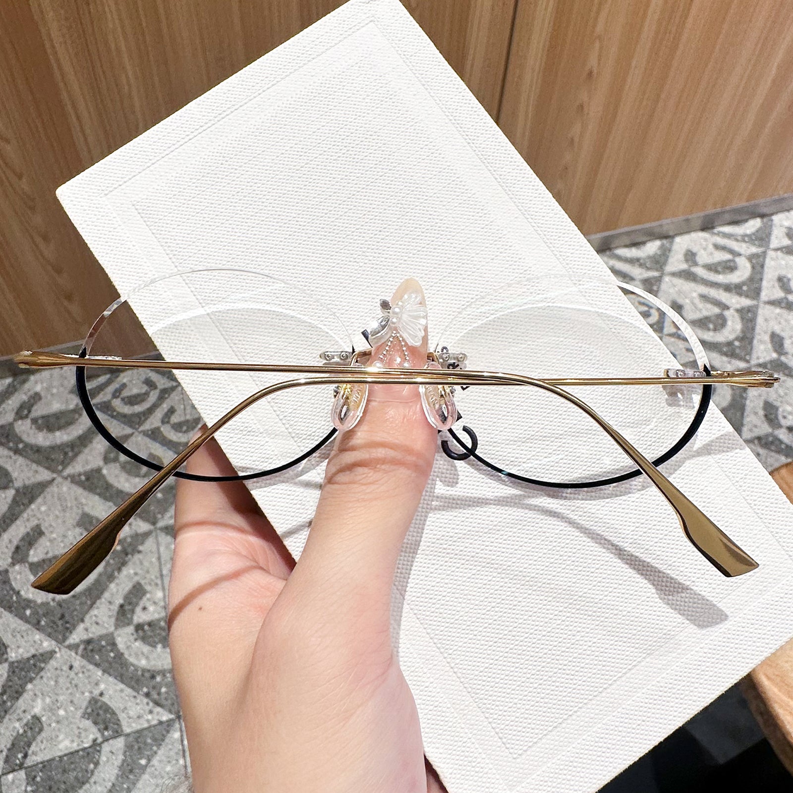 These oval rimless glasses feature a unique half-black rim design on the lenses, paired with sleek and refined temples for a sophisticated yet understated look. Perfect for those who appreciate subtle elegance!
