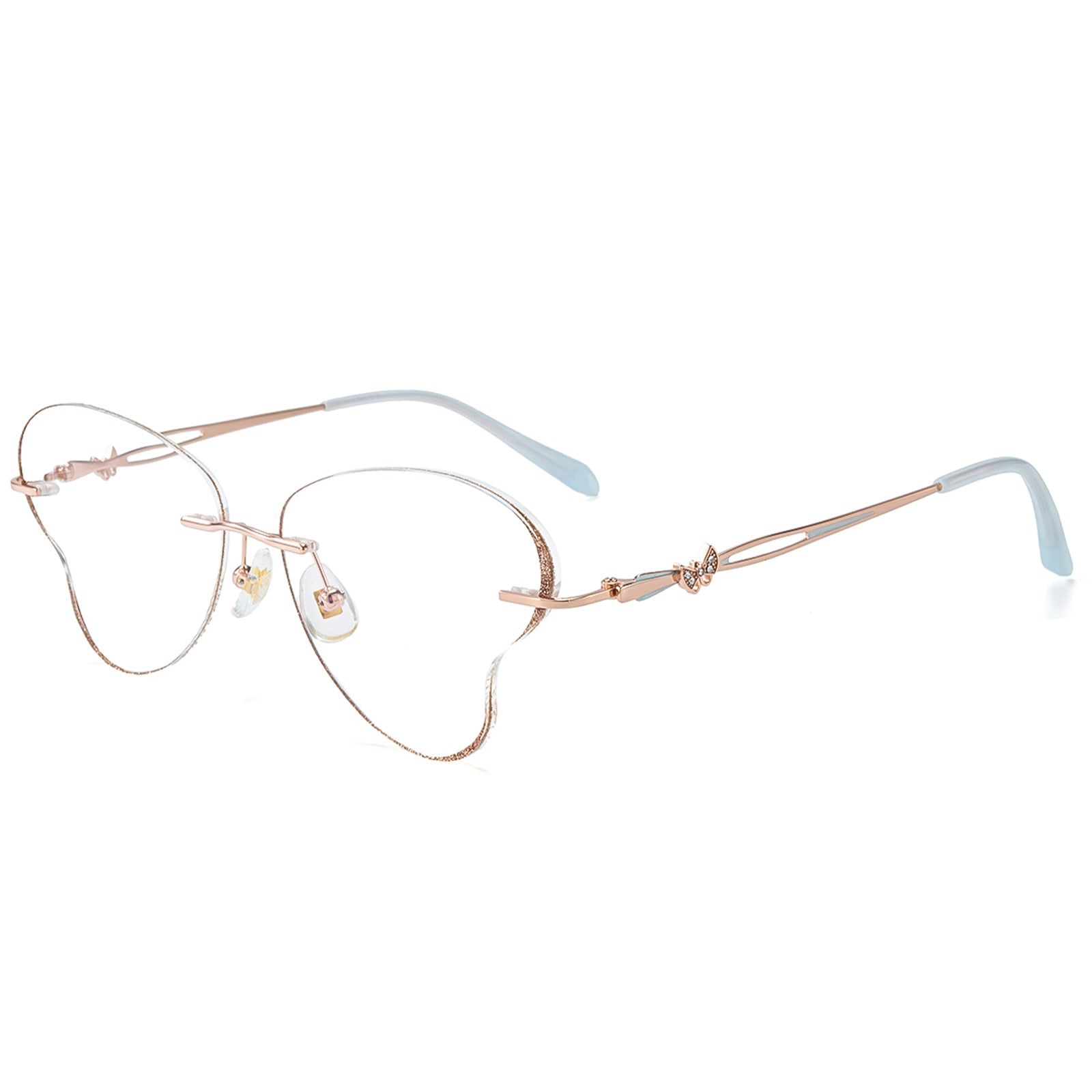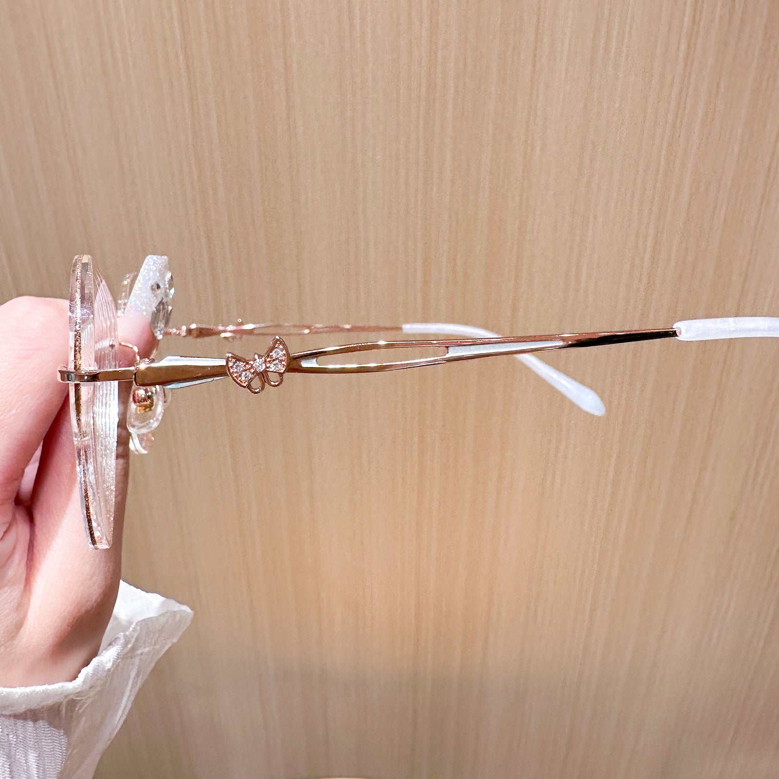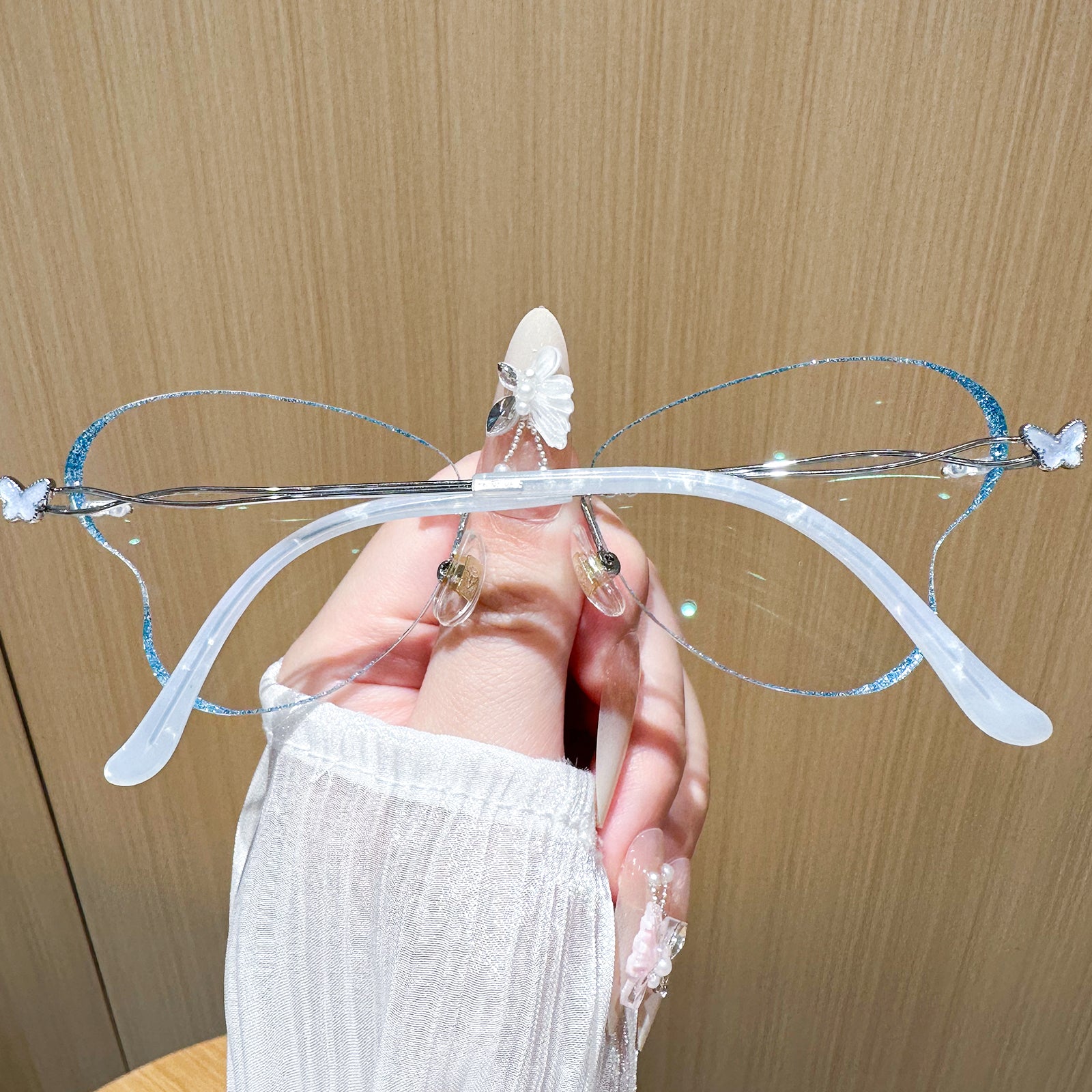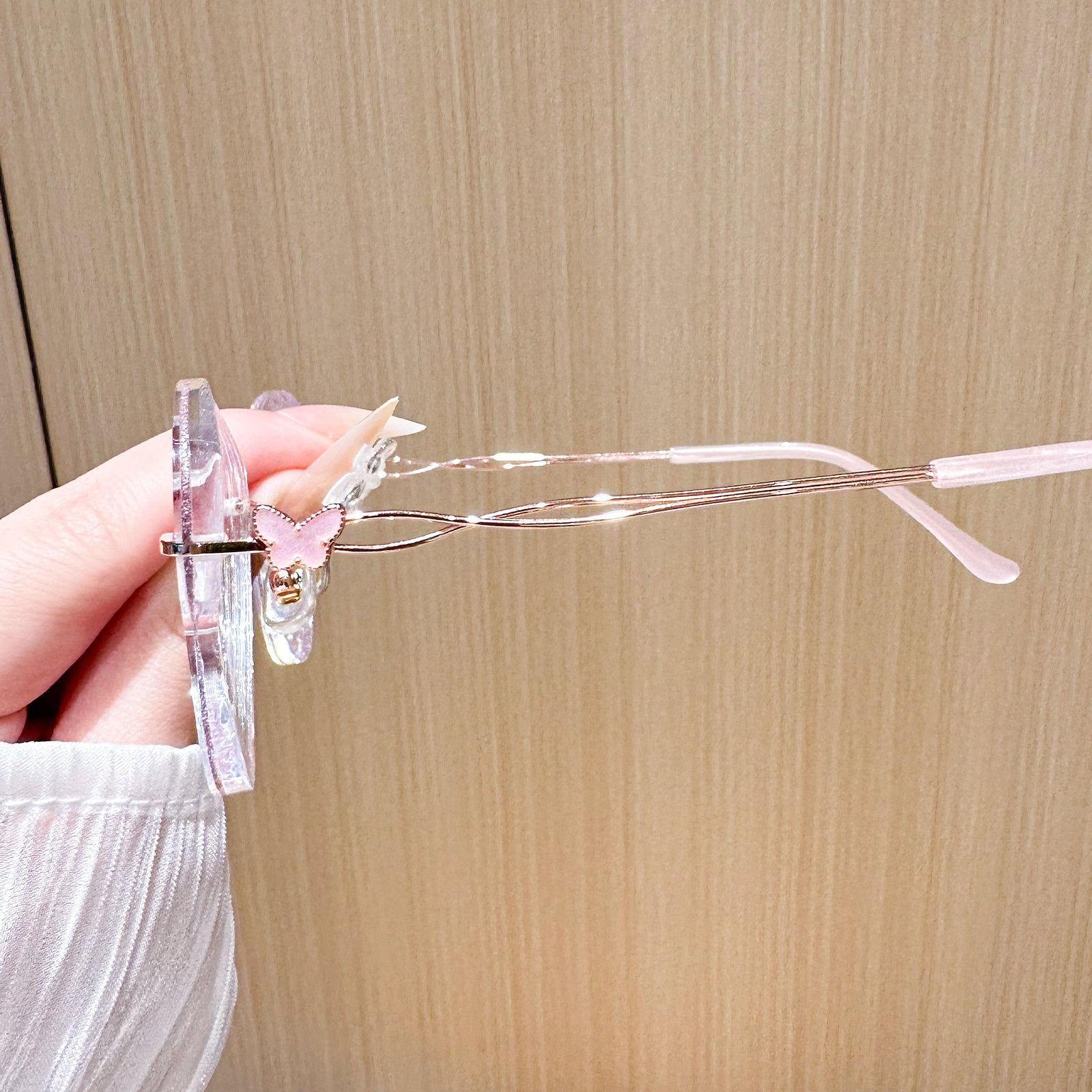 تم تزيين العدسات الفريدة على شكل فراشة بمسحوق ذهبي مبهر عند الذيل، مما يخلق تأثيرًا مذهلاً. تم تزيين الأذرع بشكل جميل بأنماط الفراشة المعقدة، مما يضيف لمسة إضافية من الأناقة. تحدث عن نظارات الفراشة الخاصة بنا.