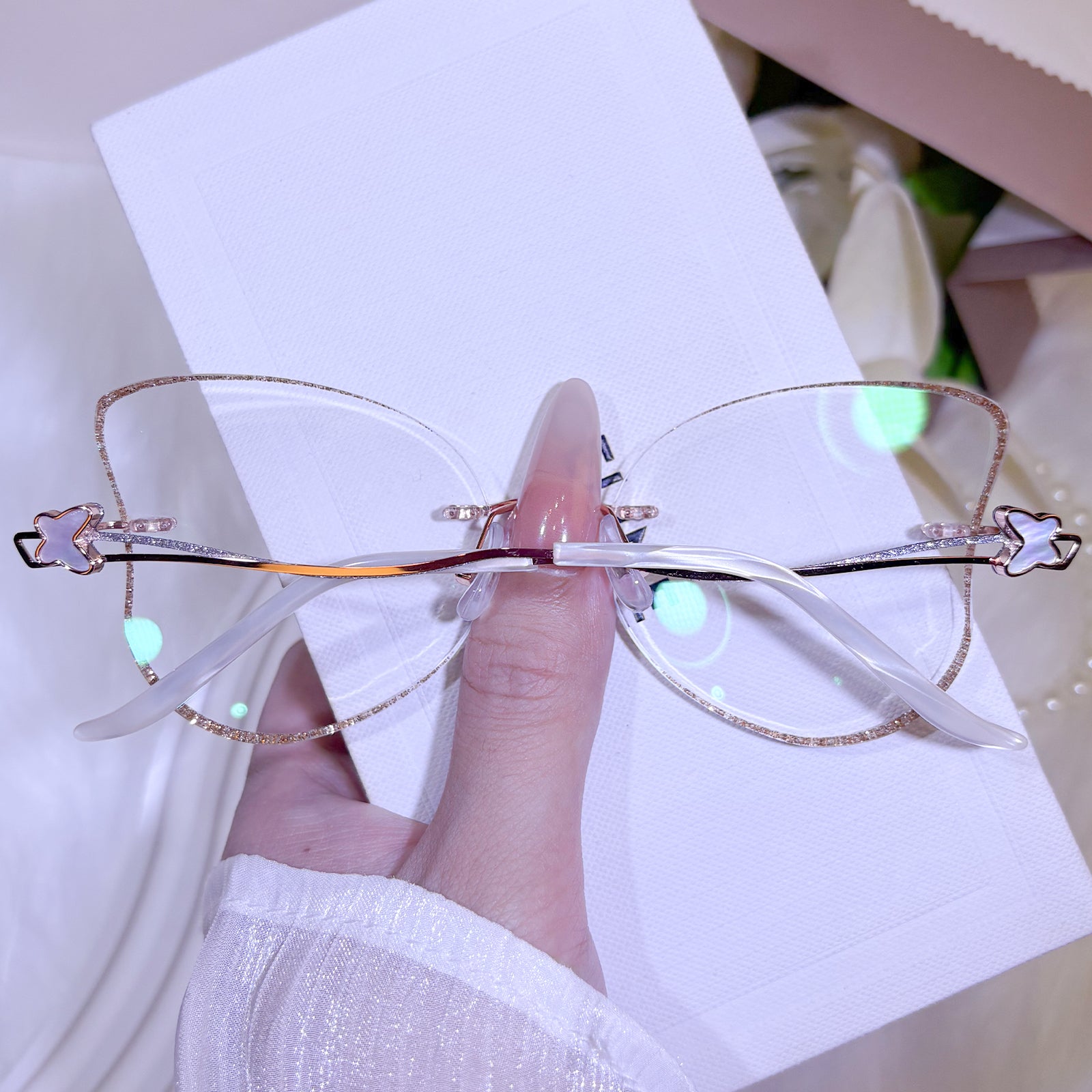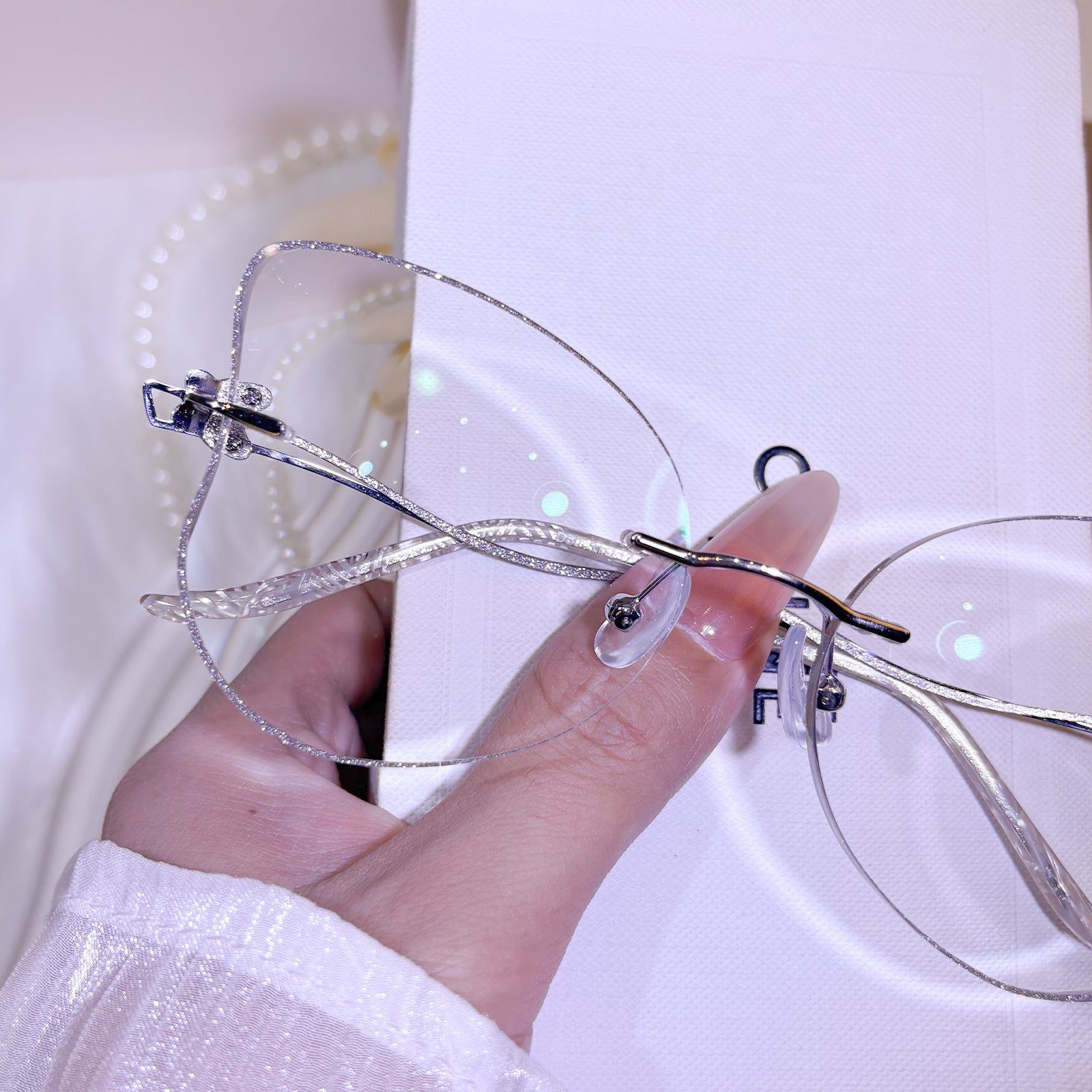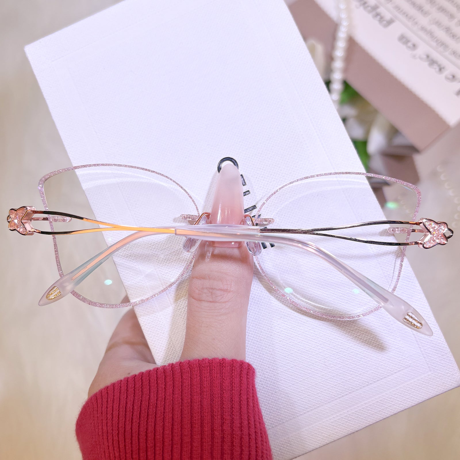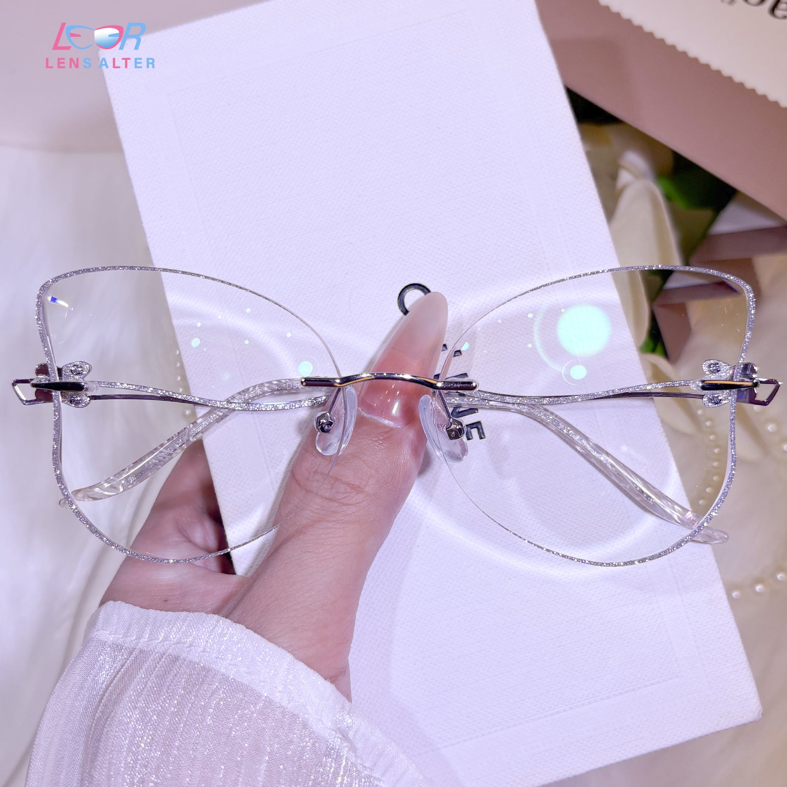 | Exclusive Design | This adorable chubby-butterfly rimless eyewear is designed to shimmer from every angle. The butterfly-shaped lenses are dusted with sparkling glitter that catches the light beautifully, creating an eye-catching, dreamy effect. Delicate butterfly accents on the temples enhance the overall elegance and detail, while the lightweight construction ensures comfortable everyday wear.