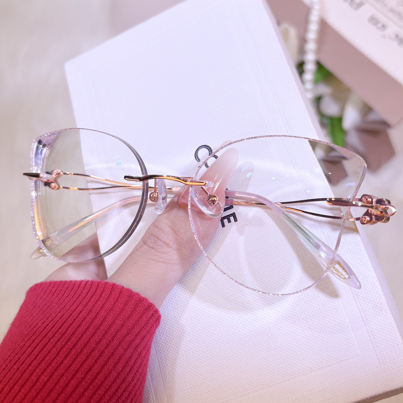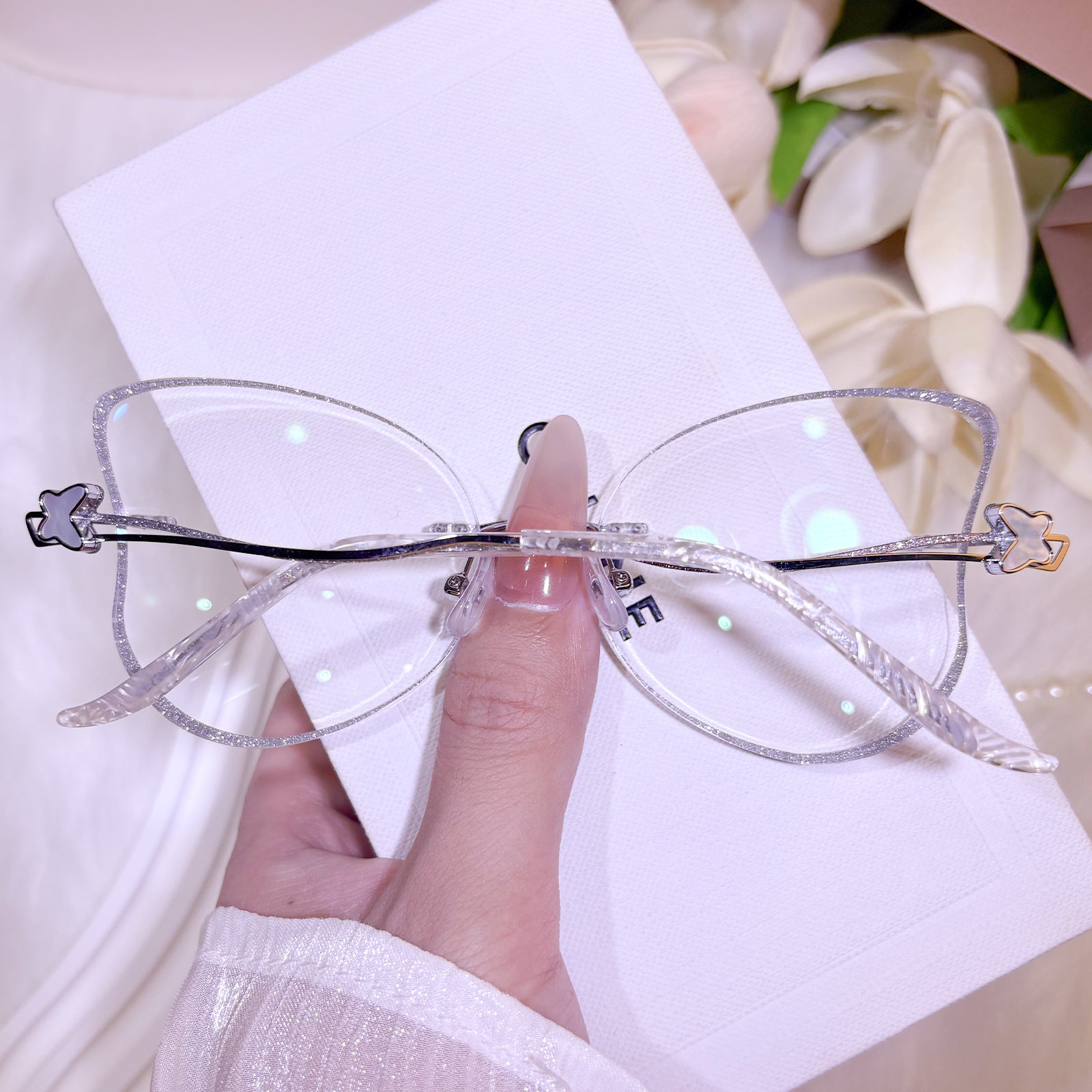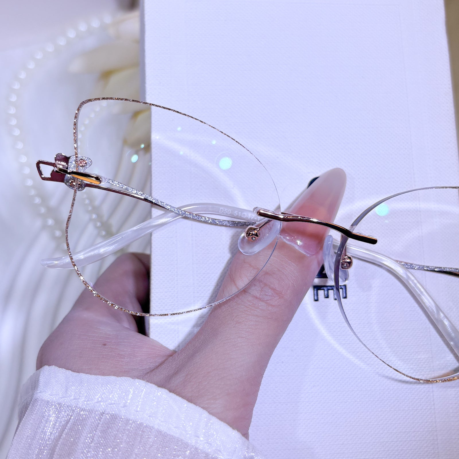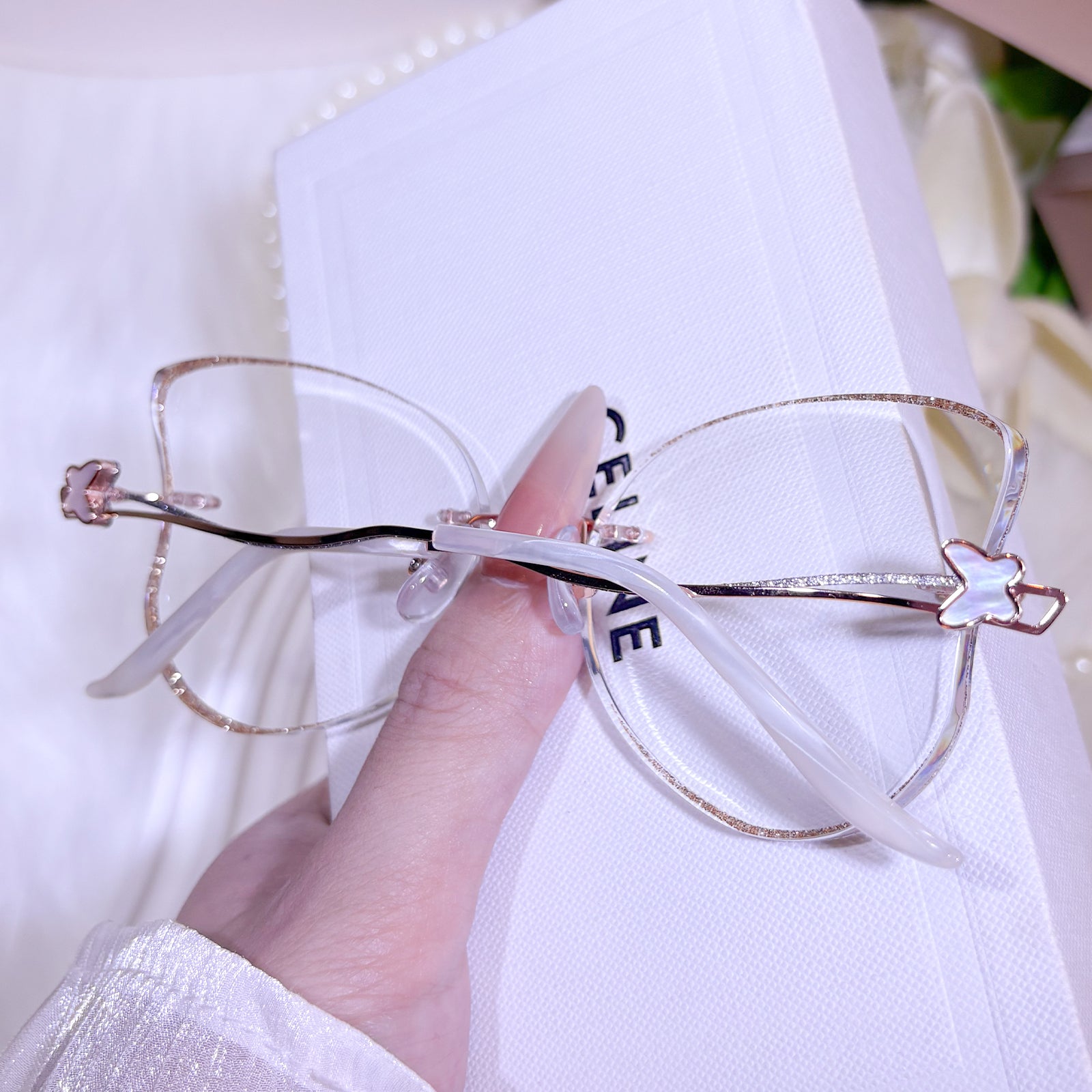| Exclusive Design | This adorable chubby-butterfly rimless eyewear is designed to shimmer from every angle. The butterfly-shaped lenses are dusted with sparkling glitter that catches the light beautifully, creating an eye-catching, dreamy effect. Delicate butterfly accents on the temples enhance the overall elegance and detail, while the lightweight construction ensures comfortable everyday wear.