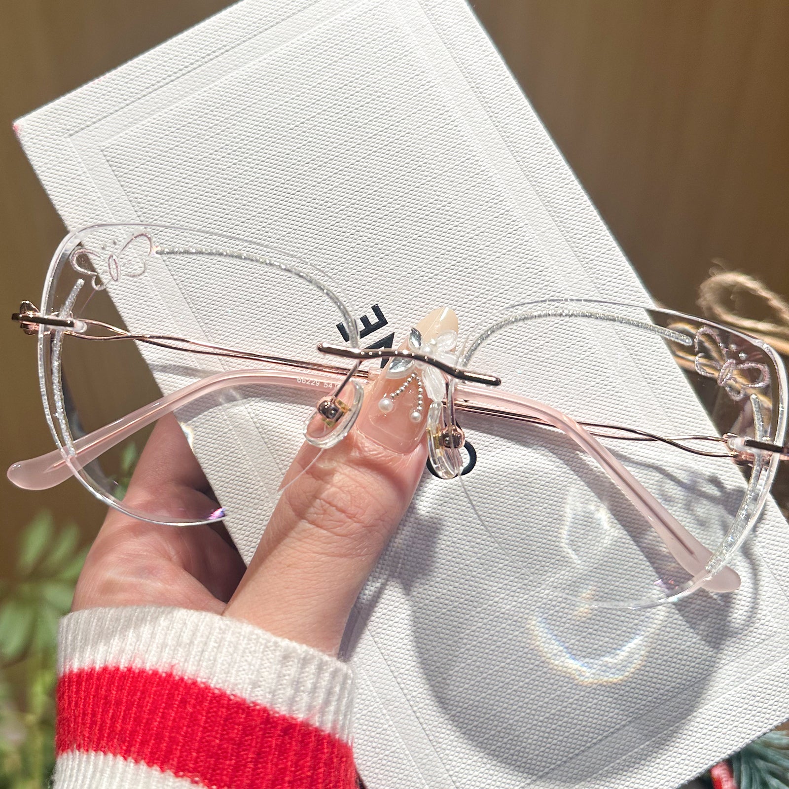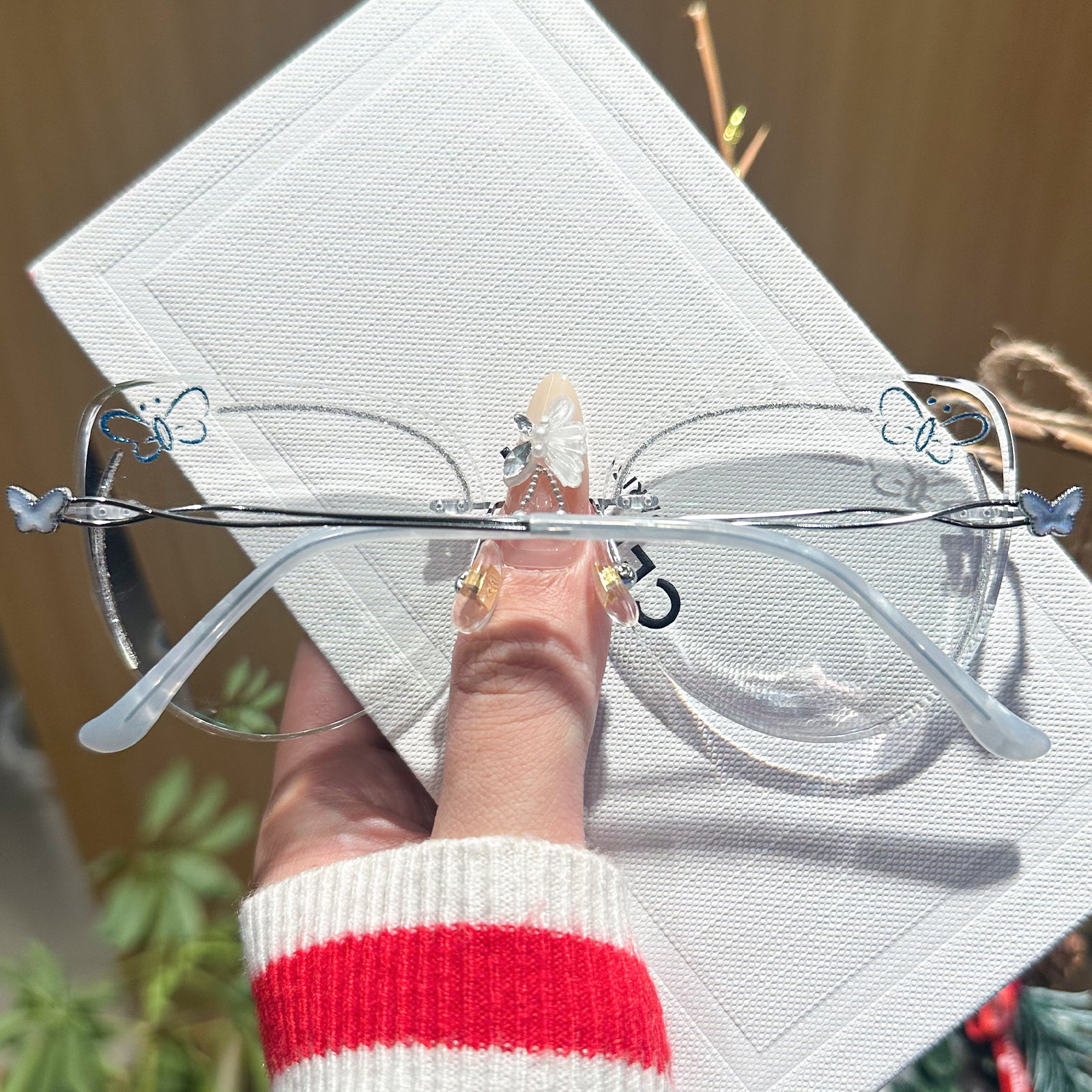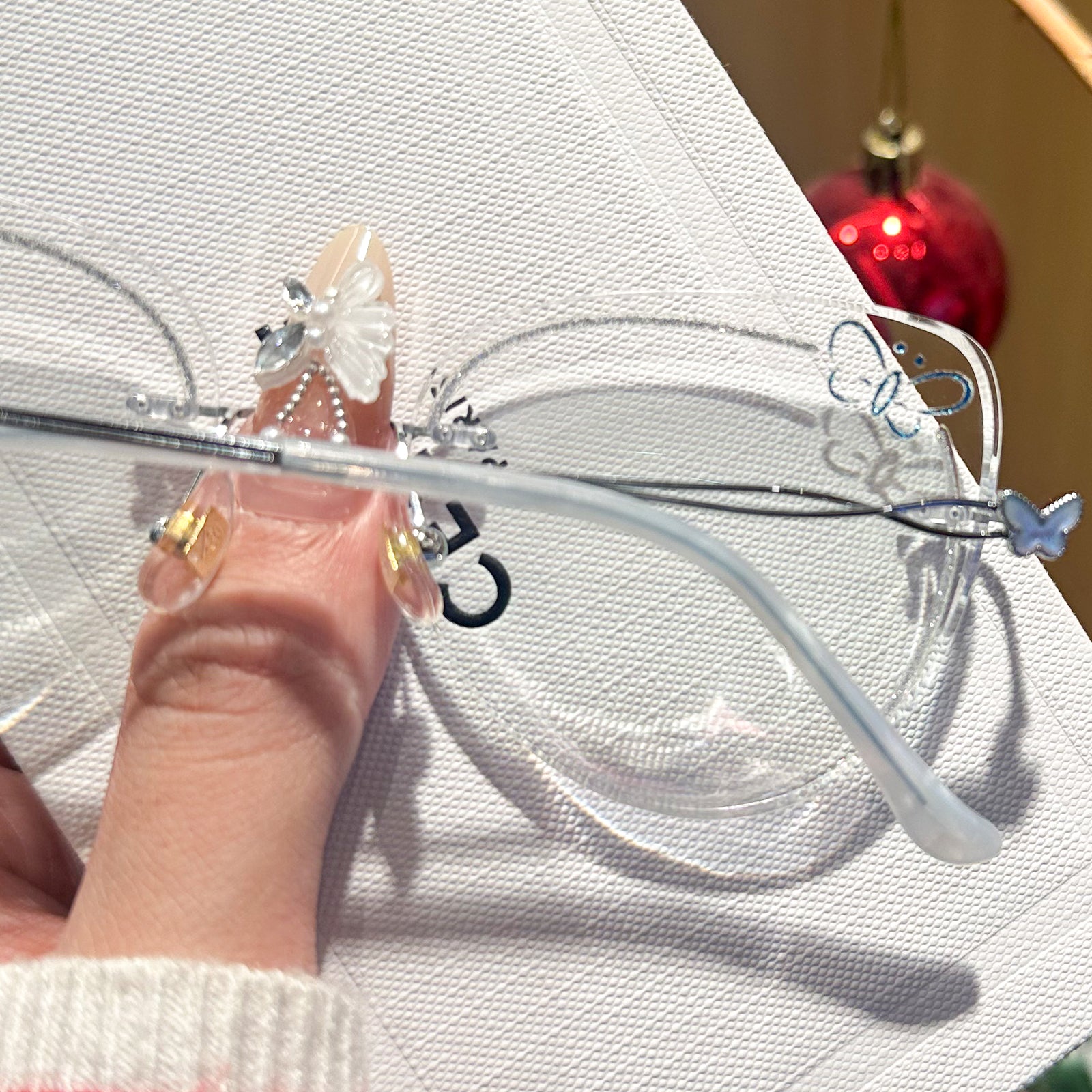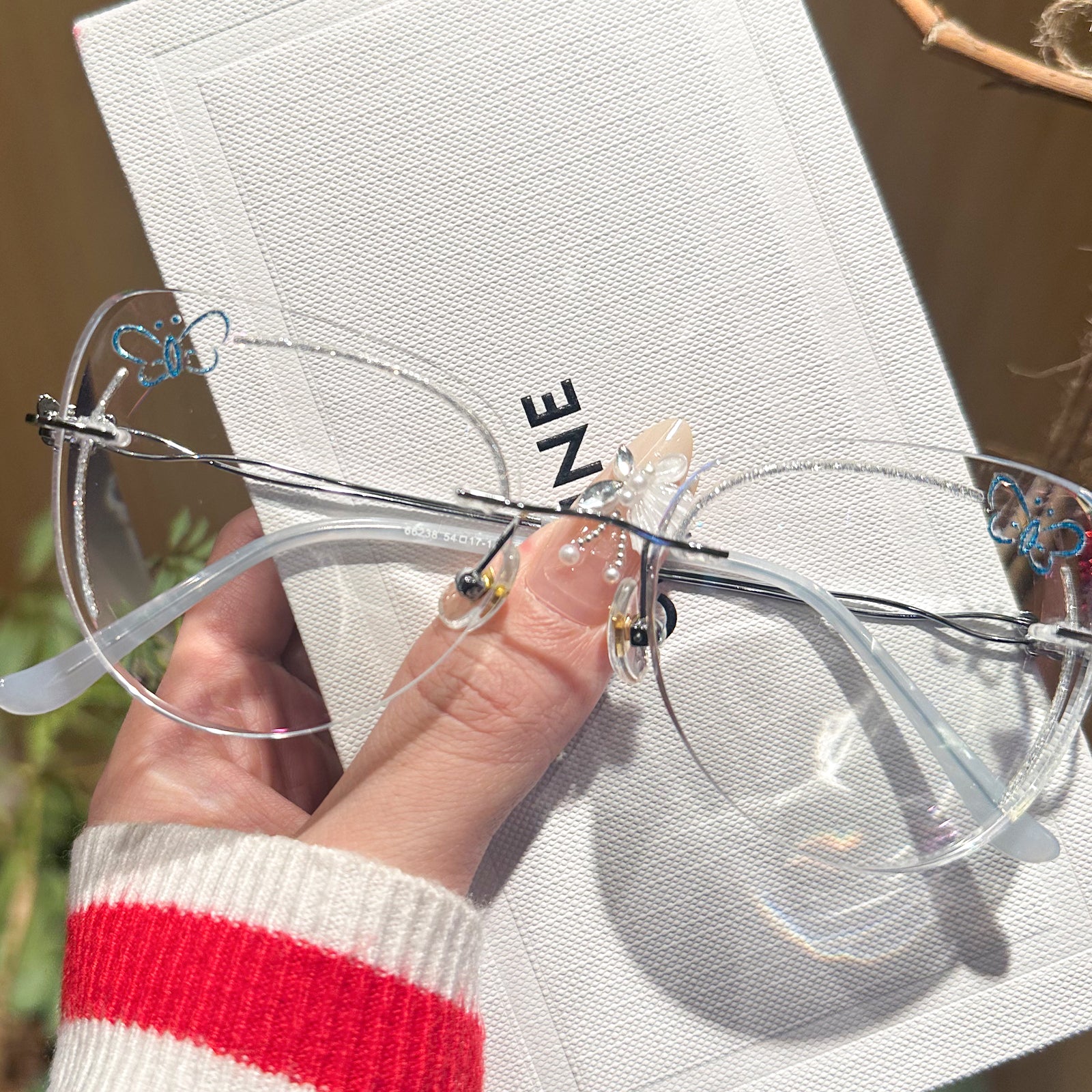 Dazzling butterfly rimless glasses feature butterfly motifs on both the lenses and temples, and are adorned with shimmering glitter details on the lenses, this design brings a touch of whimsy and elegance to your look. Perfect for making a bold and stylish statement.