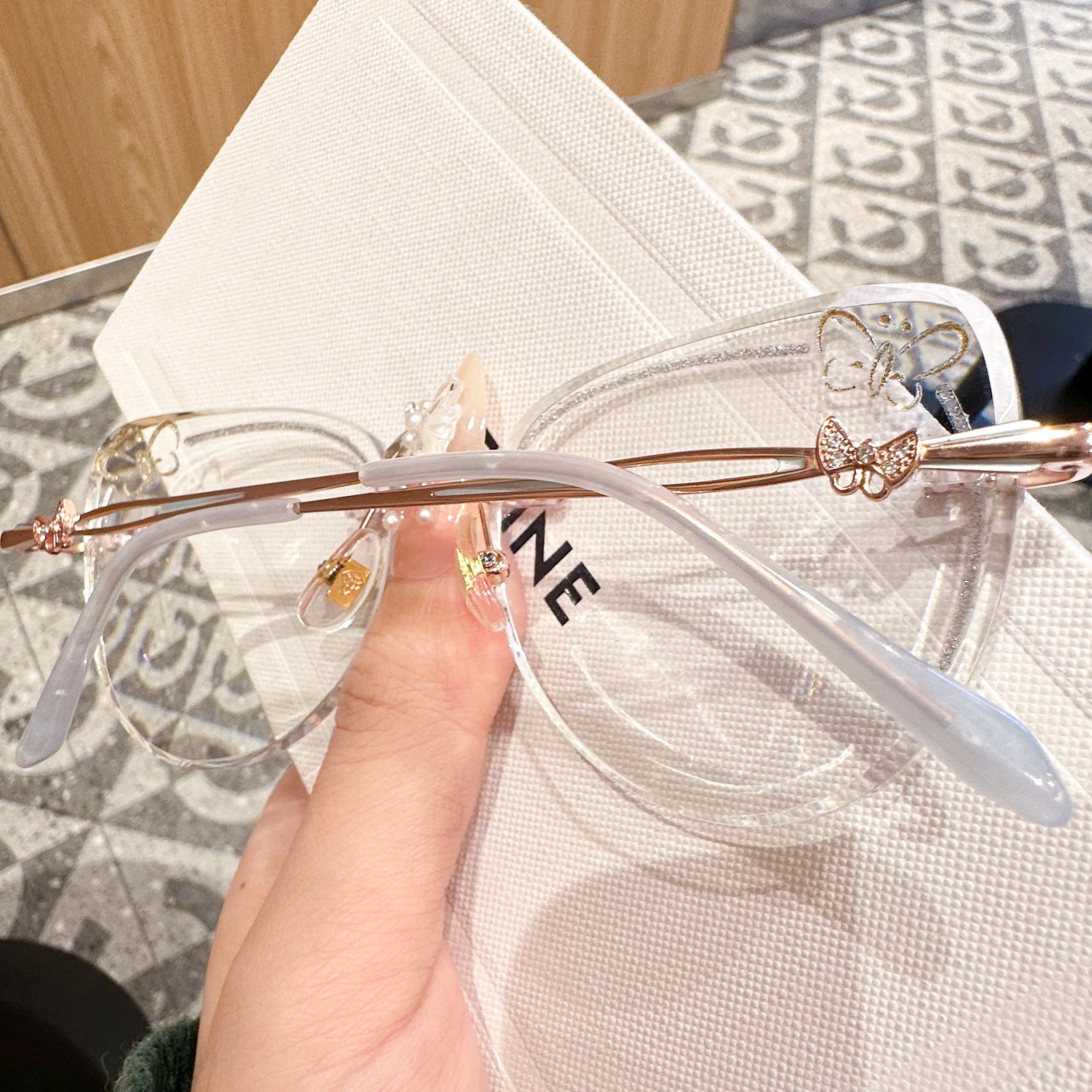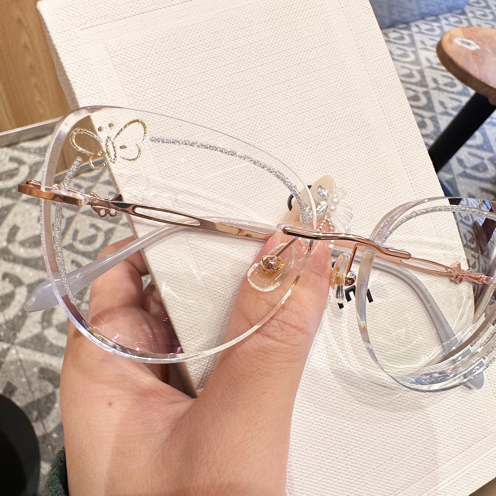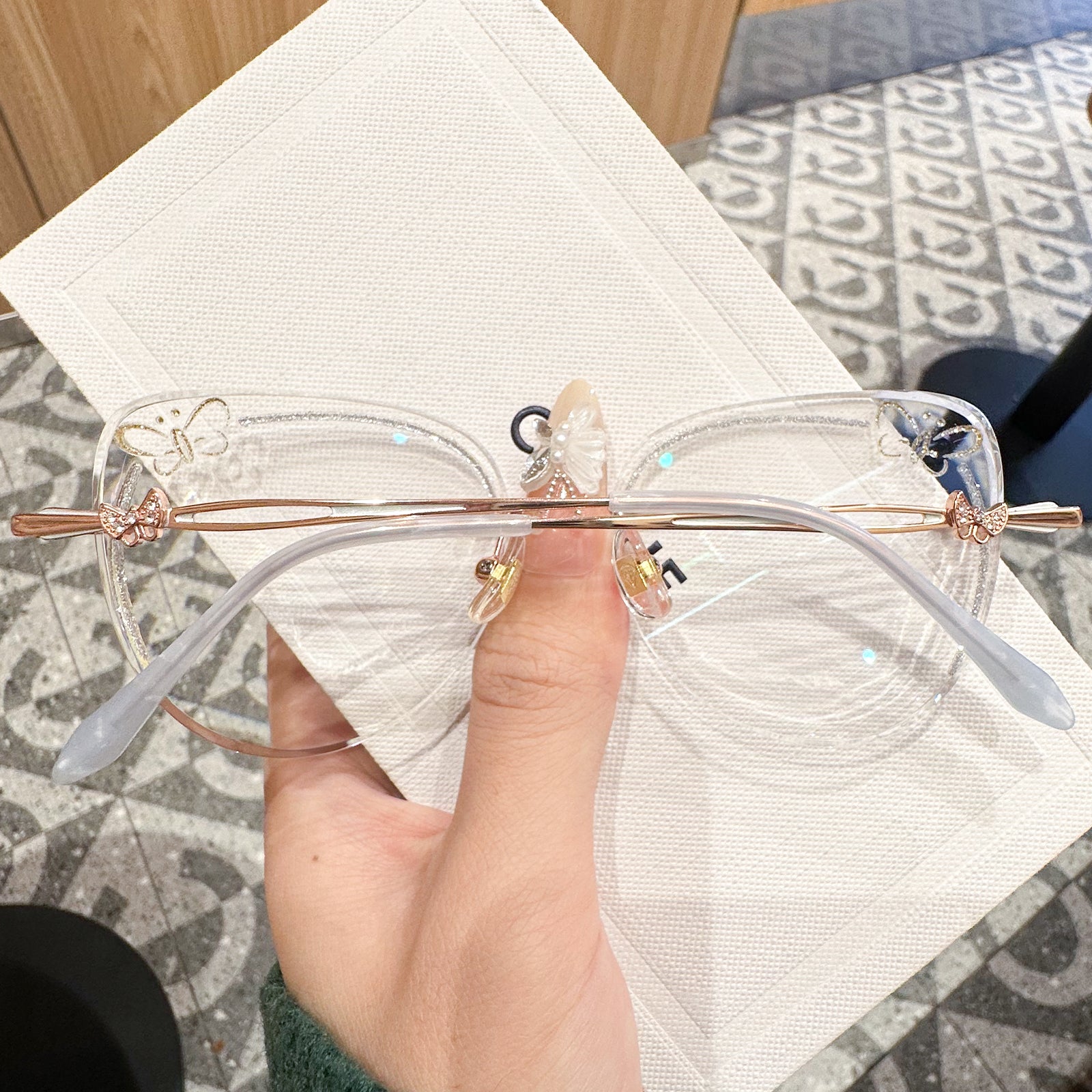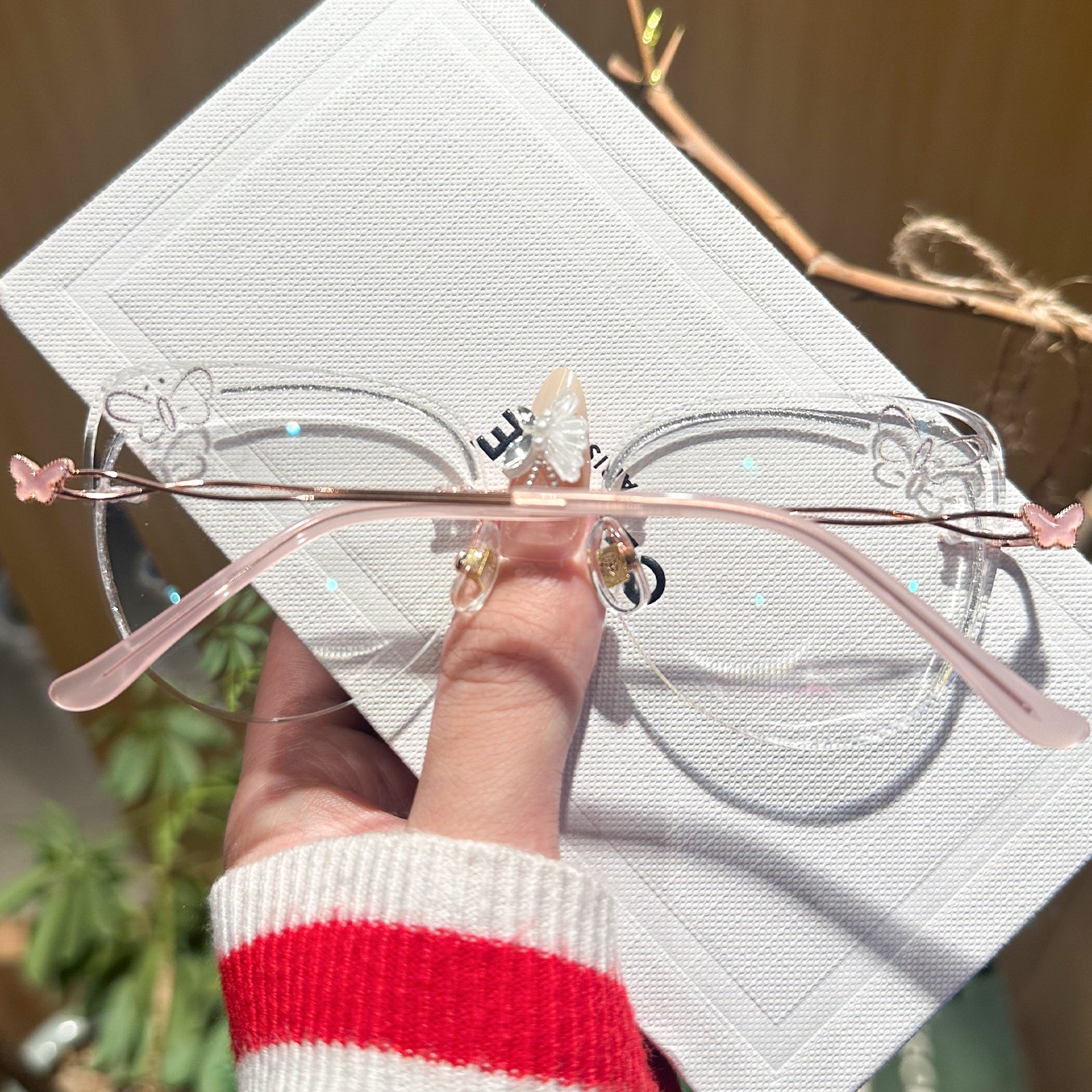 Dazzling butterfly rimless glasses feature butterfly motifs on both the lenses and temples, and are adorned with shimmering glitter details on the lenses, this design brings a touch of whimsy and elegance to your look. Perfect for making a bold and stylish statement.
