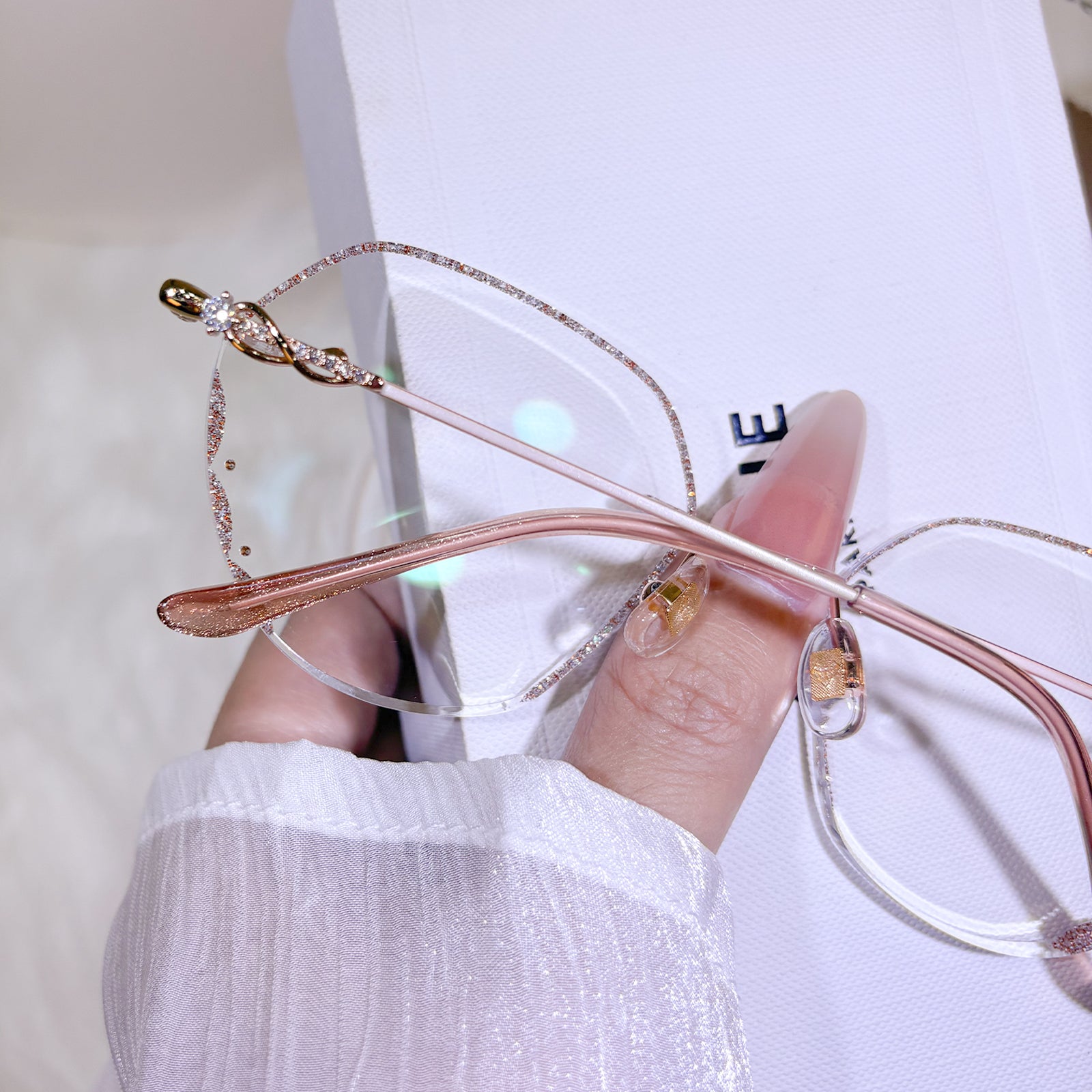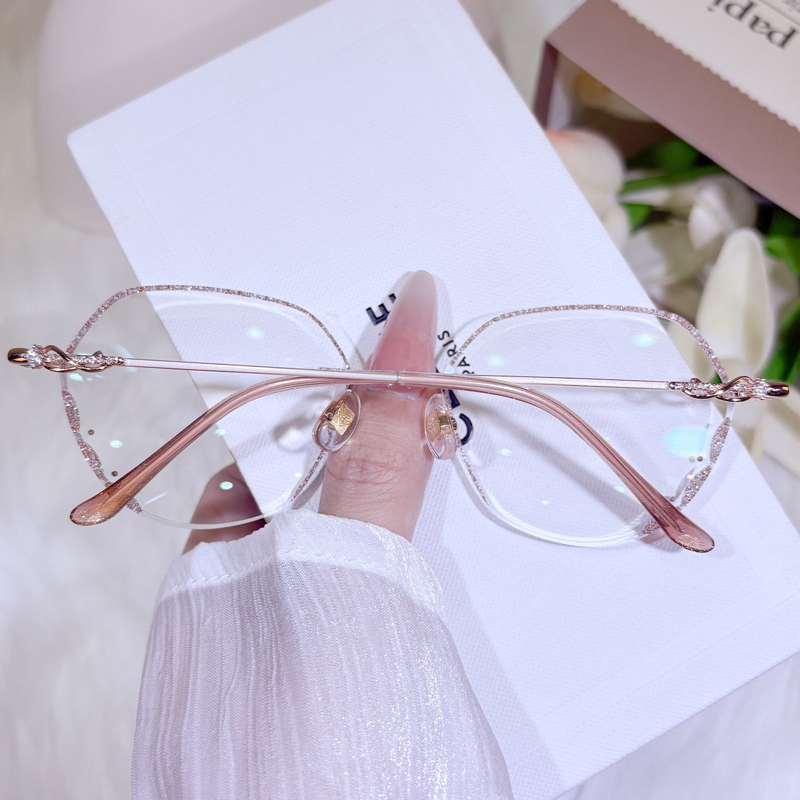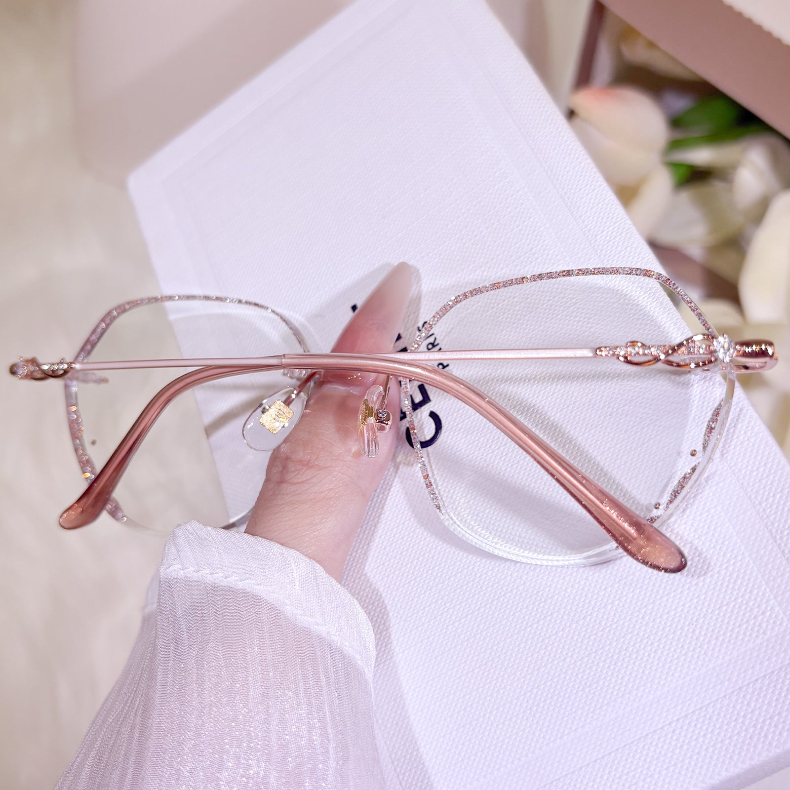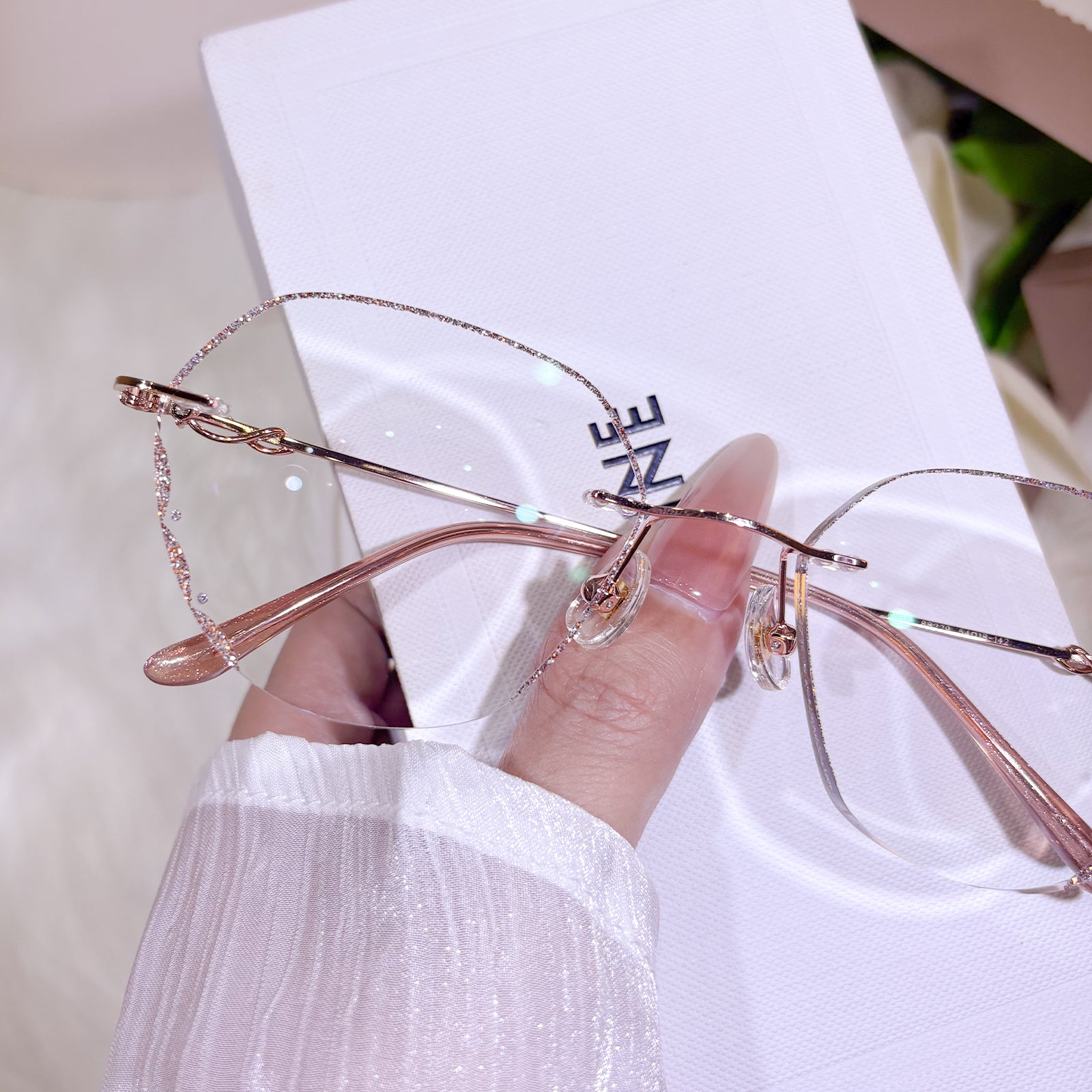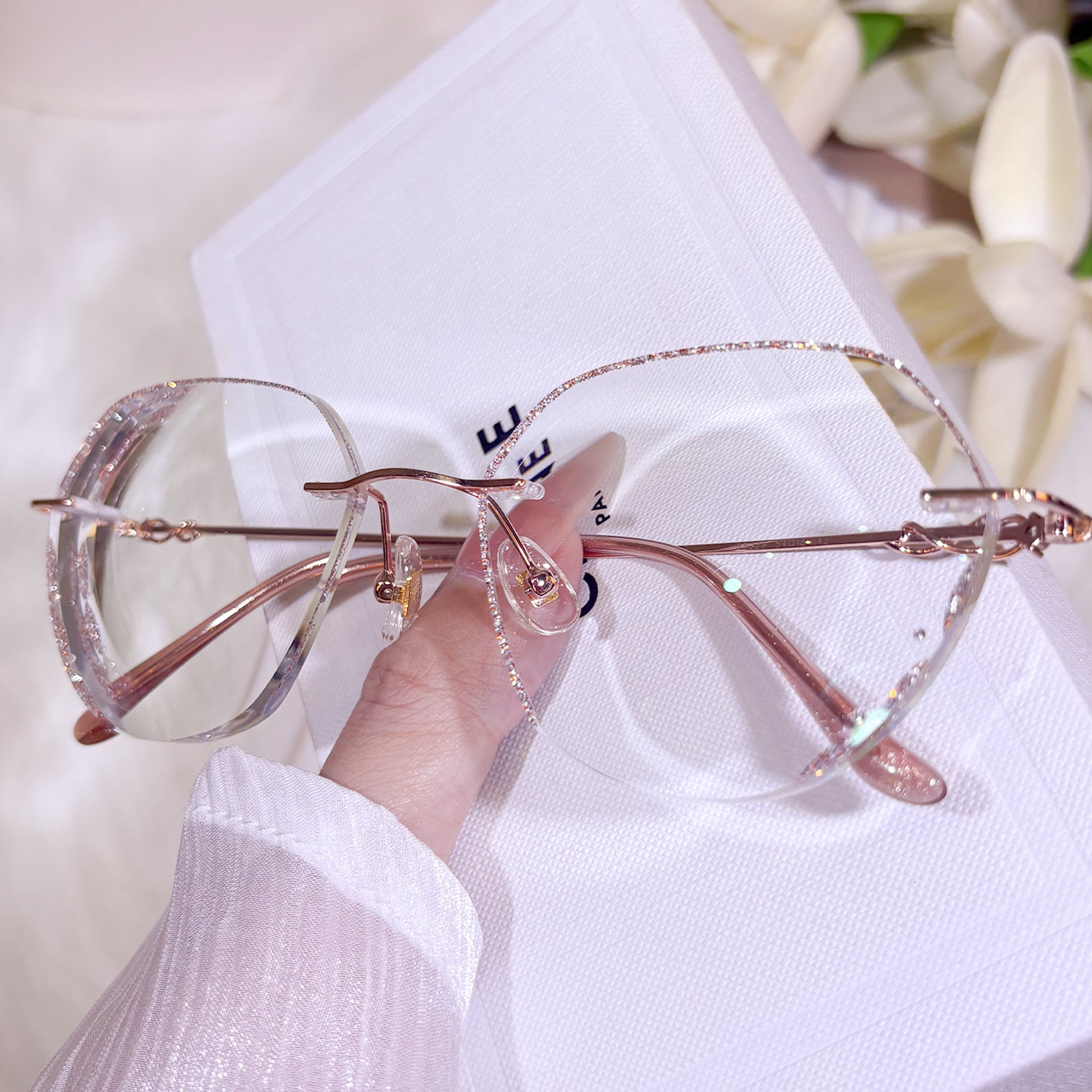 | Exclusive Design | These geometric rimless glasses dazzle with lenses encrusted in shimmering rose-gold glitter, radiating elegance and charm. The ornate decorations on the temples add a luxurious touch, making them a striking and sophisticated accessory for fashion-forward women.