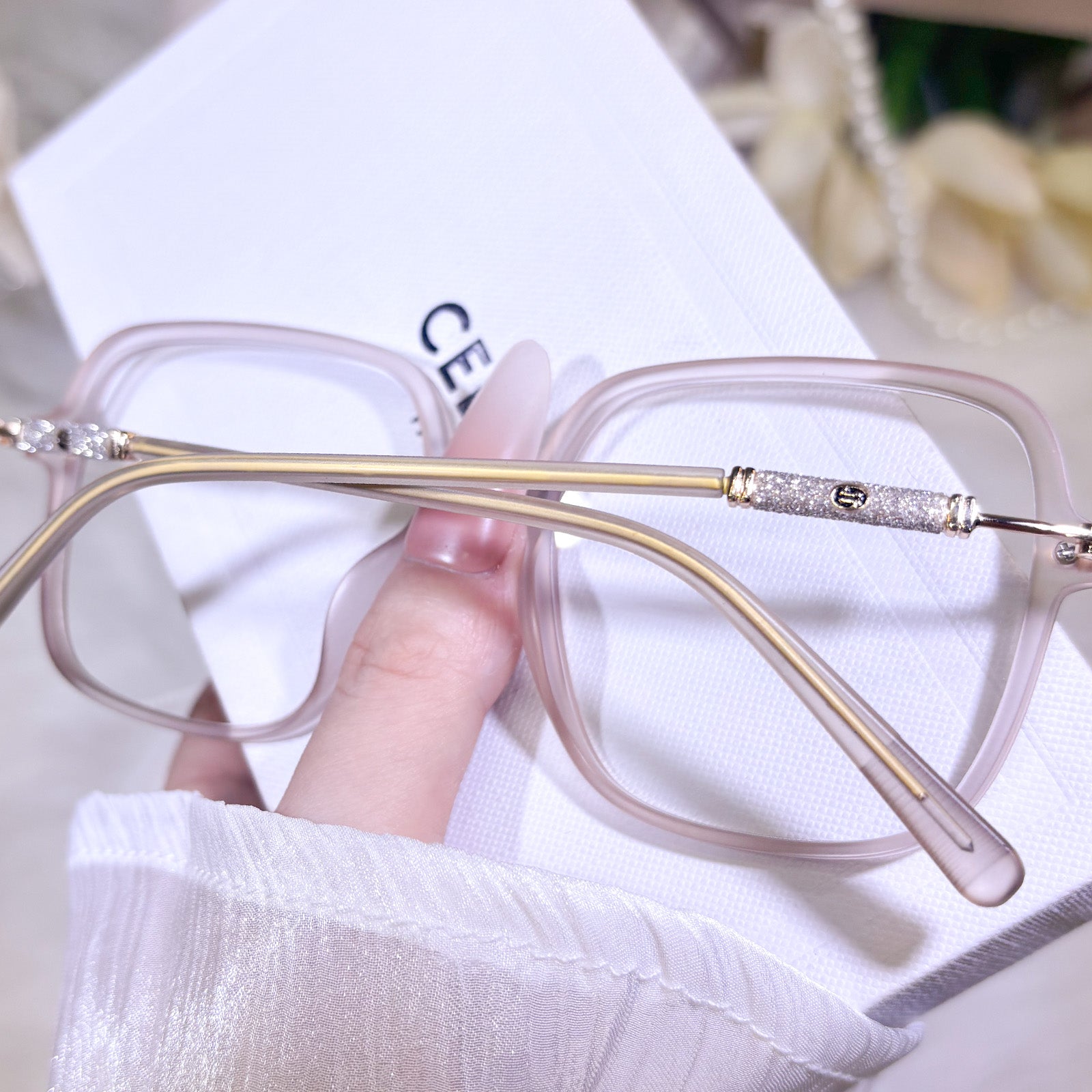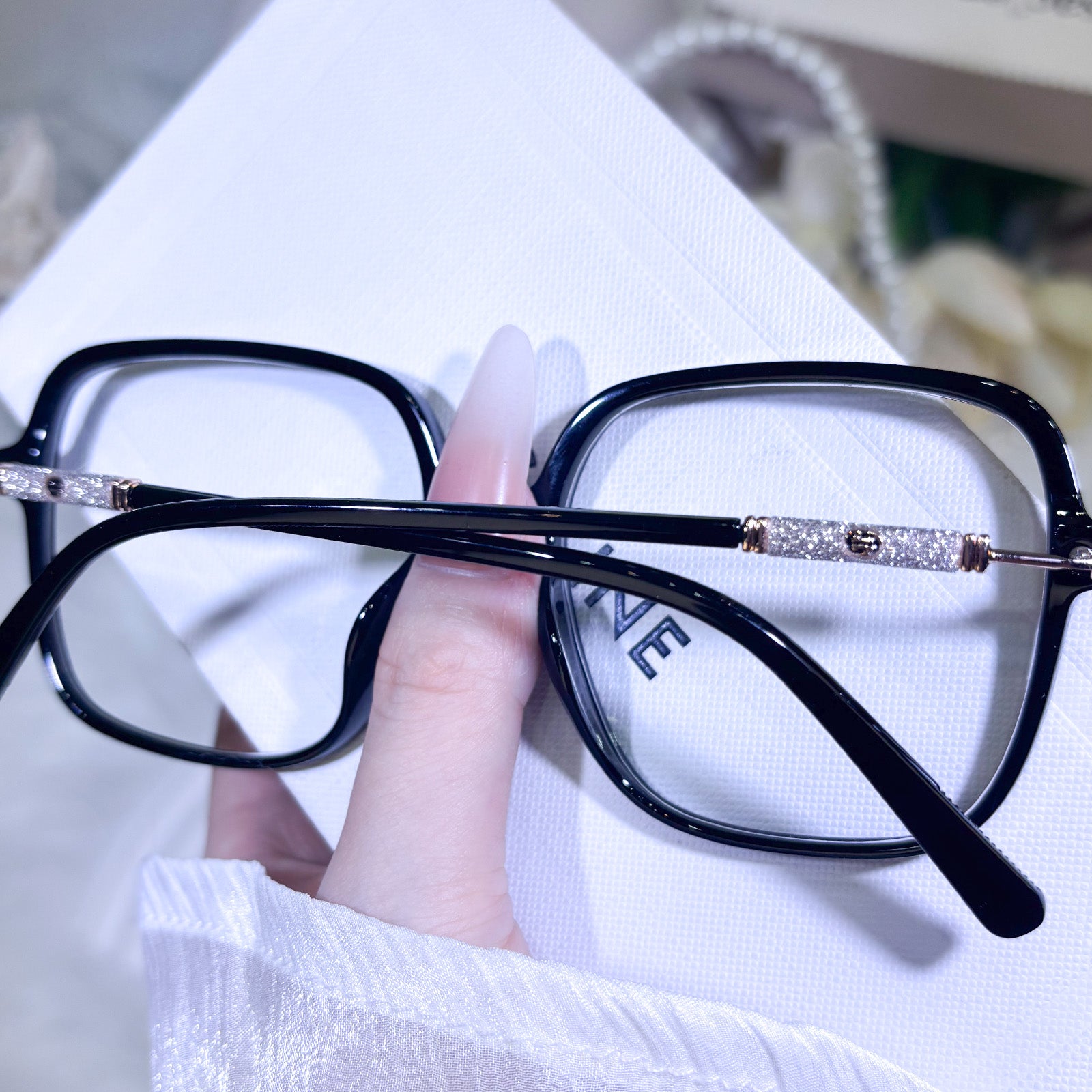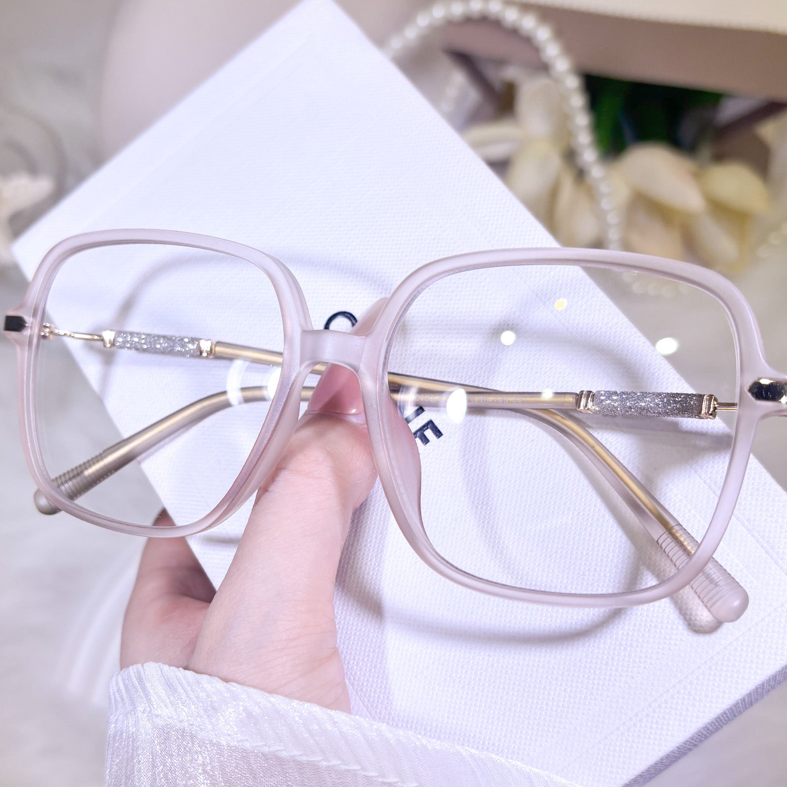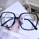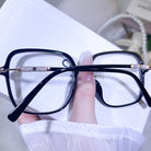 These oversized square-frame glasses for women are adorned with sparkling glitter accents on the temples that shimmer brightly in the light. The bold, modern square shape flatters all face shapes and adds a trendy, confident touch to any look. Lightweight and eye-catching, they bring a dazzling, feminine charm to your everyday style.