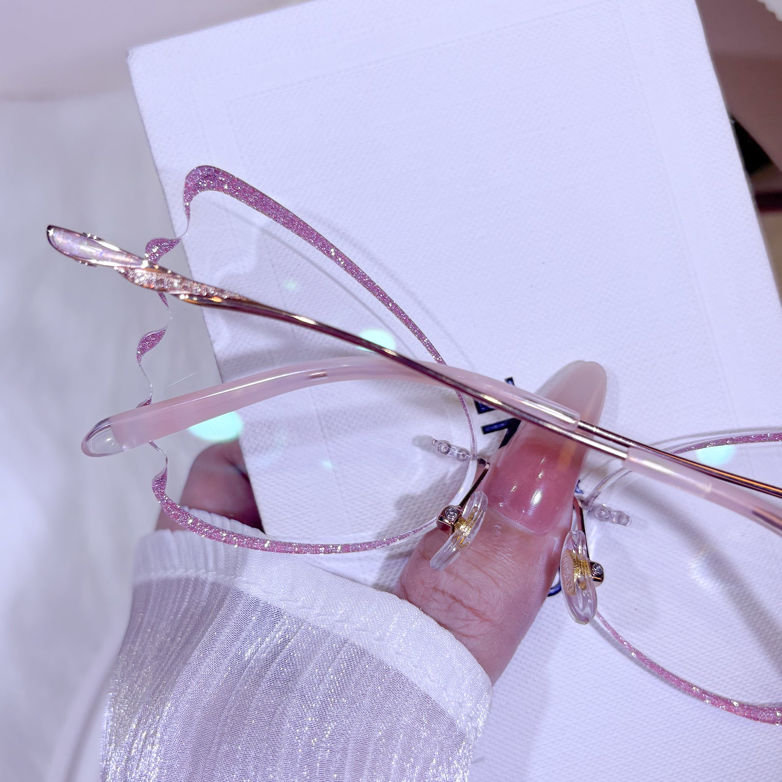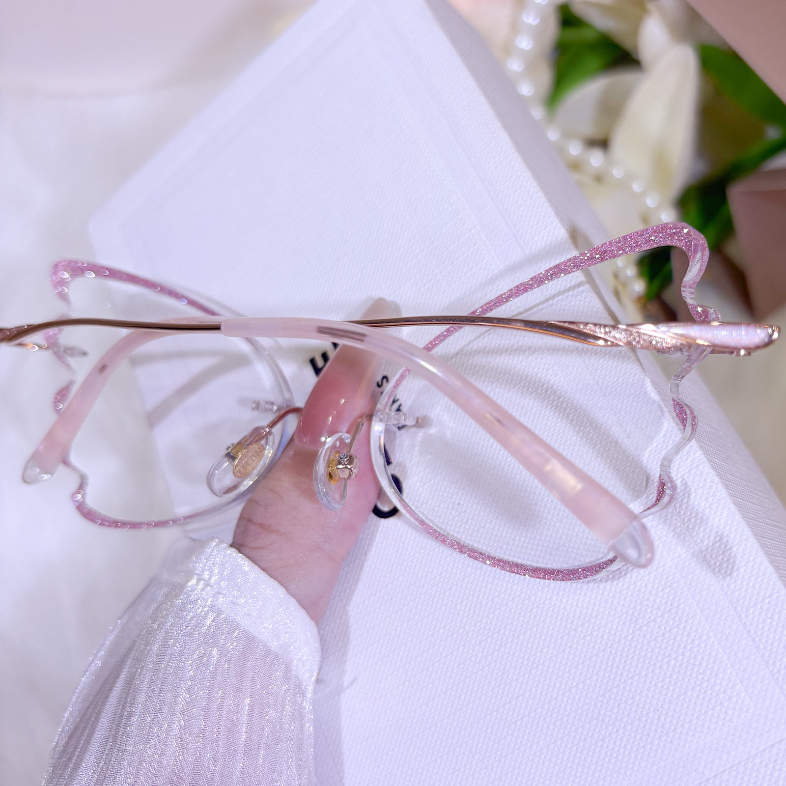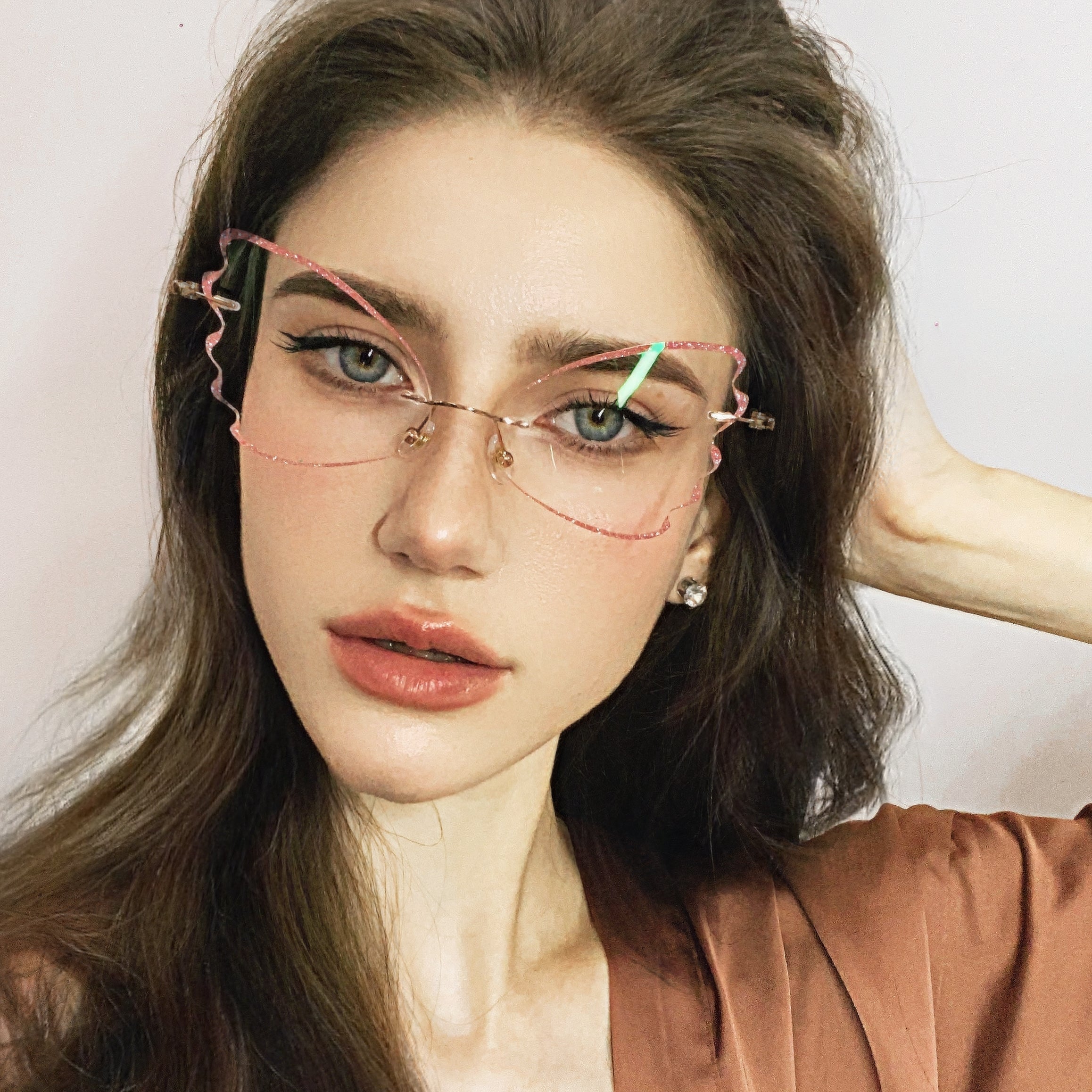 | Exclusive Design | These dreamy rimless glasses feature lenses shaped like soft, fluttery wings, delicately wrapped in sparkling pink glitter. The temples are designed to resemble wings in motion, adding a whimsical and elegant touch that makes them both enchanting and stylish.