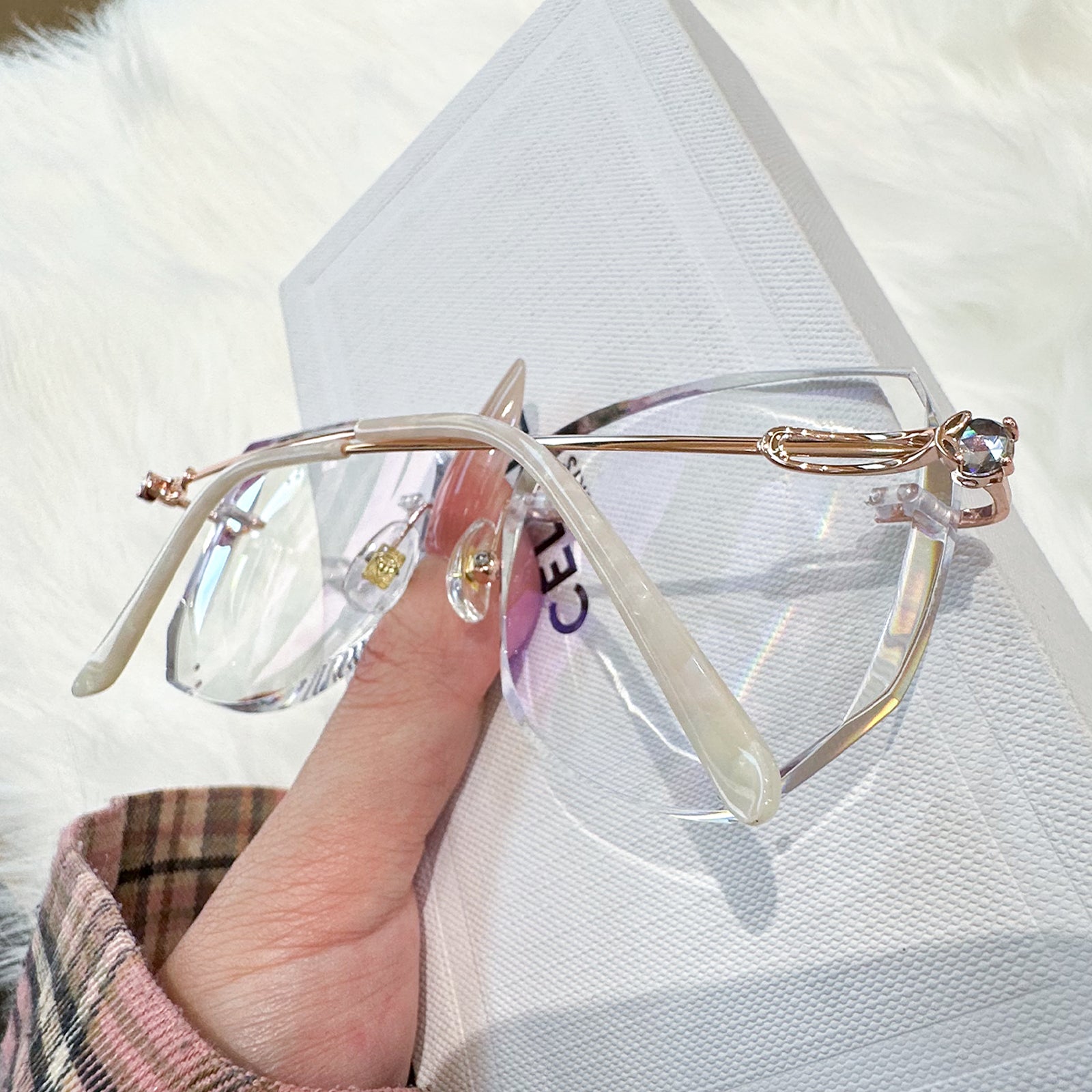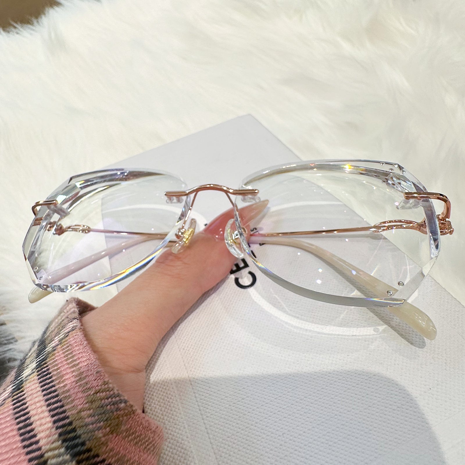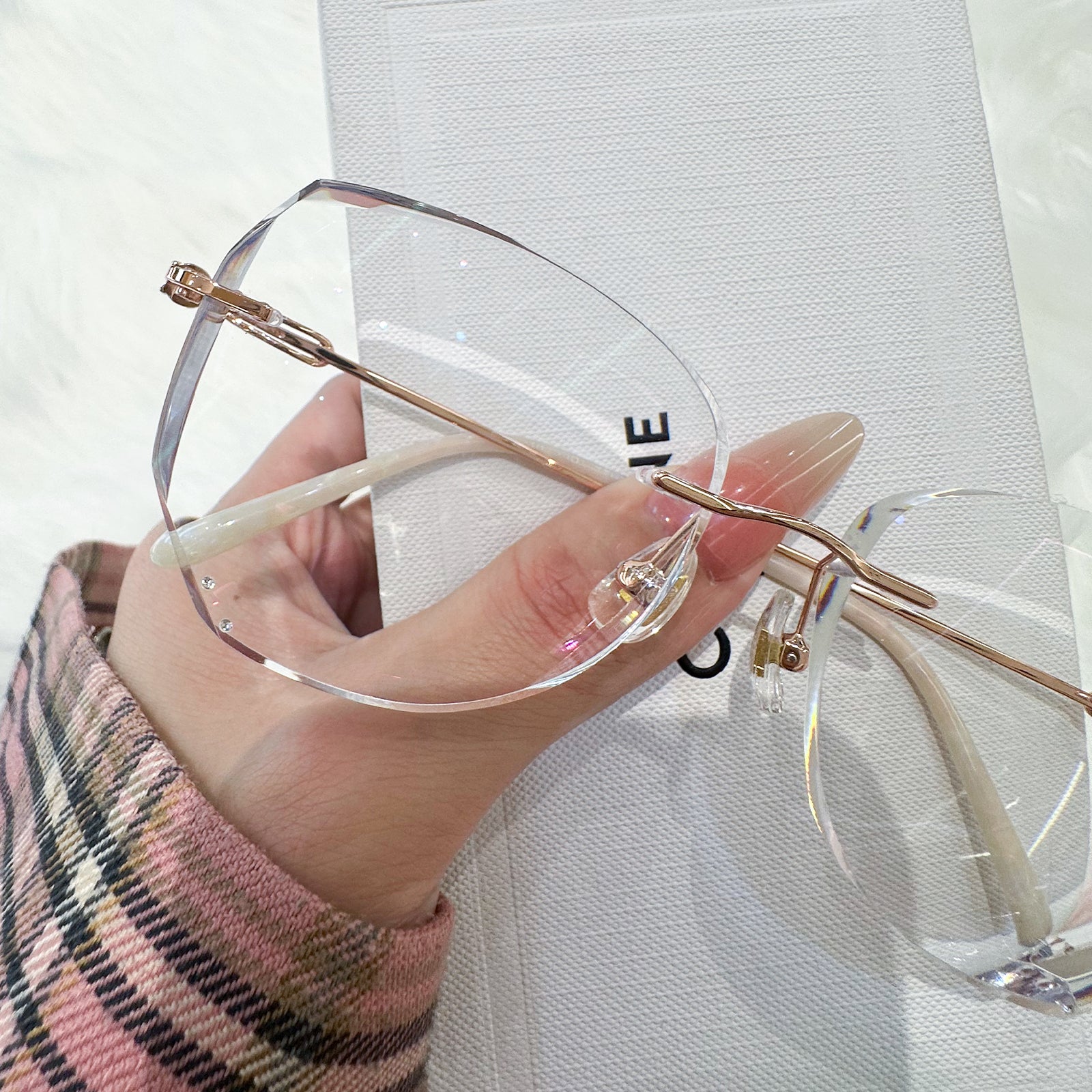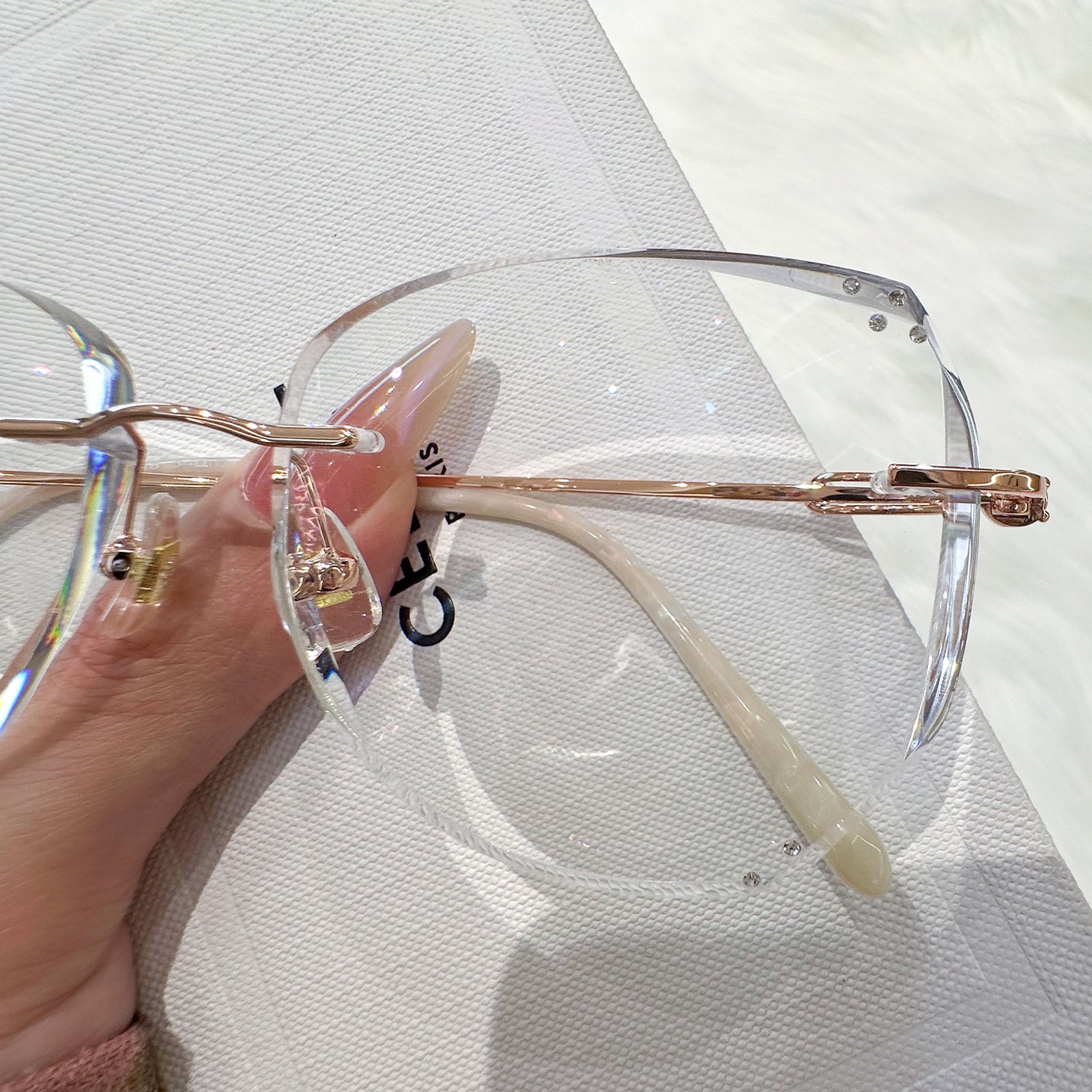 | Exclusive Design | Geometric Rimless Glasses with Diamond Accents – uniquely charming and full of sparkle. The lenses feature a modern geometric shape with delicate diamond-like embellishments, catching the light beautifully. Paired with slender metal temples adorned with graceful decorative details, these glasses offer an elegant yet eye-catching look that's perfect for fashion-forward women.