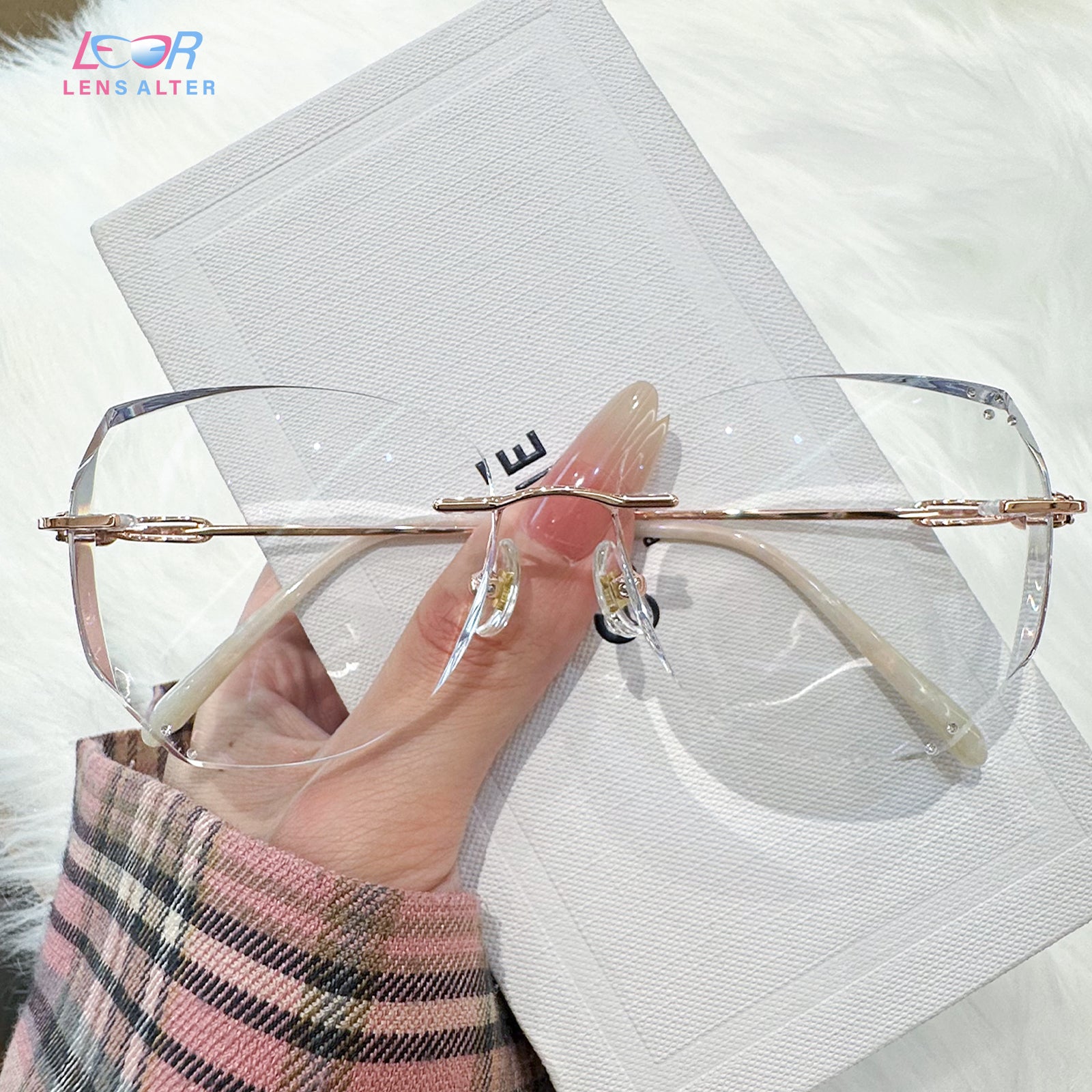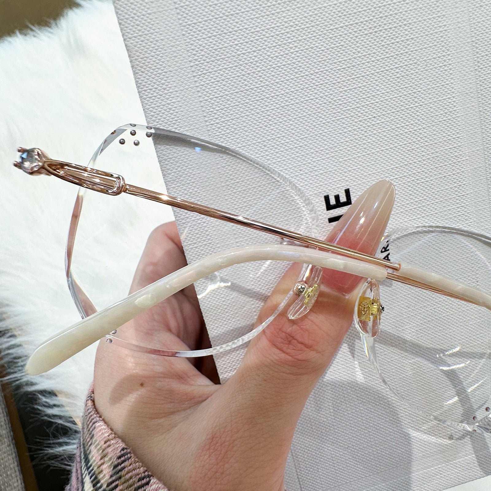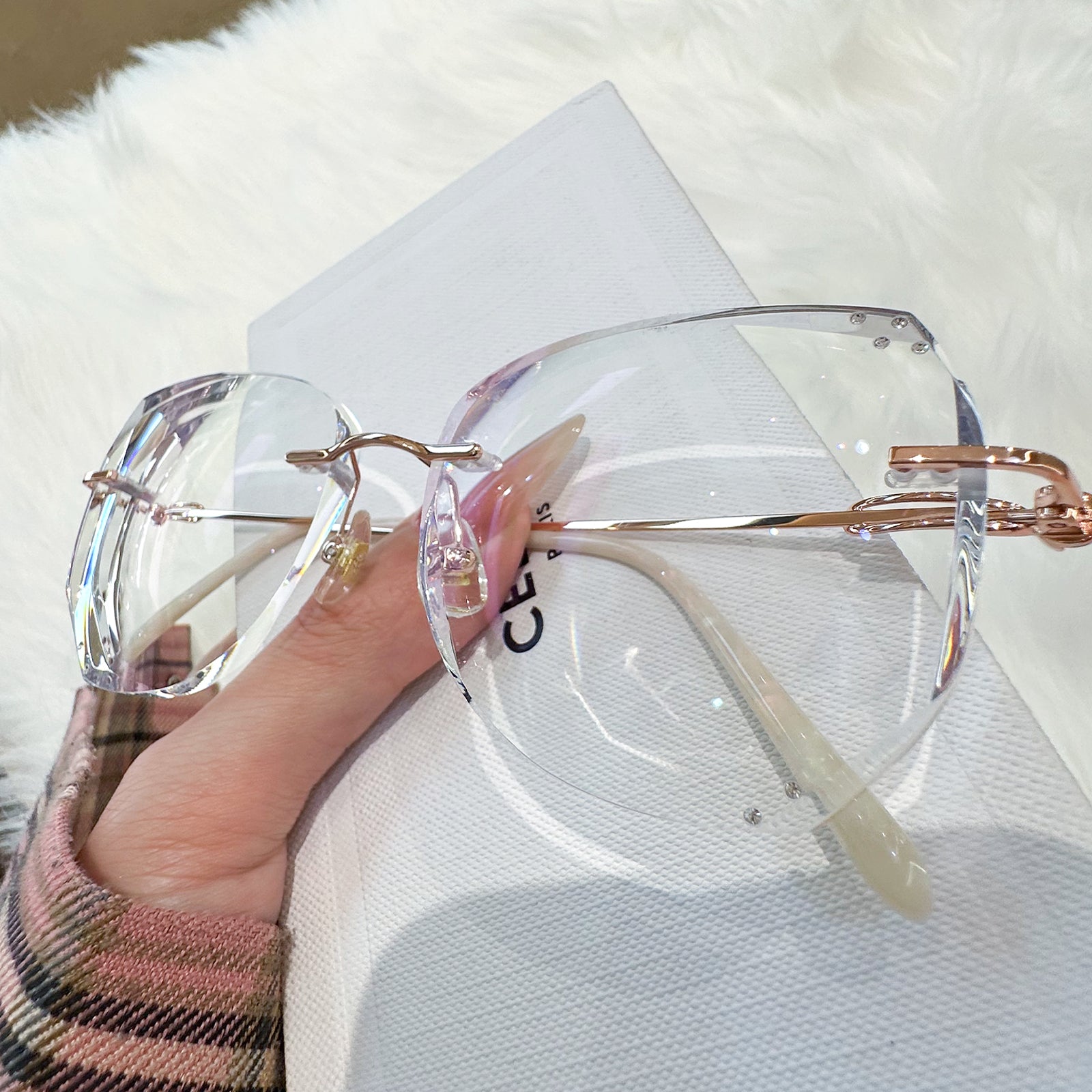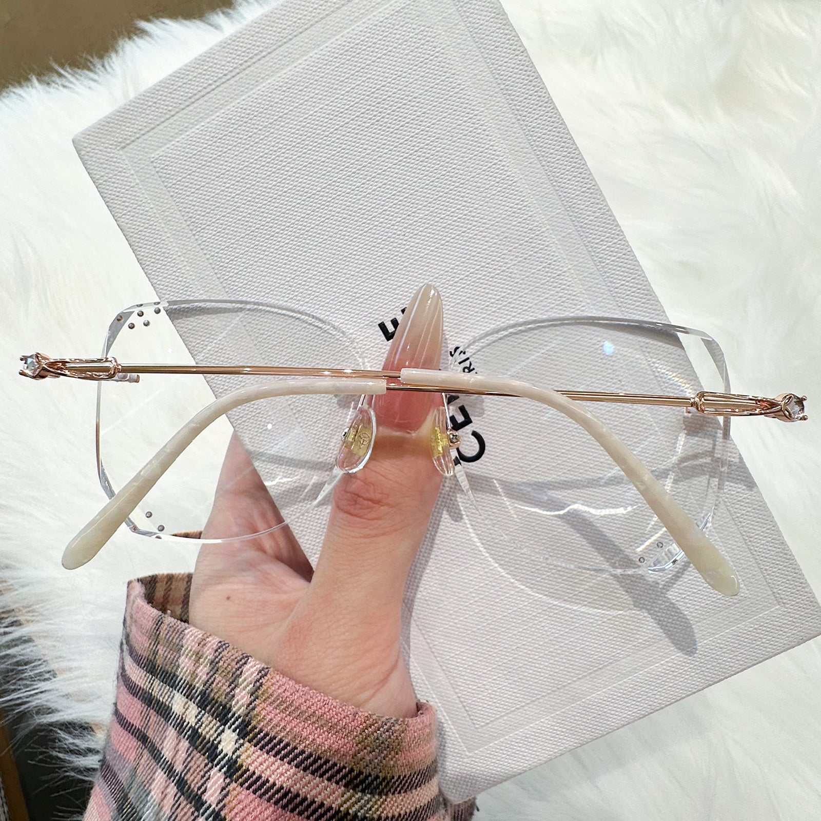 | Exclusive Design | Geometric Rimless Glasses with Diamond Accents – uniquely charming and full of sparkle. The lenses feature a modern geometric shape with delicate diamond-like embellishments, catching the light beautifully. Paired with slender metal temples adorned with graceful decorative details, these glasses offer an elegant yet eye-catching look that's perfect for fashion-forward women.