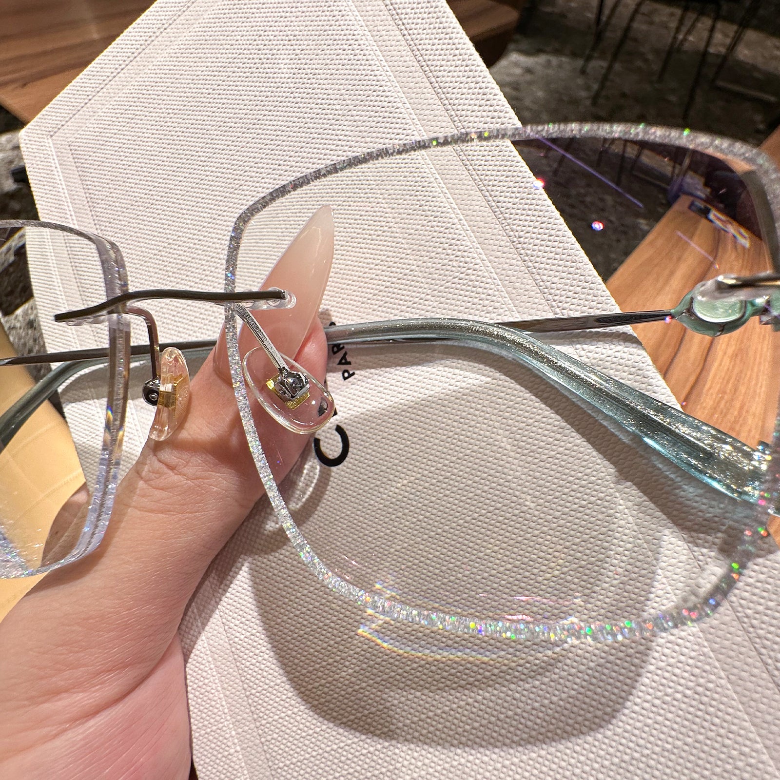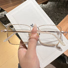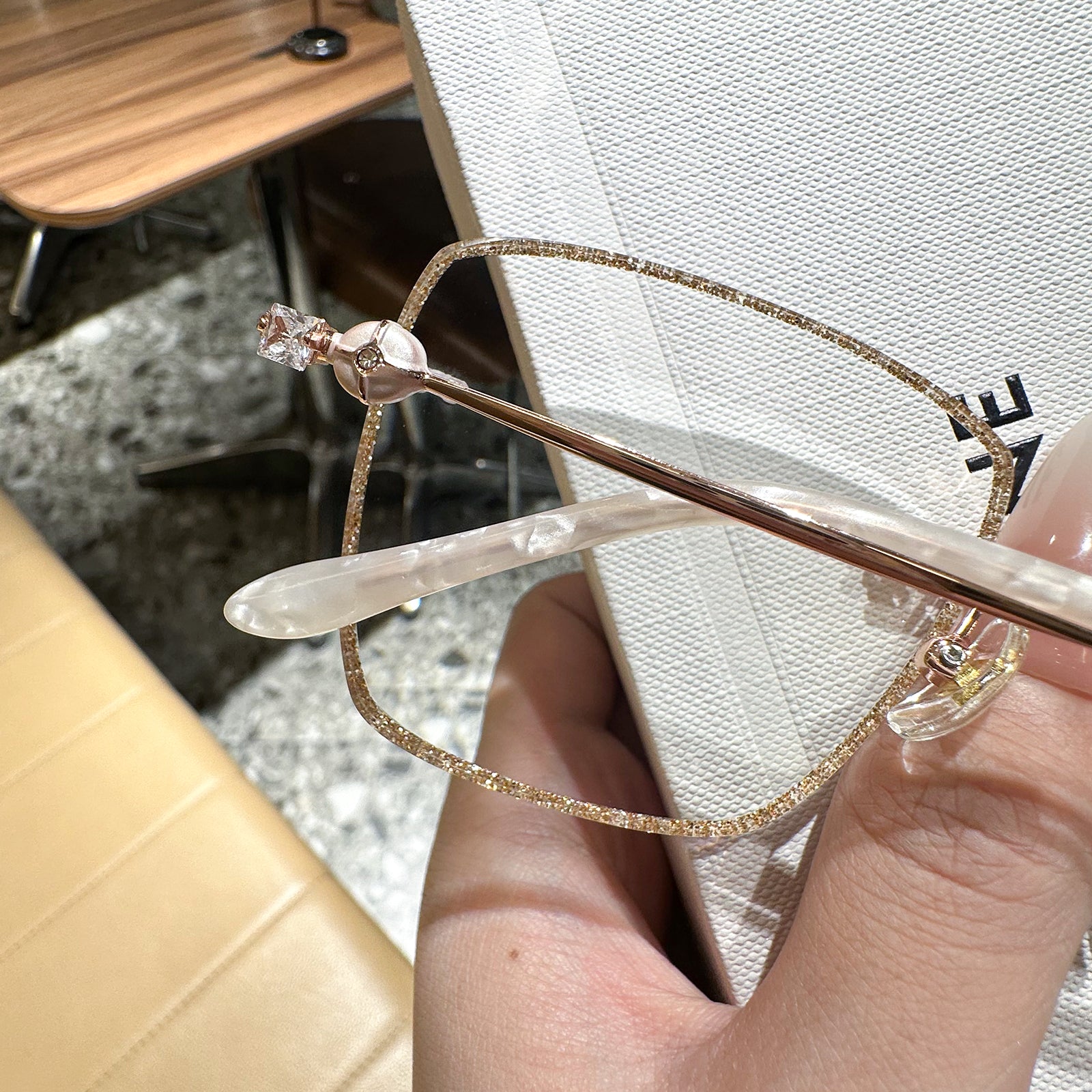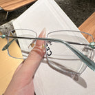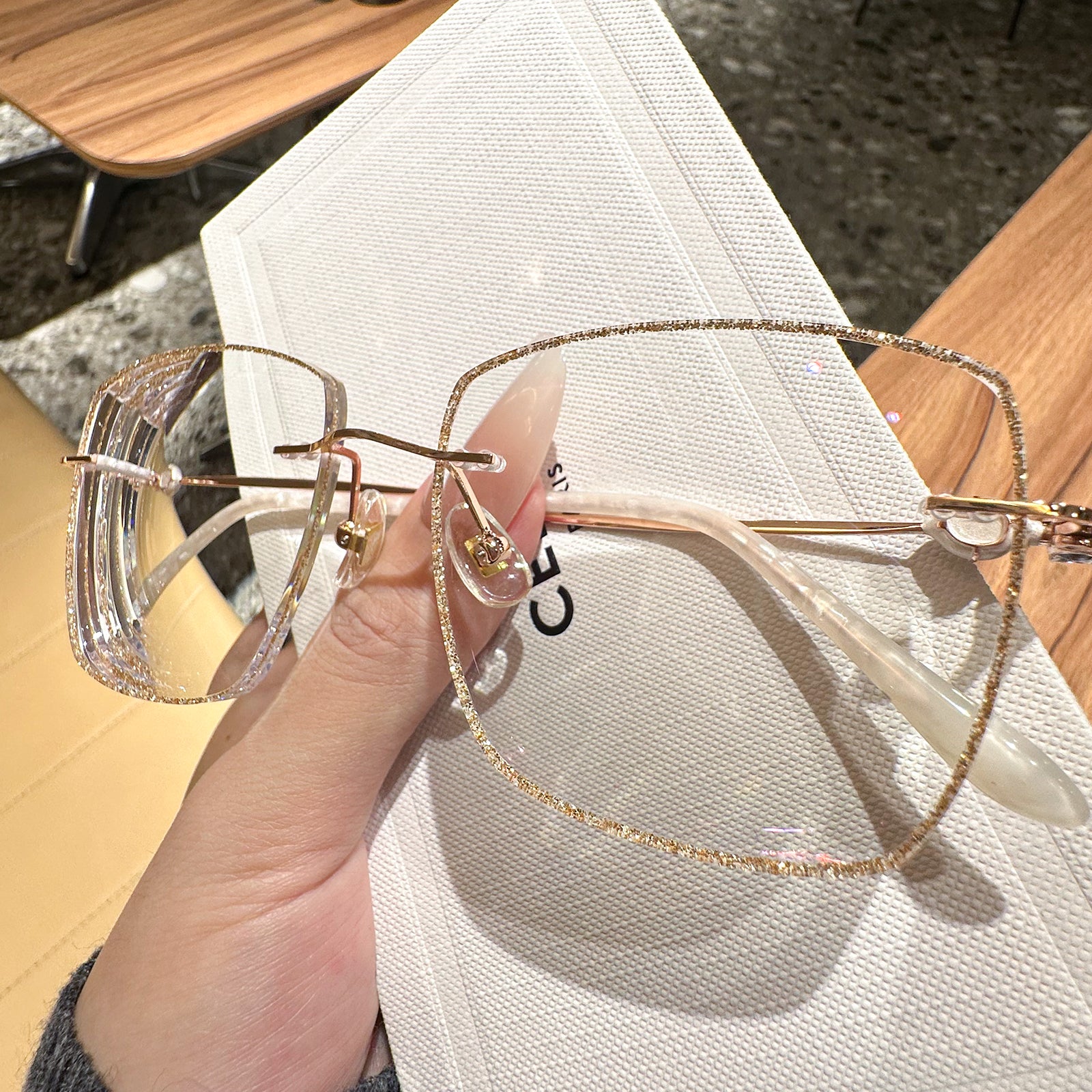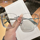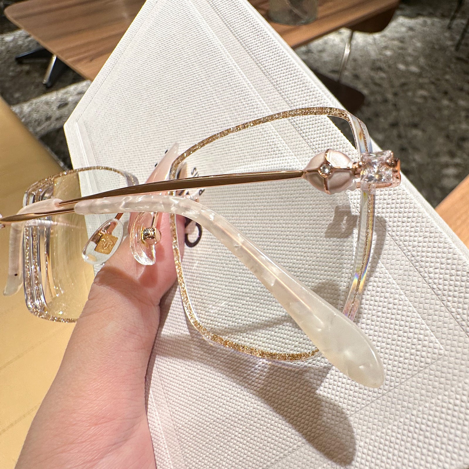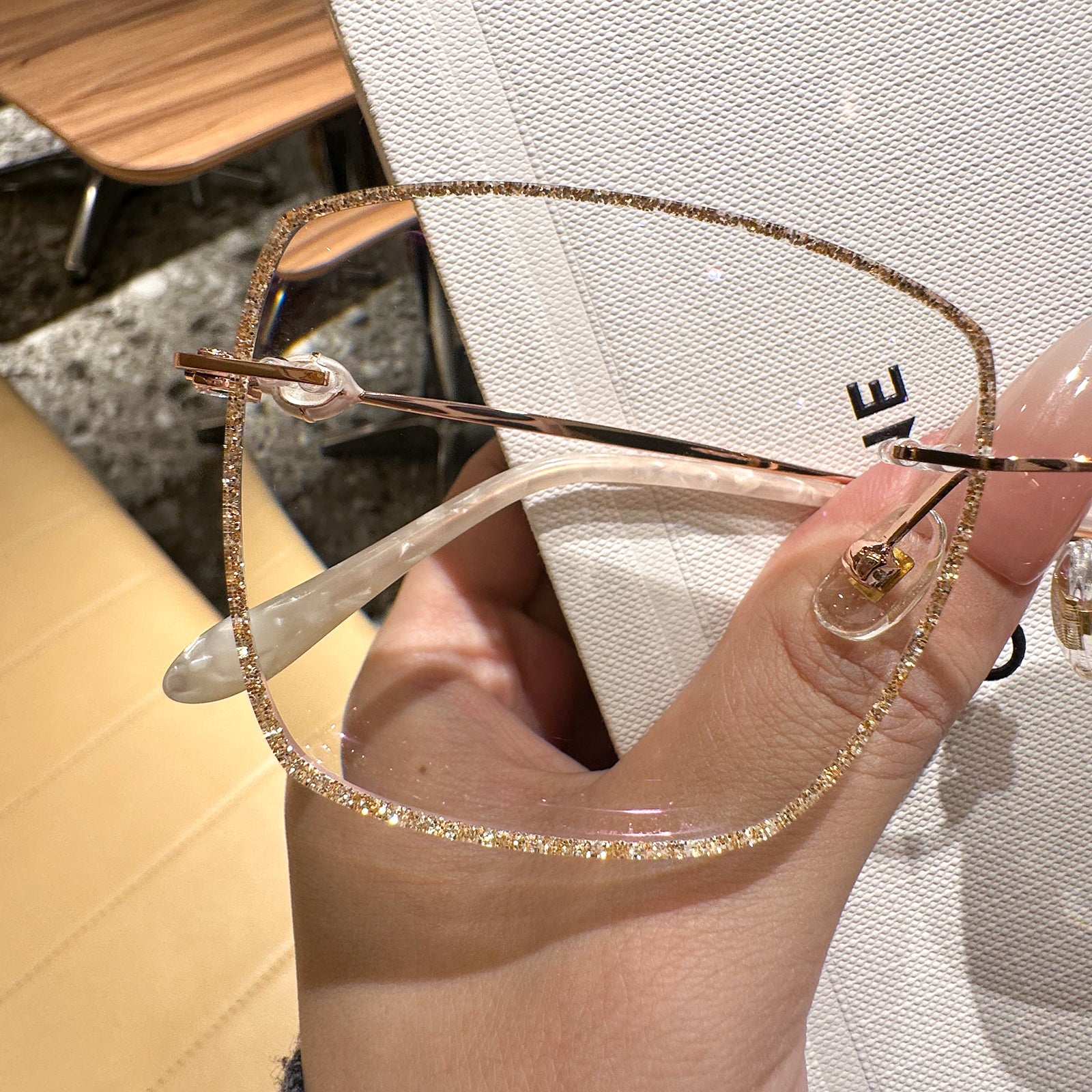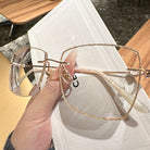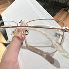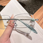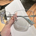 Square rimless glasses redefine sophistication with glitter-encrusted lens edges that sparkle with every movement. The temple exudes a regal charm, featuring a design inspired by royal aesthetics. Perfect for those who want to add a touch of majesty to their everyday style, these glasses are both dazzling and distinguished.