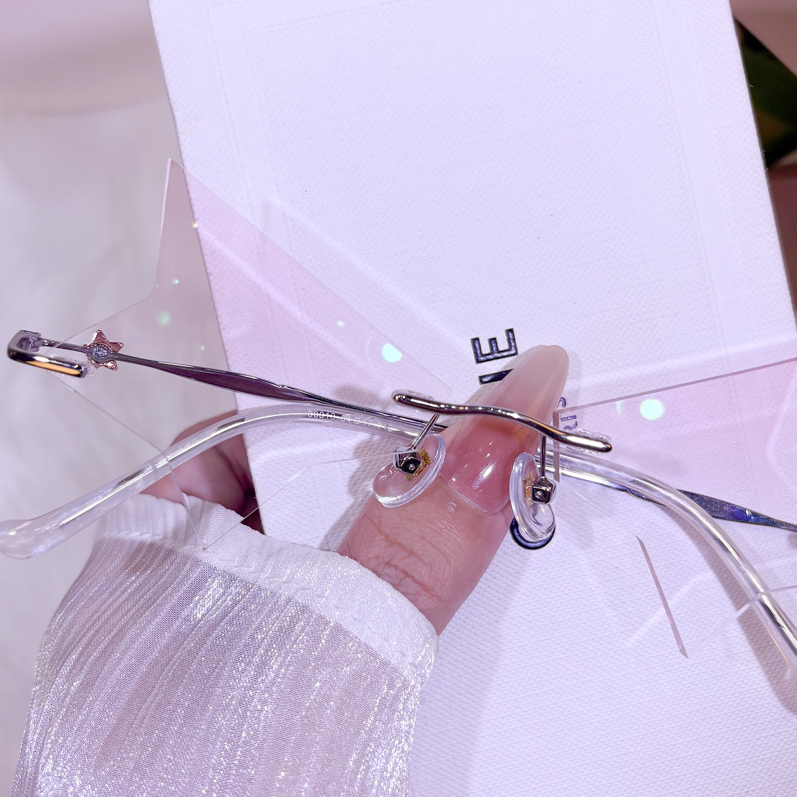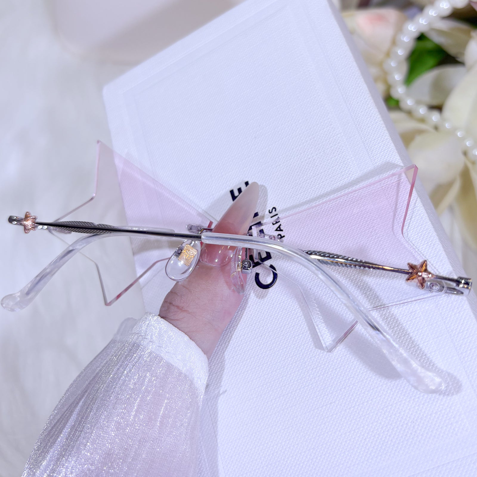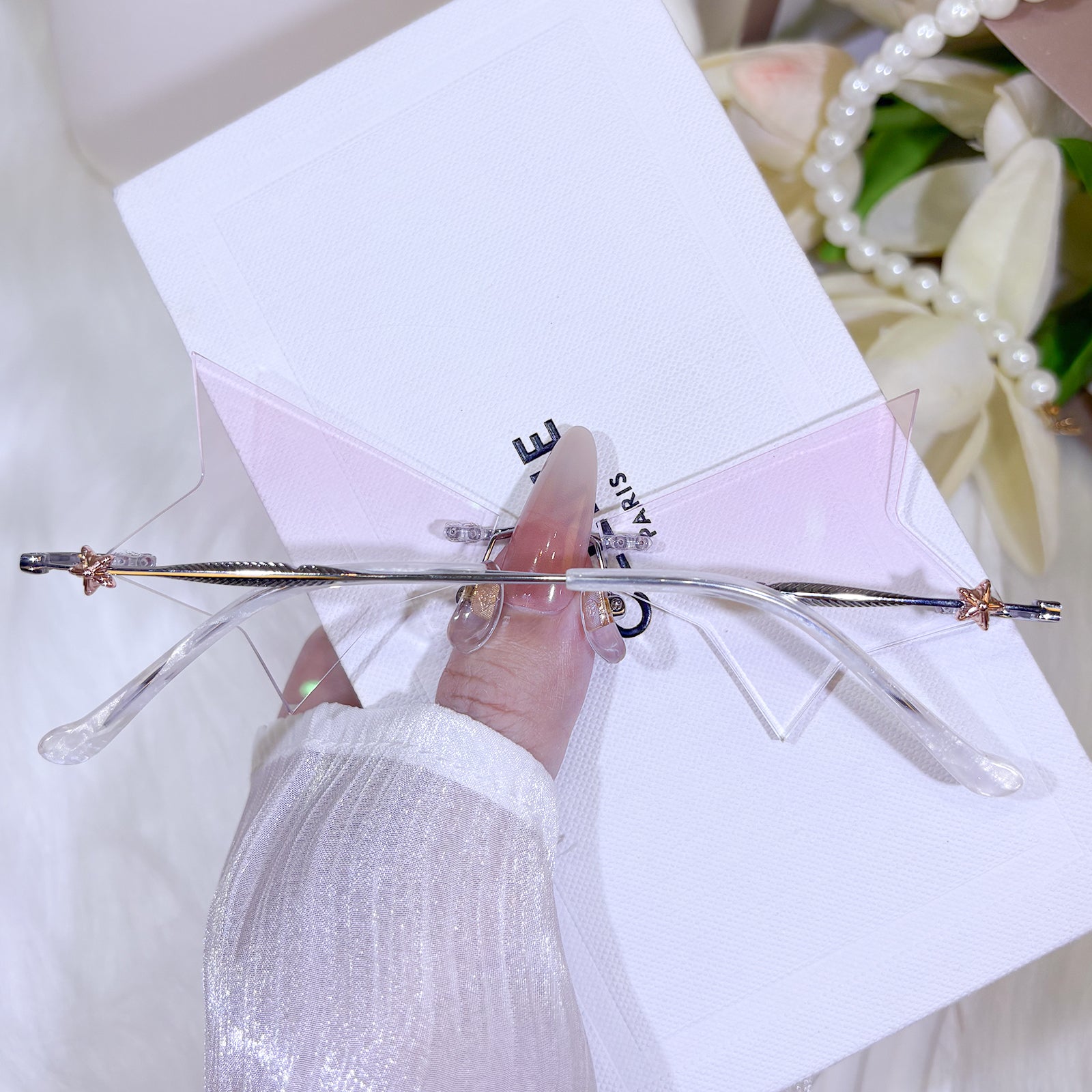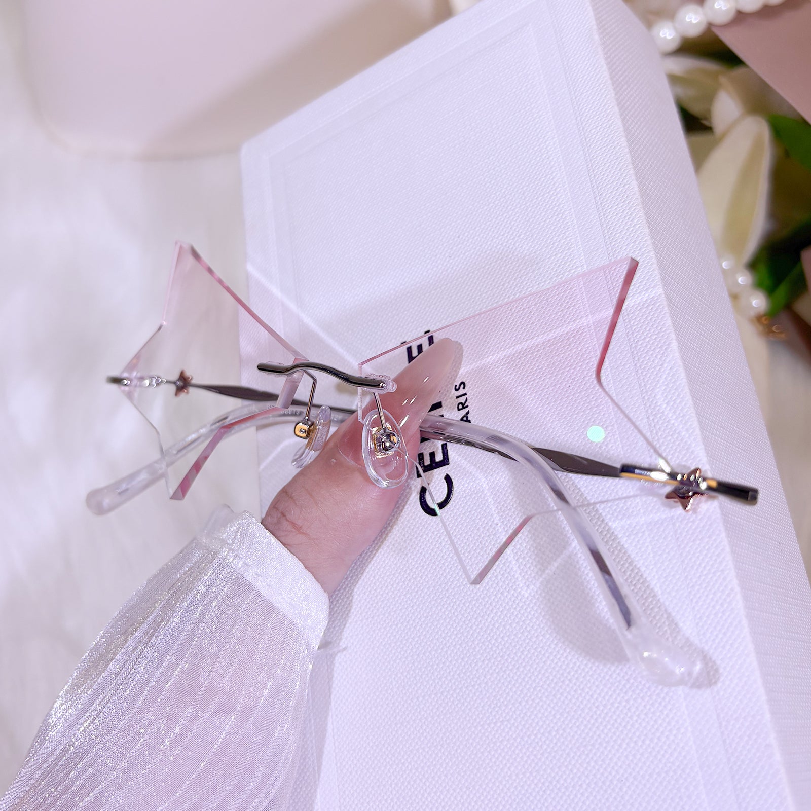 | Exclusive Design | These striking rimless glasses feature bold star-shaped lenses that instantly evoke the brilliance of a supernova. A tiny star detail on the sleek temples adds an extra touch of charm, making this design both playful and fashion-forward for anyone who dares to shine bright.