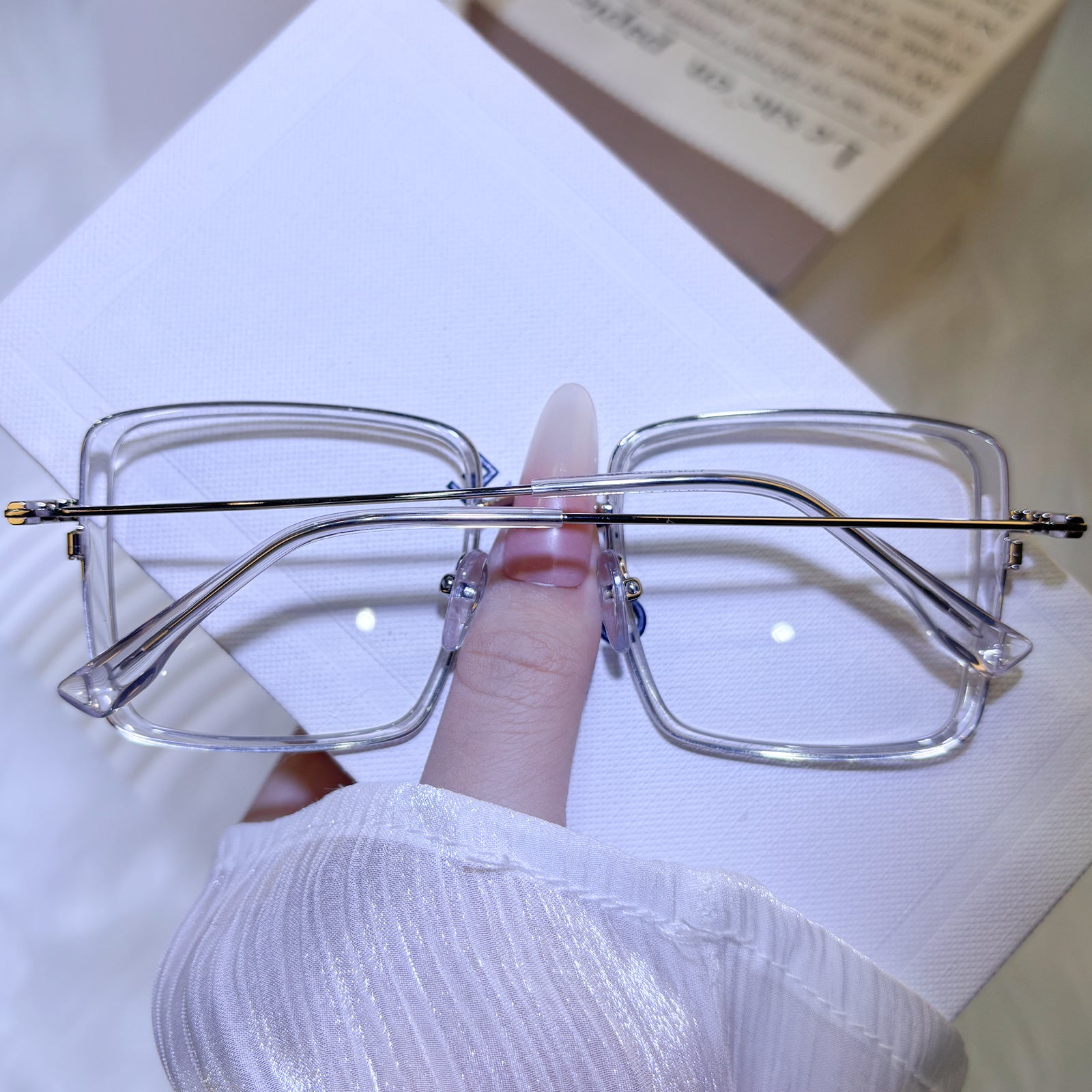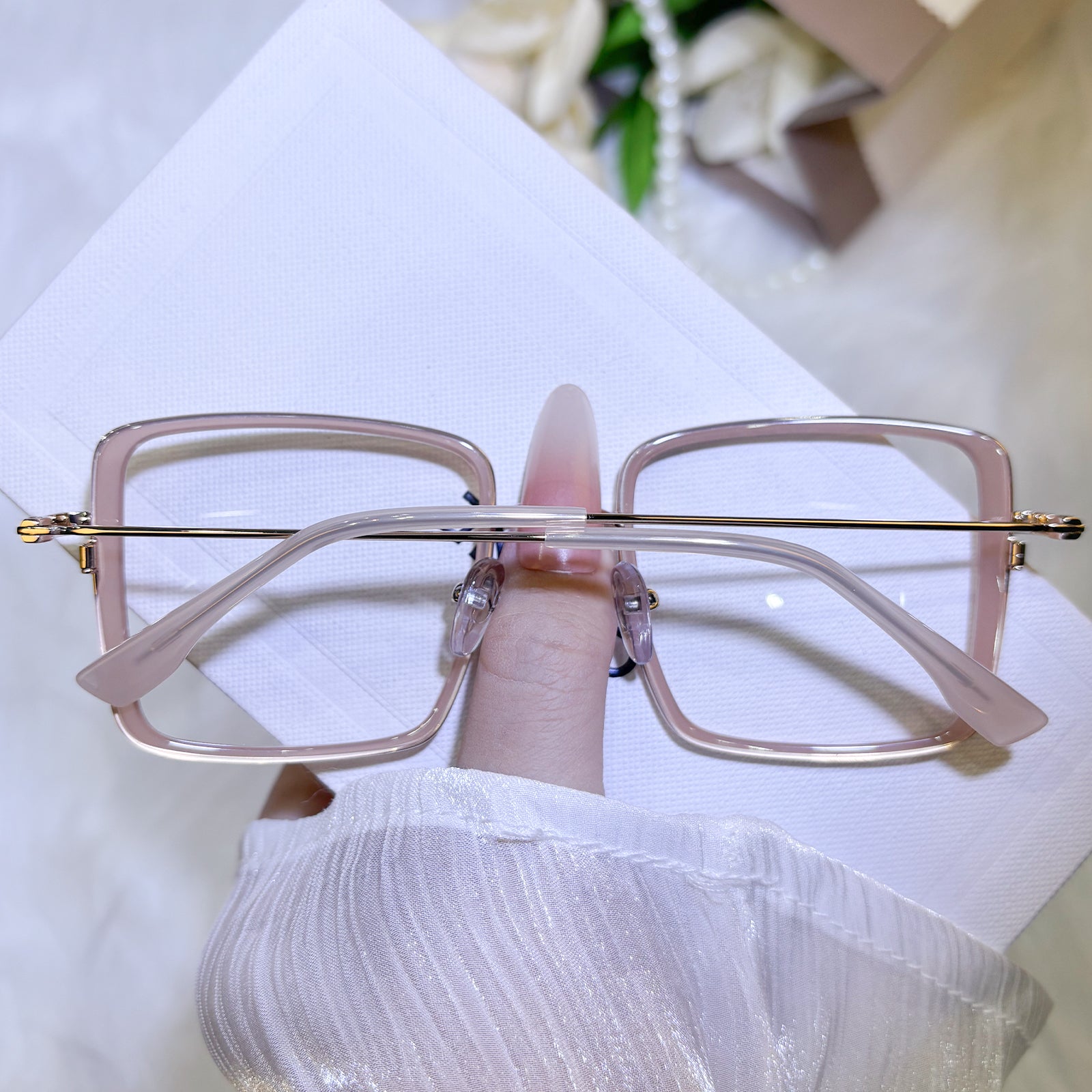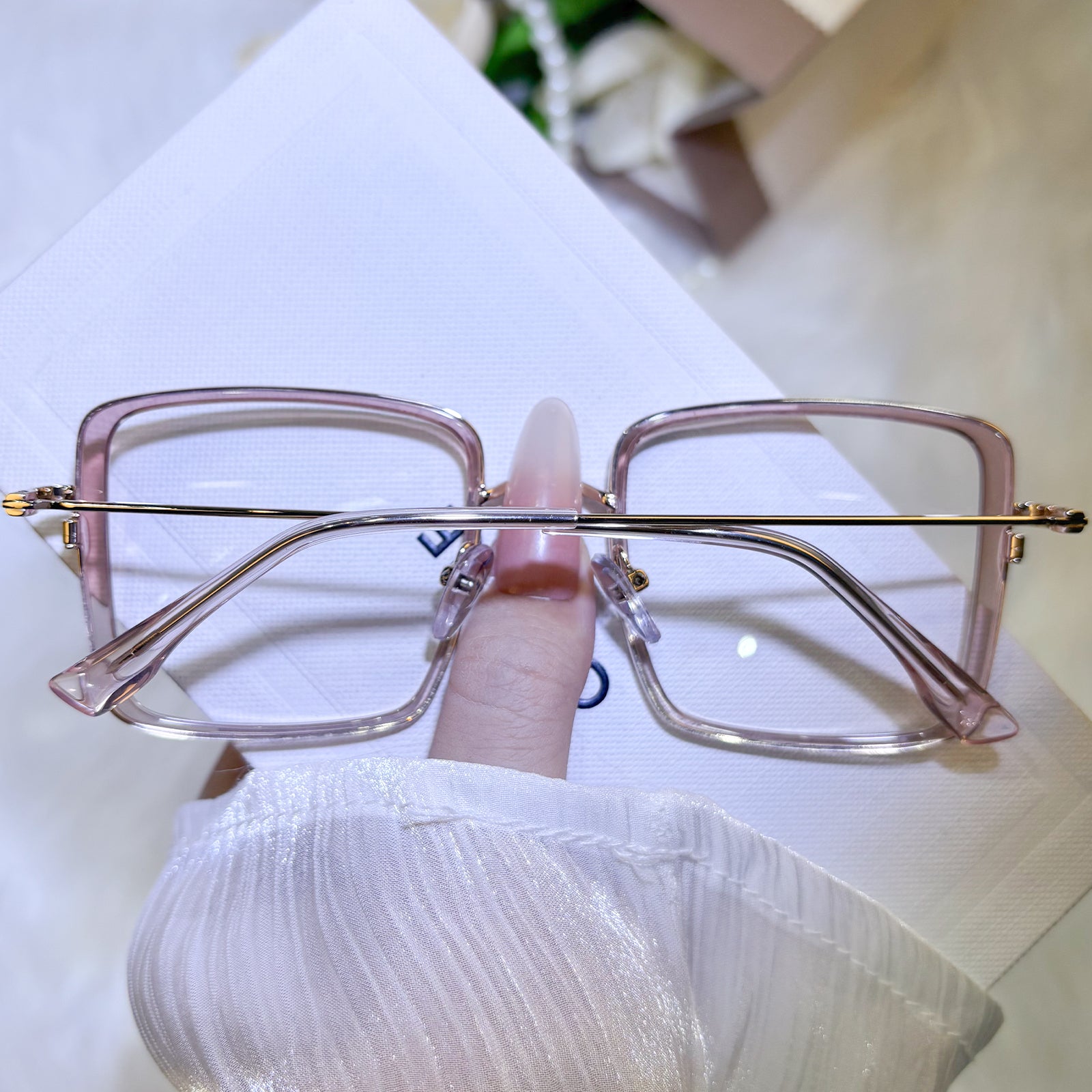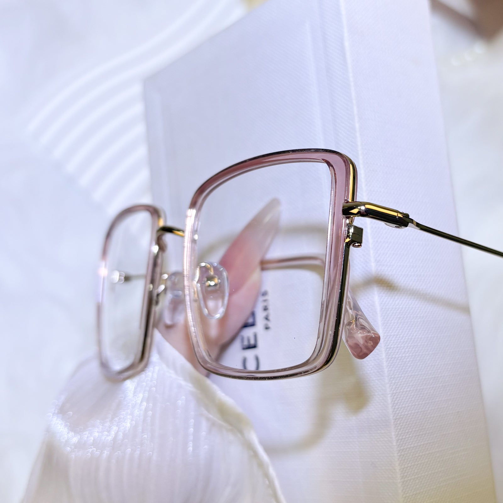 A modern study in square proportions and intentional color, these glasses present transparent for architectural lightness, blush for feminine subtlety, fuchsia for playful strength, and black for metropolitan edge. Each frame proves that simplicity becomes extraordinary through thoughtful chromatic choices.