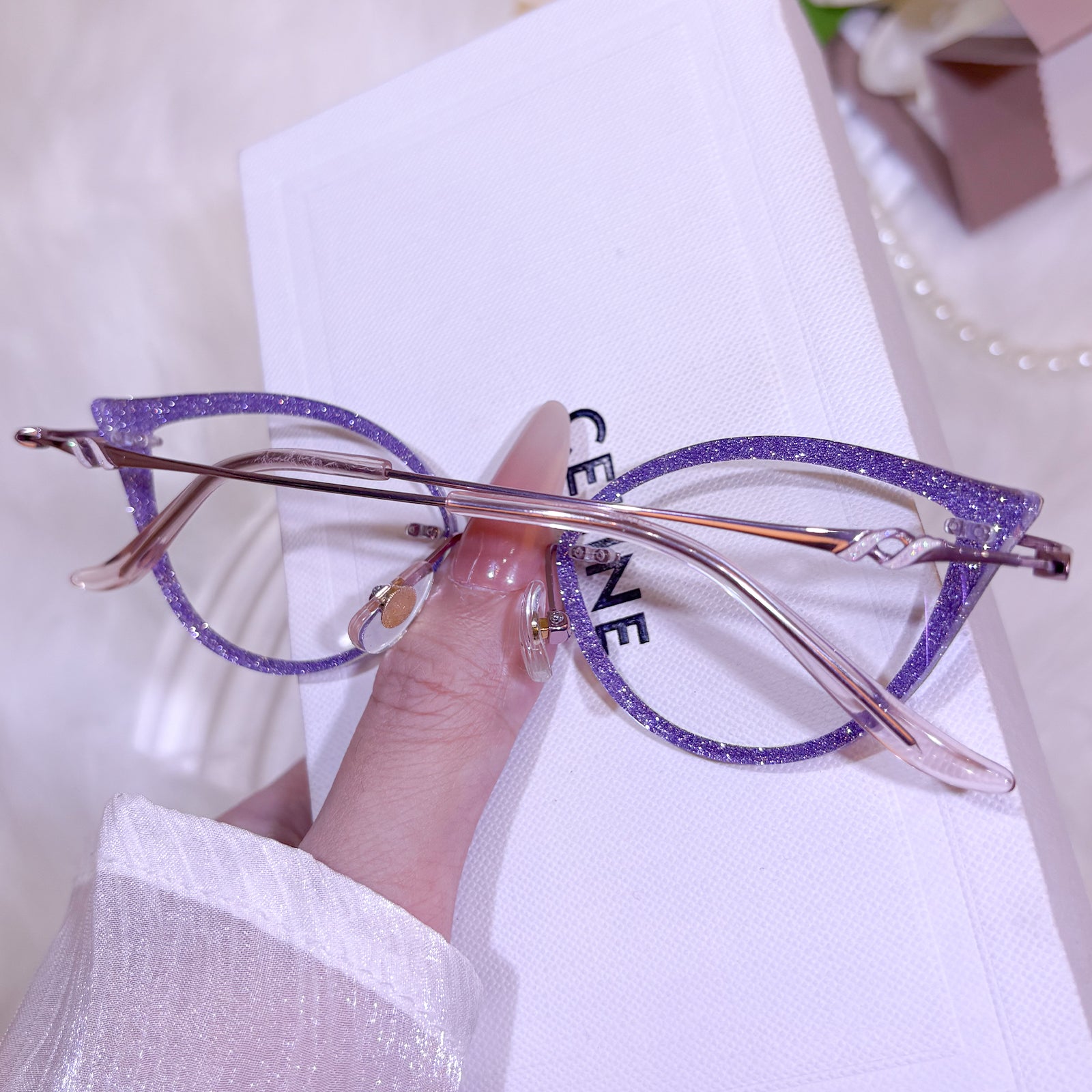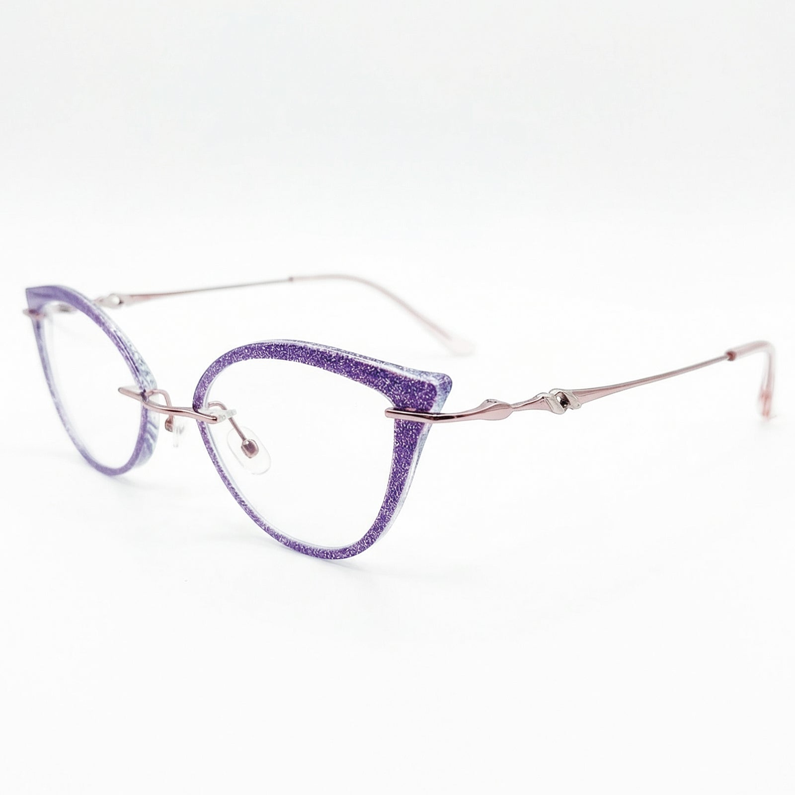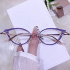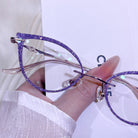 | Exclusive Design | These ultra-cool new fox-eye rimless glasses feature sleek, elongated lenses accented with shimmering glitter for a bold and futuristic look. Paired with exquisitely decorated, luxurious temples, this striking design delivers high-fashion attitude and standout glamour for anyone who loves edgy, statement eyewear.