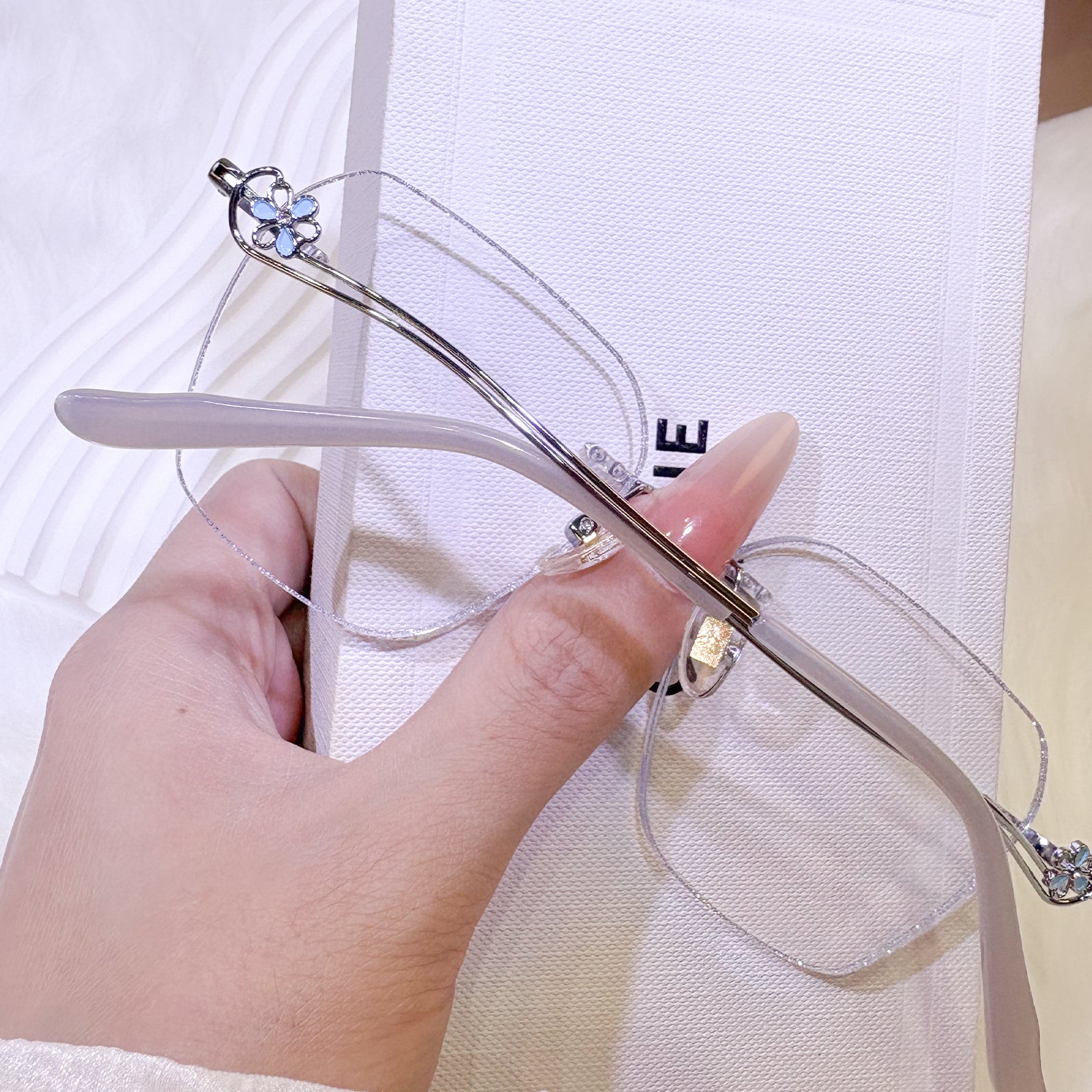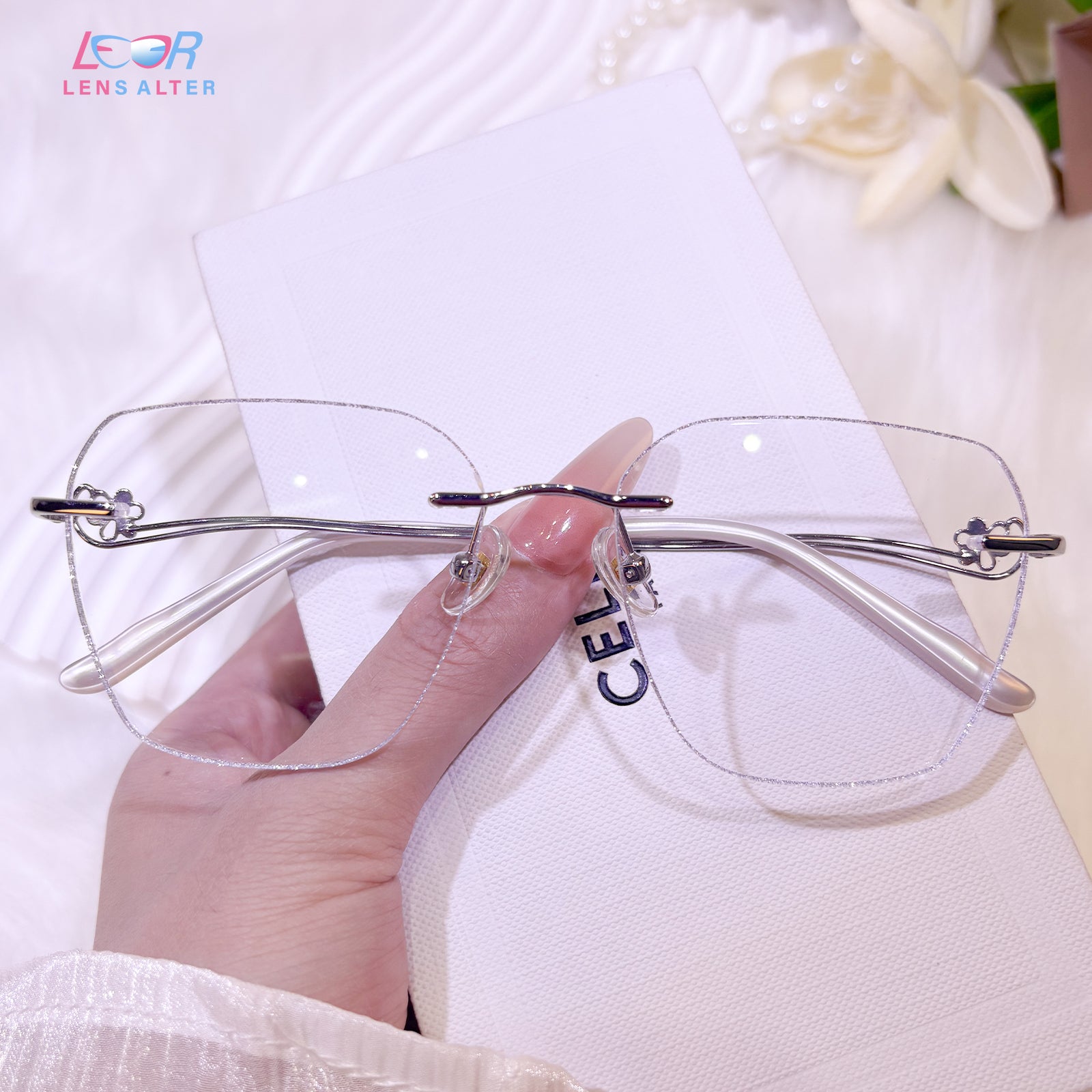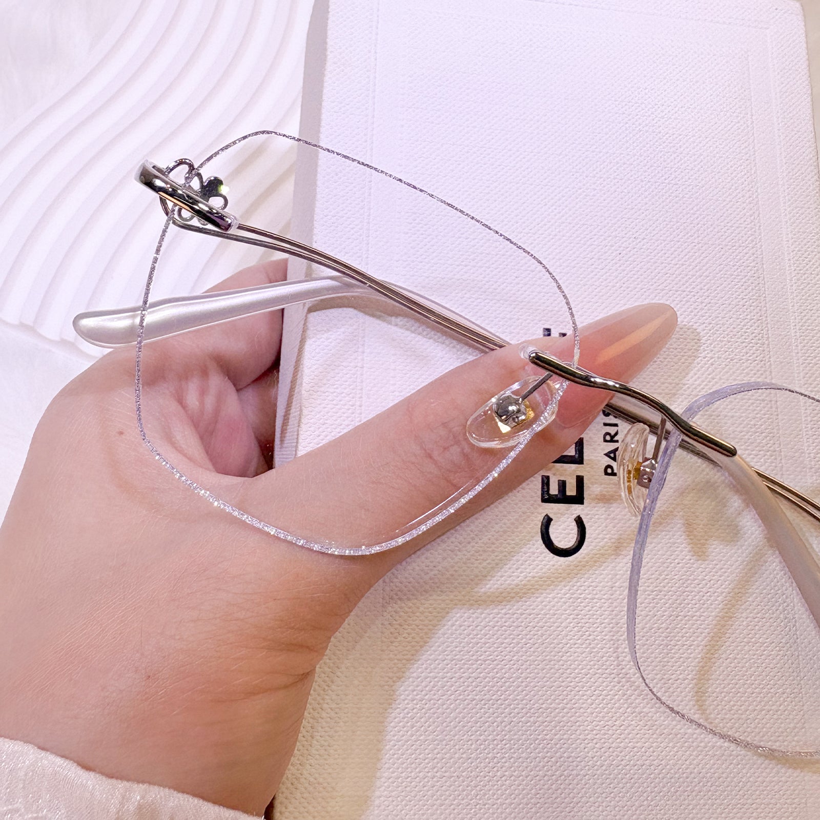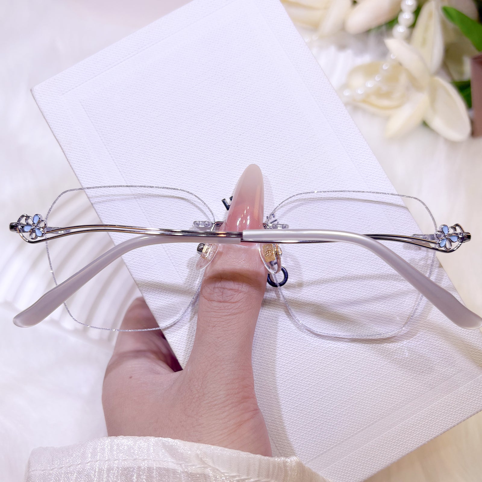 | Exclusive Design | These elegant rimless geometric glasses are delicately framed with silver glitter around the lenses, adding a soft sparkle. The slender temples are adorned with tiny floral accents, creating a refined and feminine charm.