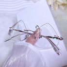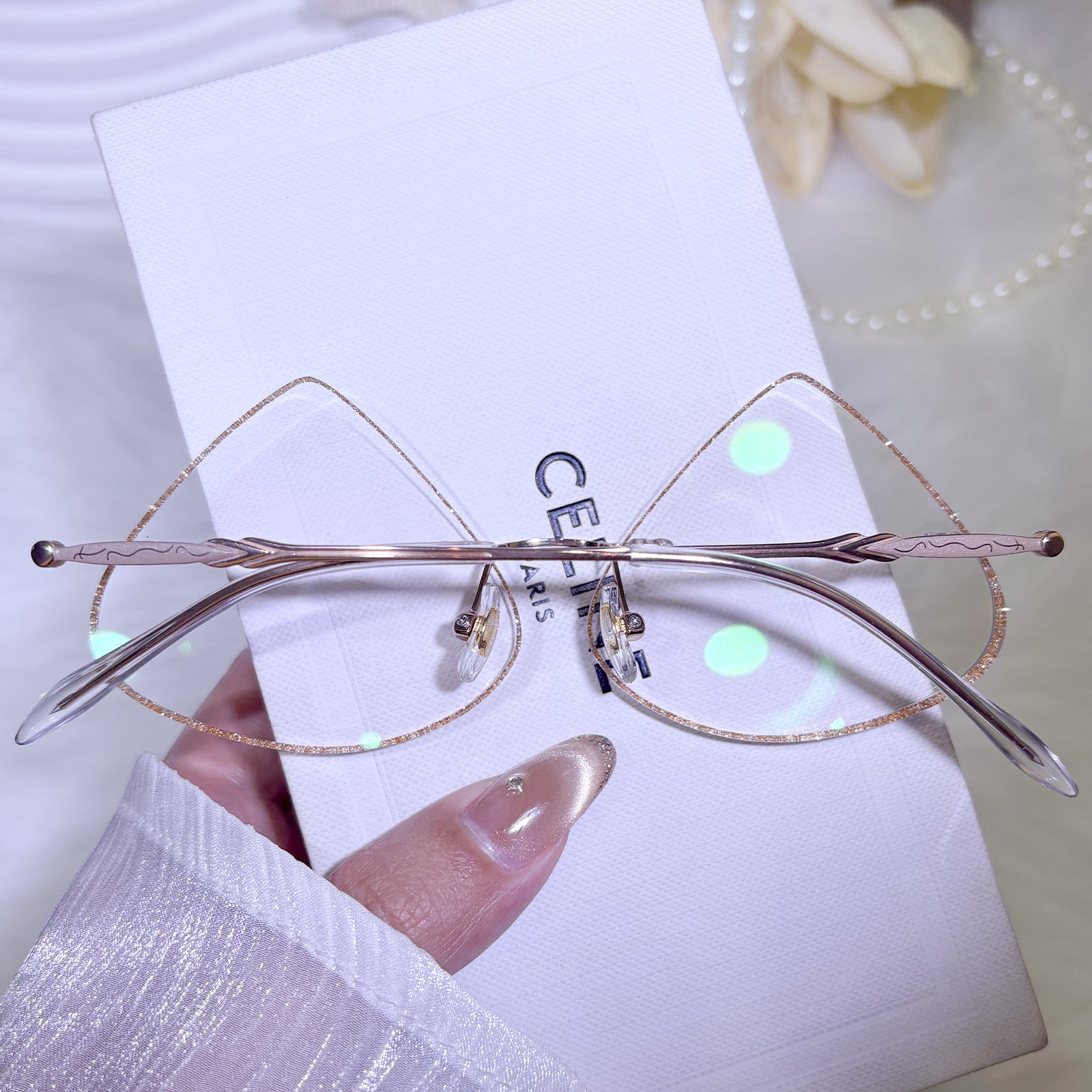 | Exclusive Design | Designed in a graceful golden teardrop silhouette, this rimless eyewear sparkles with shimmering glitter across the lenses. Radiant and eye-catching, the luminous finish adds a touch of elegance and glamour, making it a truly standout accessory.