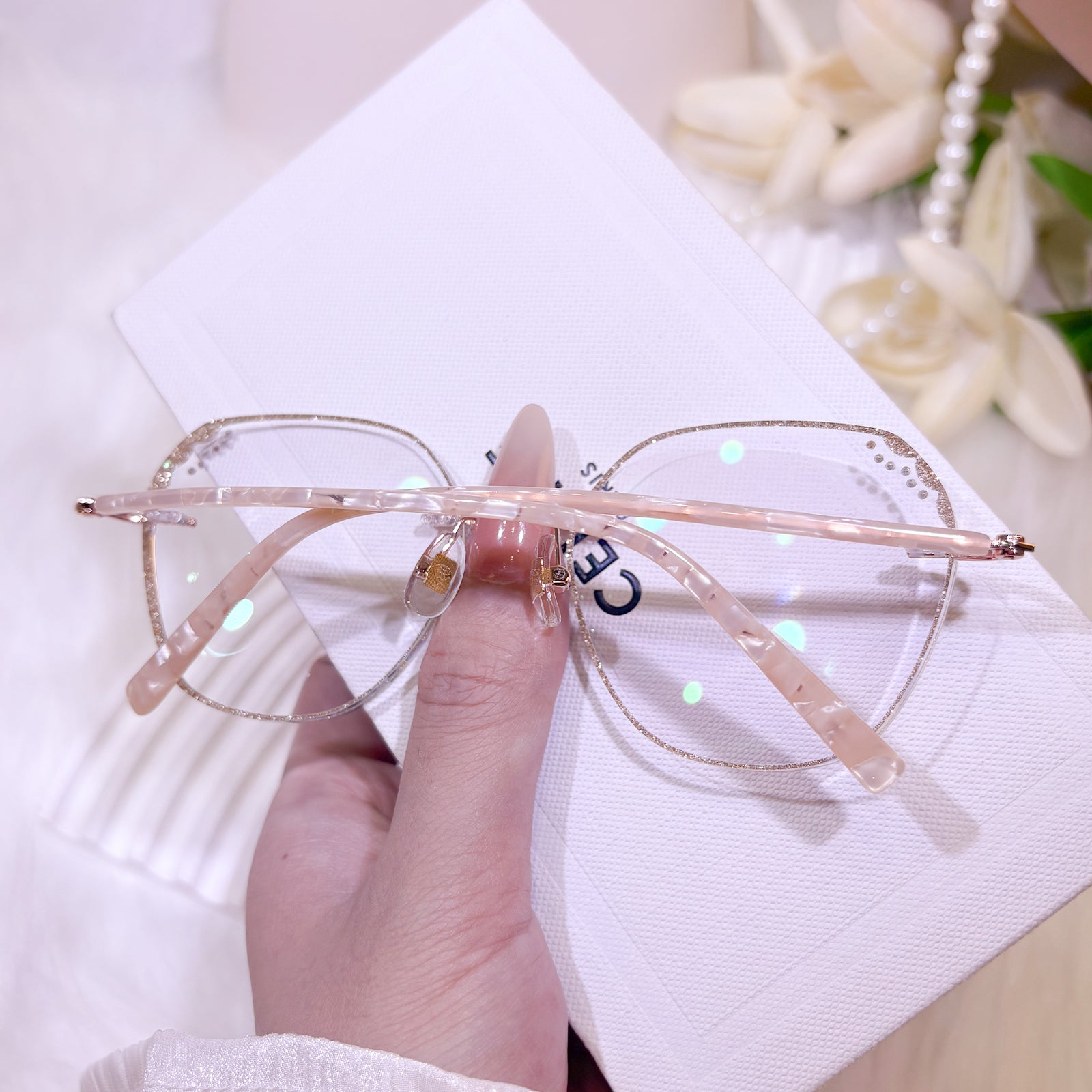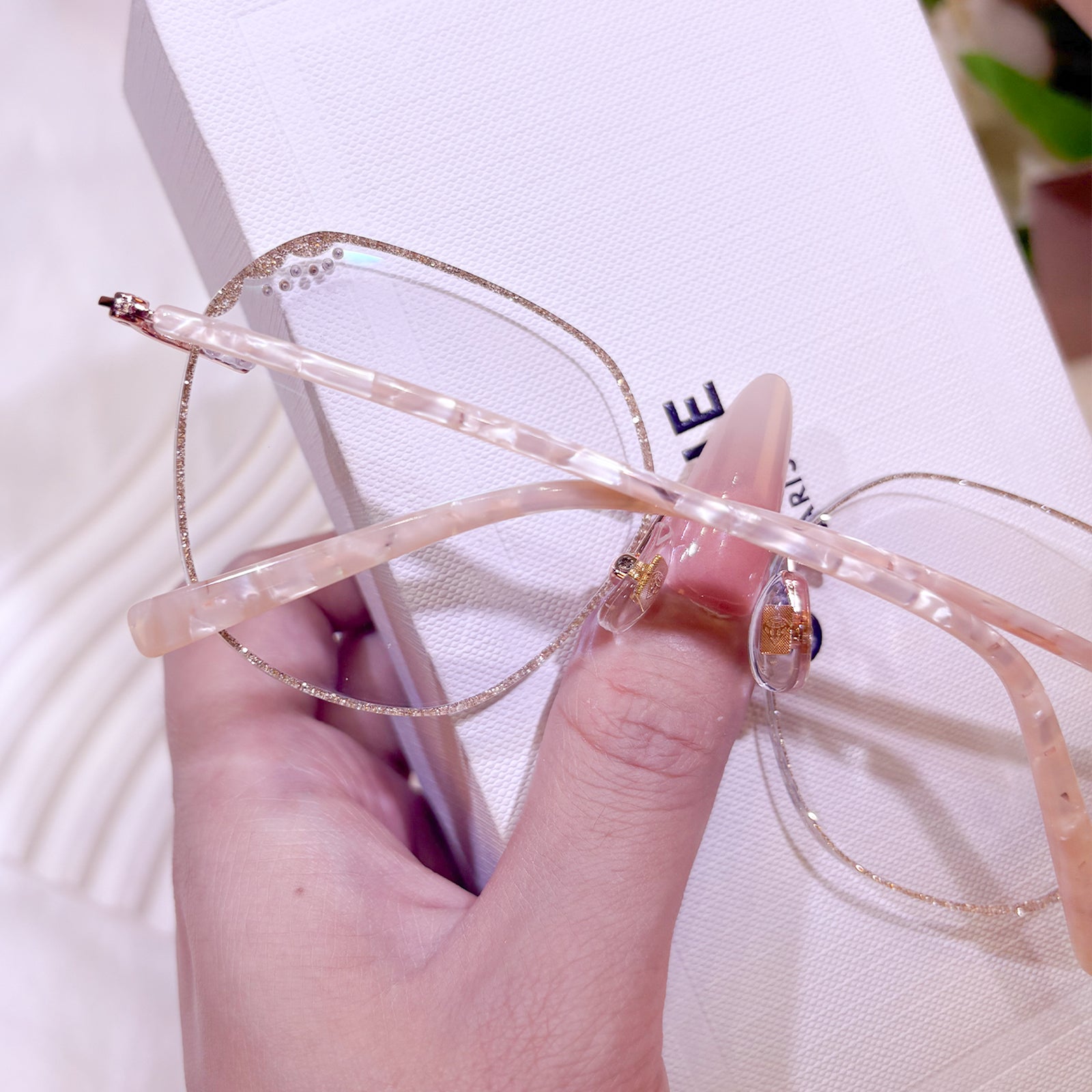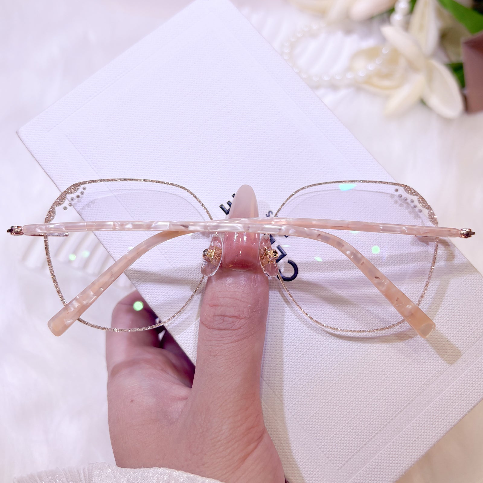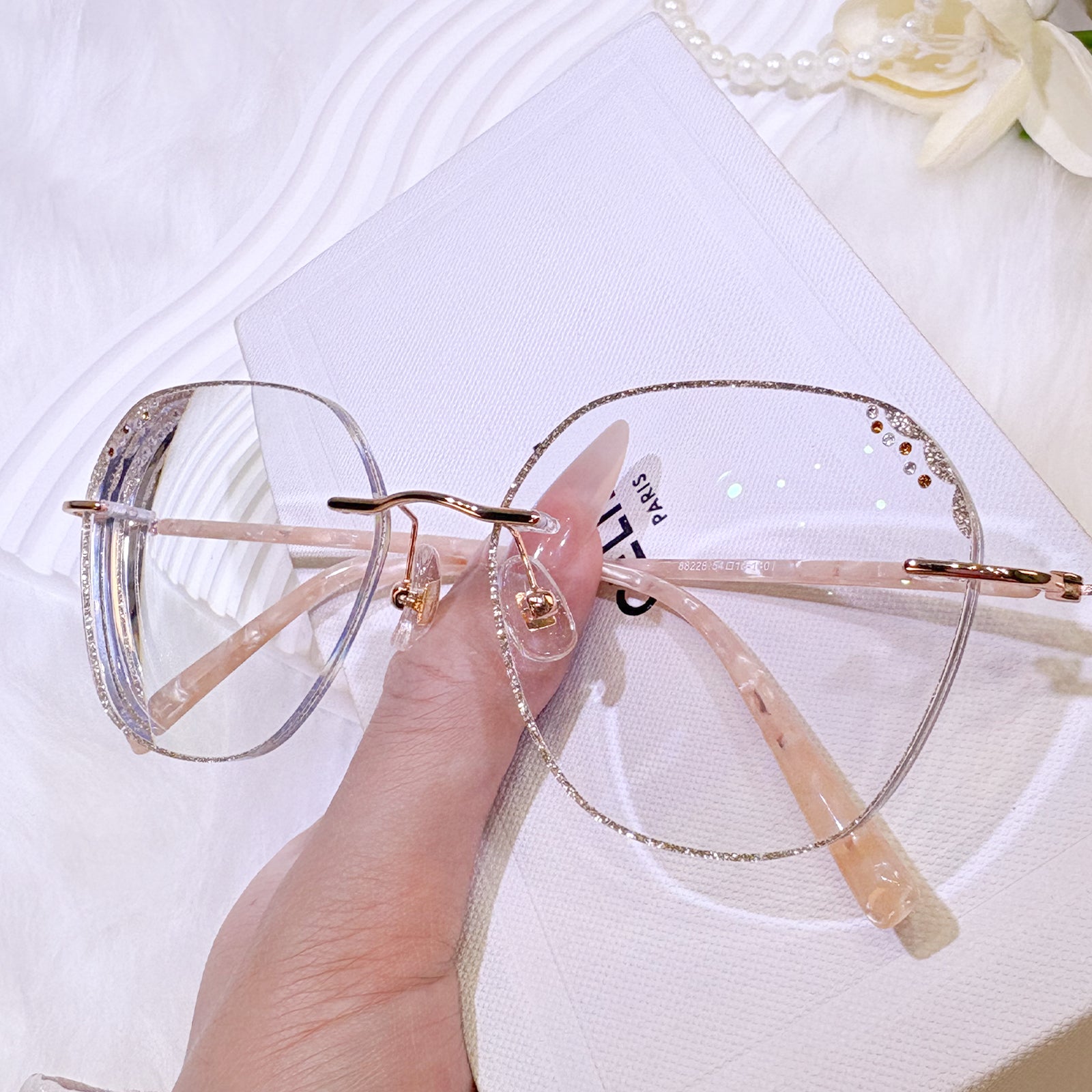| Exclusive Design | These geometric rimless glasses feature lenses adorned with sparkling champagne gold glitter and delicate rhinestone accents. The ultra-slim temples add a refined, lightweight feel, making this pair a dazzling statement for anyone who loves elegance with a touch of glamour.