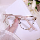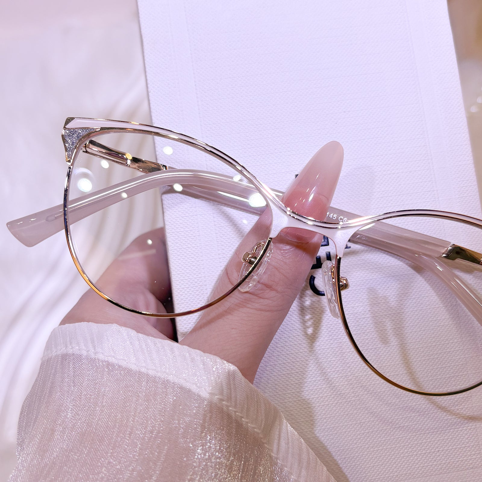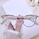 These impeccably refined glasses feature a delicate cat-eye shape, achieved with a sophisticated frameless metal structure. The design offers a subtle, refined uplift that highlights timeless elegance with a whisper of playfulness. A perfect choice for those who seek eyewear that combines minimalist grace with a hint of feminine charm.