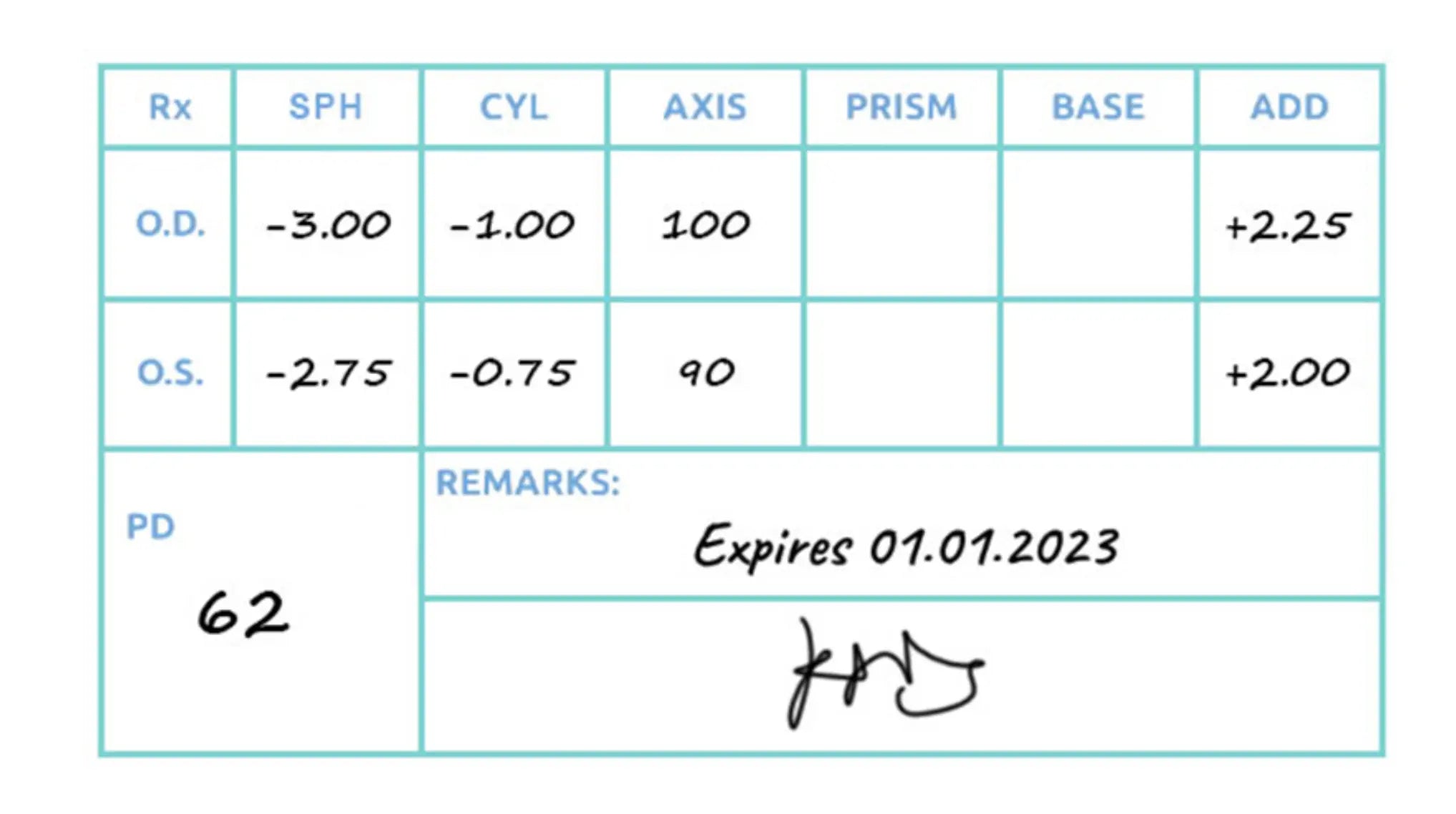 Your Prescription (RX) is what an ophthalmologist (an MD) or optometrist (a doctor of optometry) provides to correct your vision with a pair of eyeglasses with corrective lenses.