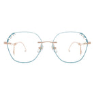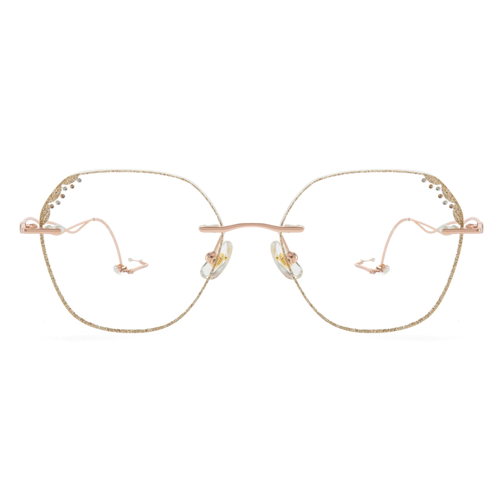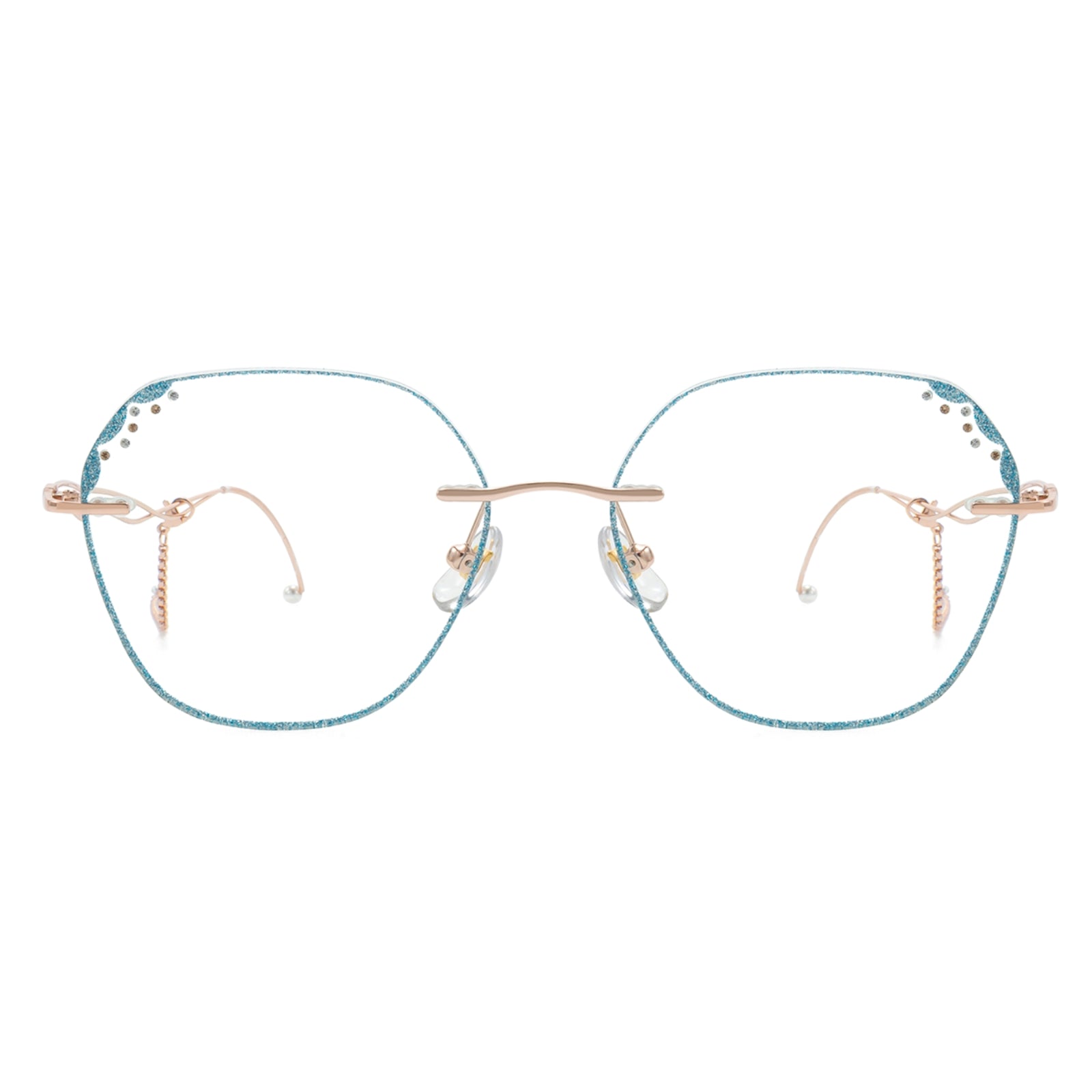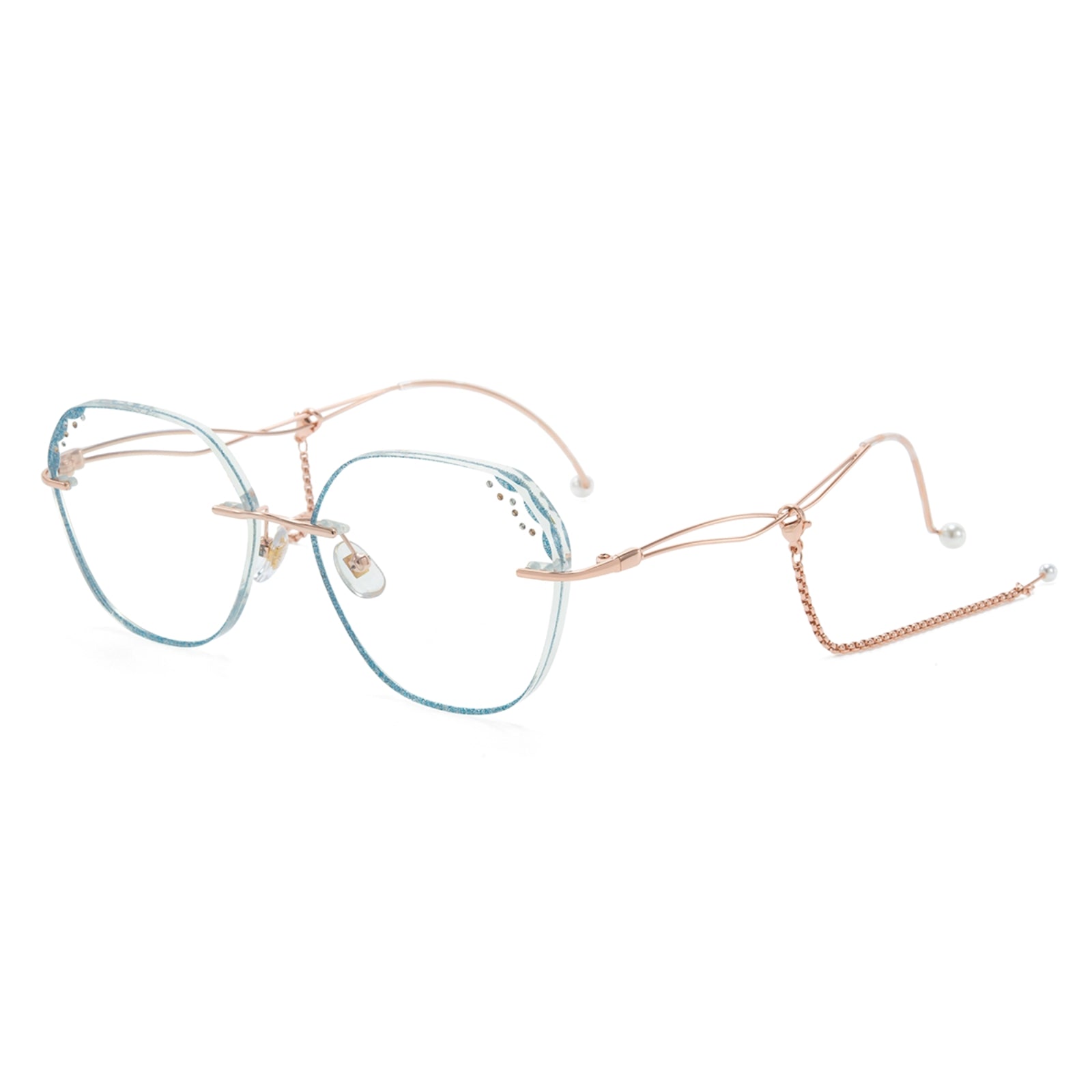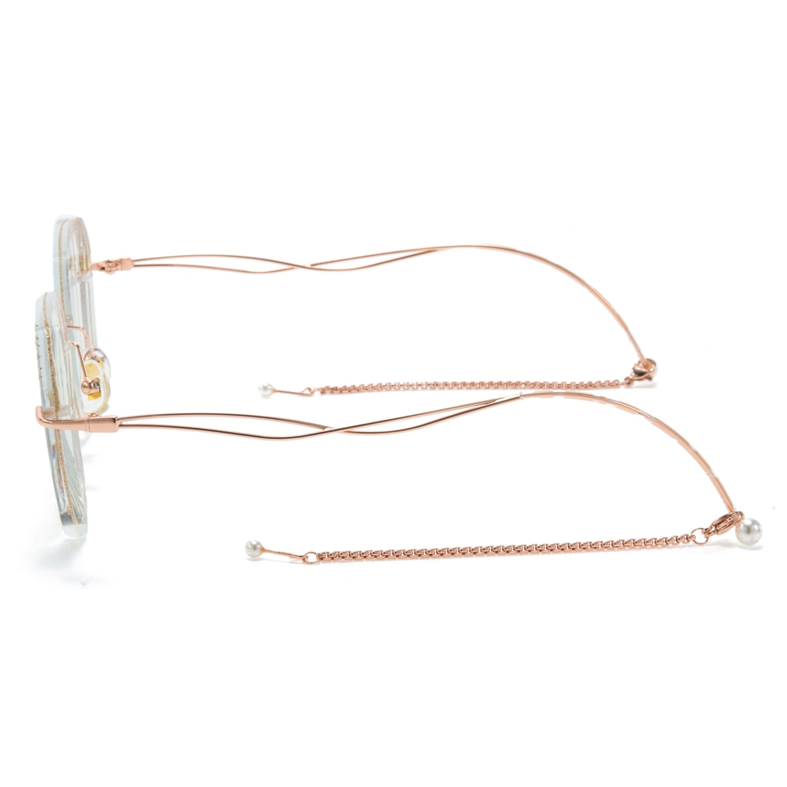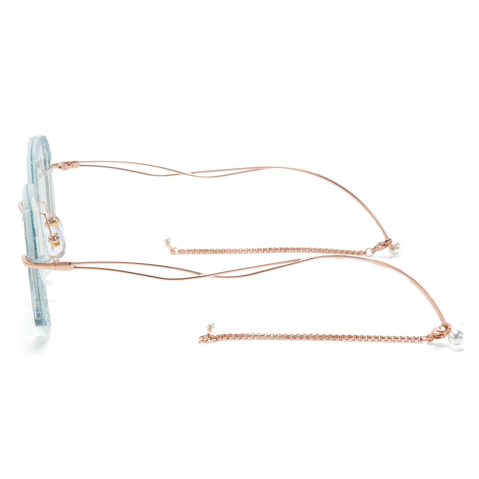 Aurora stylish eyeglasses feature a streamlined, intersecting temple design that creates a captivating look. The lenses are accented with diamond-inspired details for a brilliant, dazzling effect. Temple ends are adorned with dangling beads, and a lightweight, detachable chain is included for convenient wear. Elevate your style with Aurora chic eyeglasses!