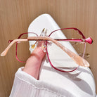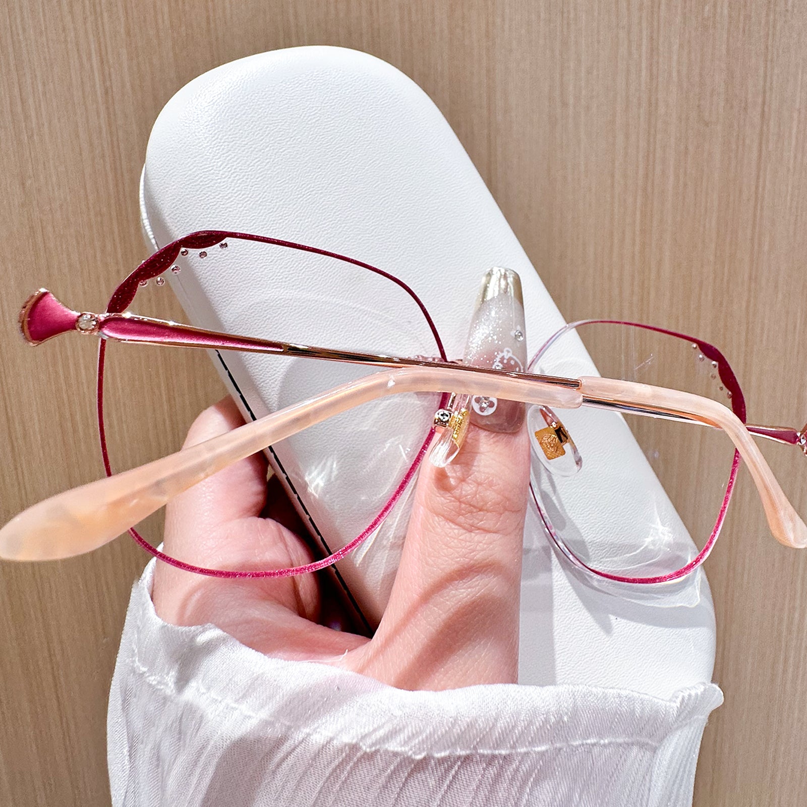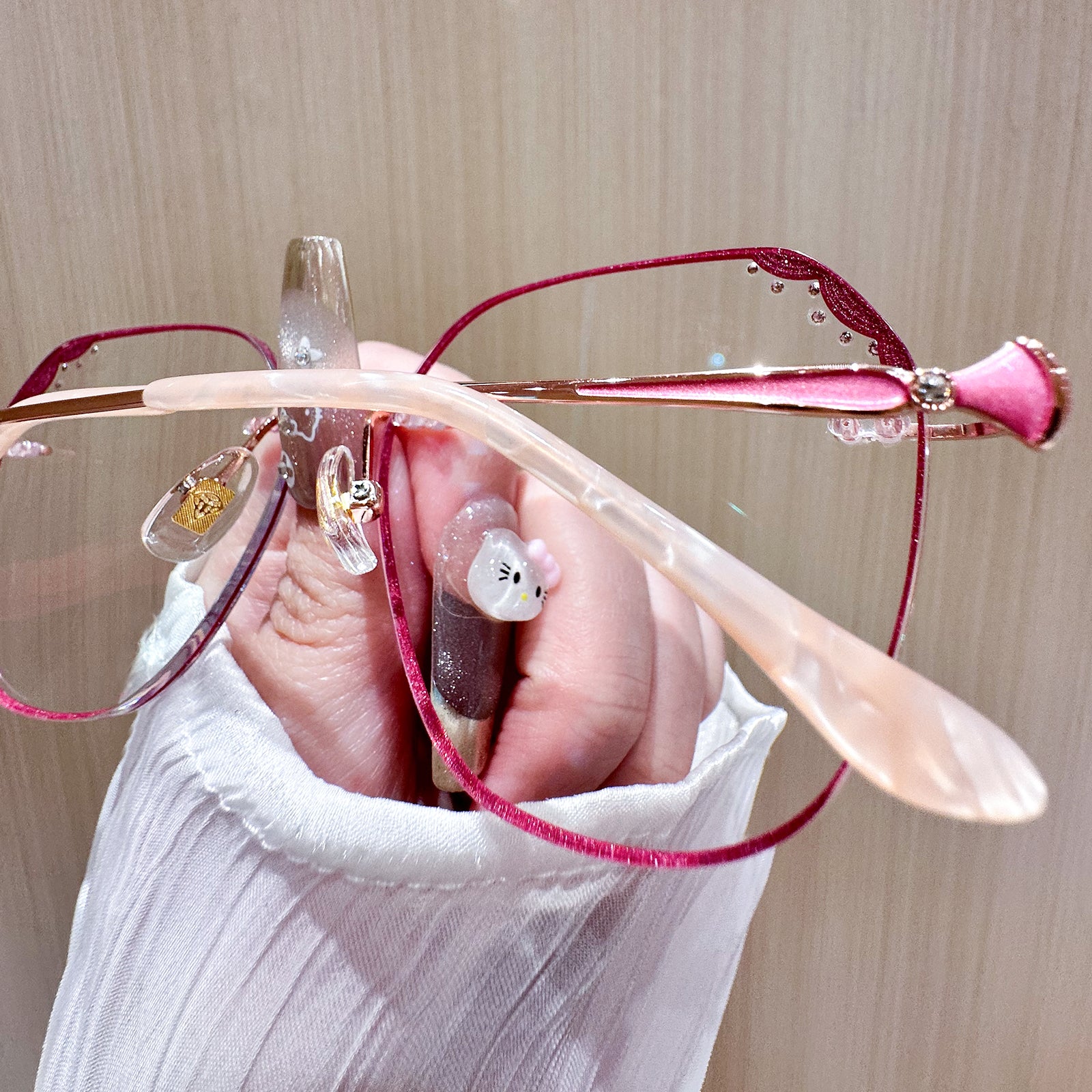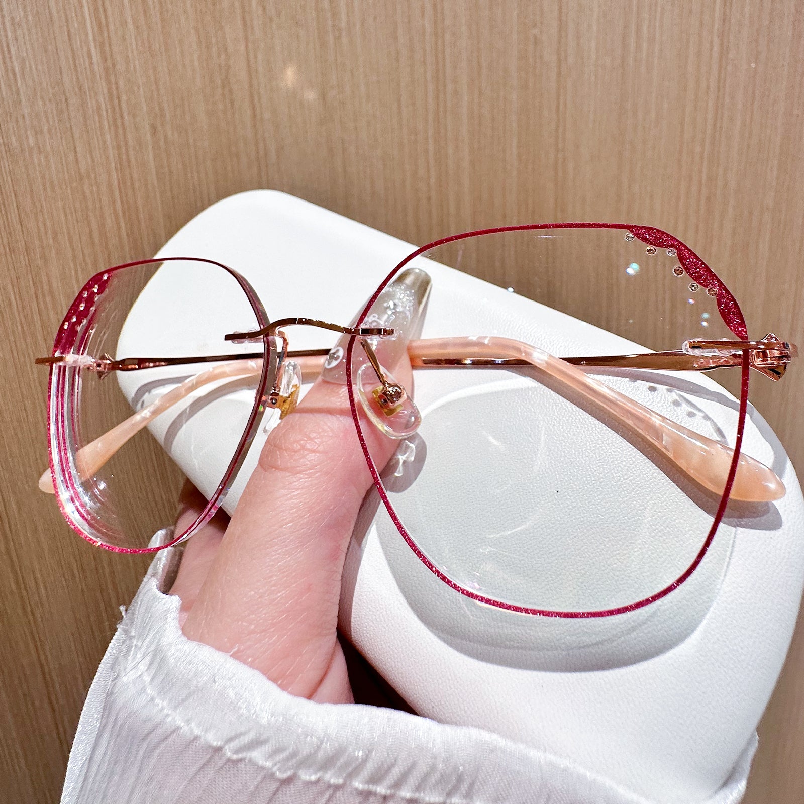 Make a statement with these bold geometric rimless glasses, featuring stunning deep pink glitter on the lenses that catches the light with every movement. Perfect for adding a pop of color and sparkle to your look, these frames blend modern design with a touch of glamour, making them the ideal accessory for those who love to stand out with elegance and shine.