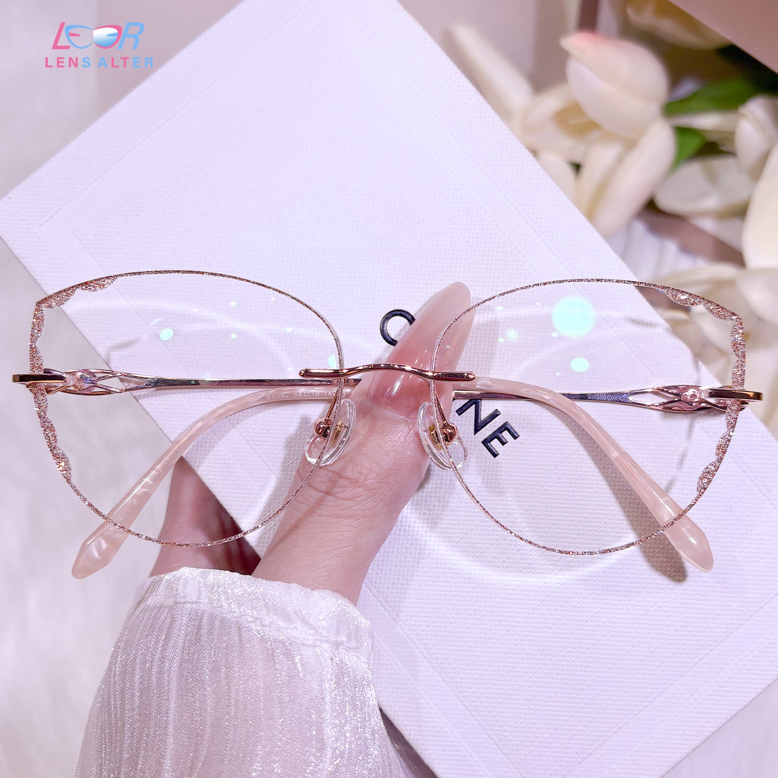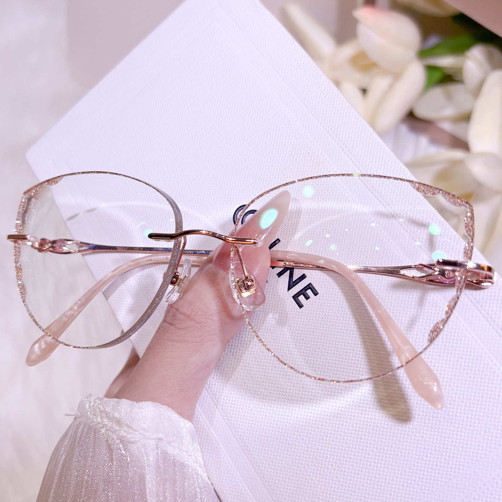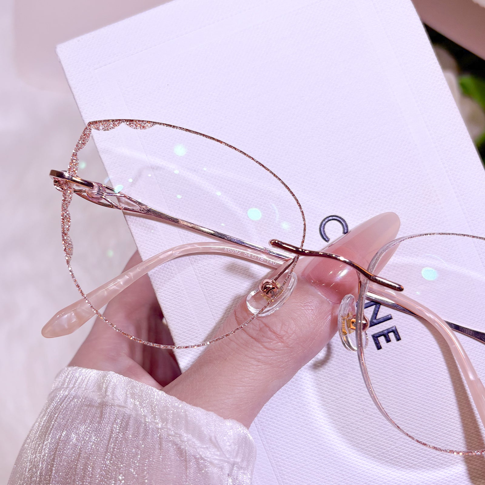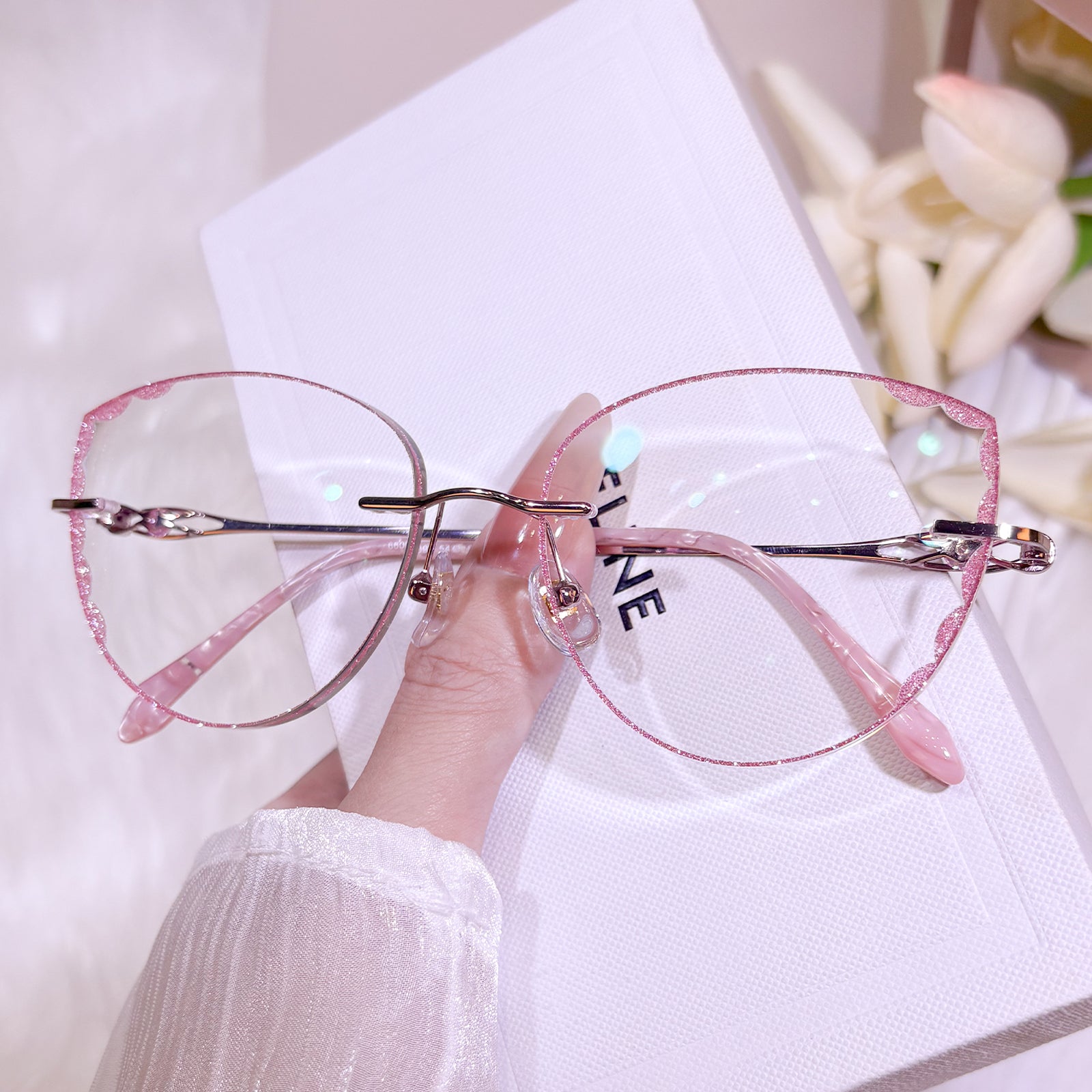 Cat-Eye Rimless Glasses for Women–sparkling lenses with heart-shaped temples, add a touch of charm with these adorable cat-eye rimless glasses. The lenses are adorned with shimmering glitter, while the heart-shaped details on the temples bring a playful, sweet vibe.
