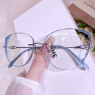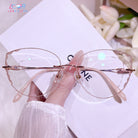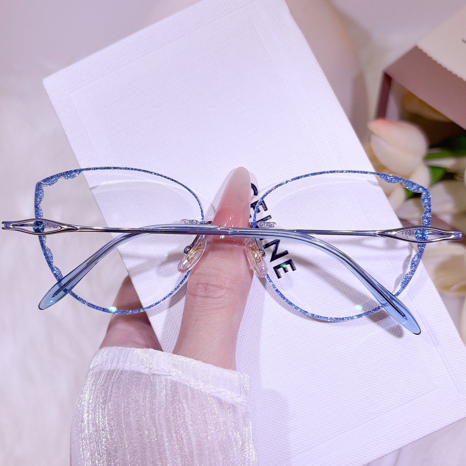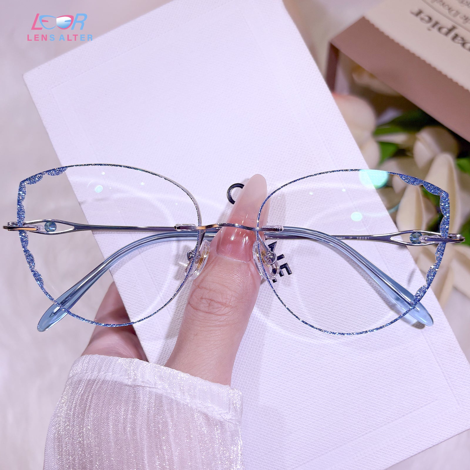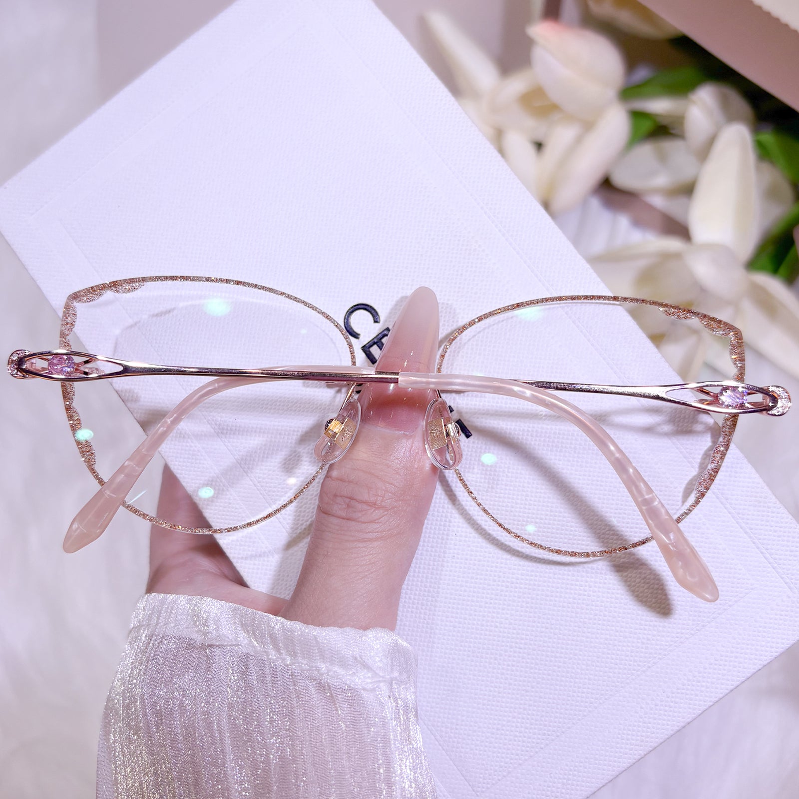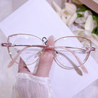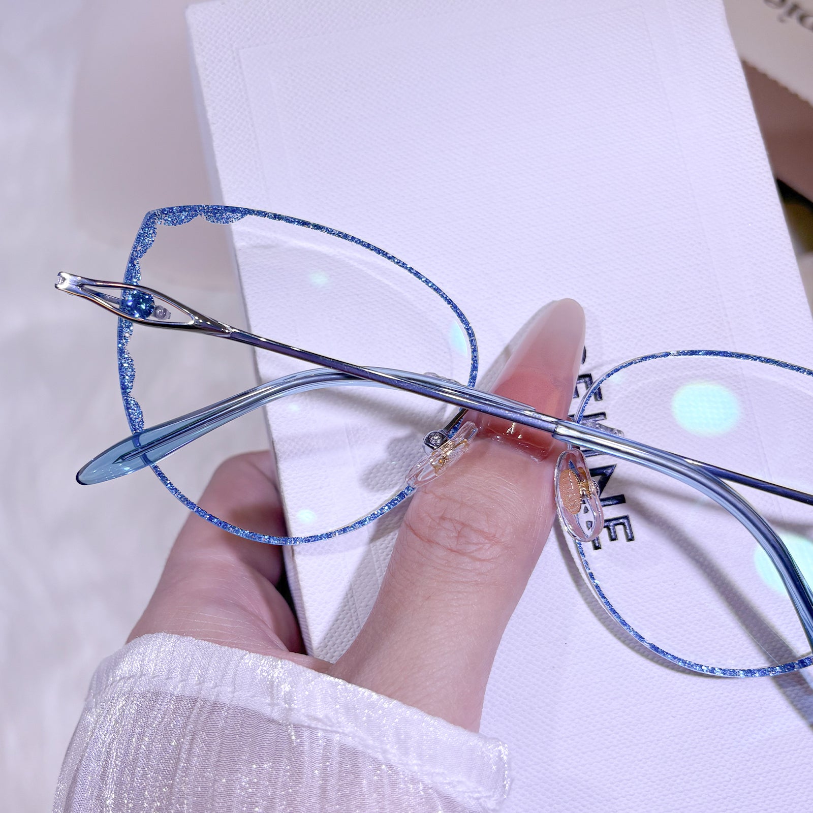 Cat-Eye Rimless Glasses for Women–sparkling lenses with heart-shaped temples, add a touch of charm with these adorable cat-eye rimless glasses. The lenses are adorned with shimmering glitter, while the heart-shaped details on the temples bring a playful, sweet vibe.