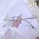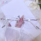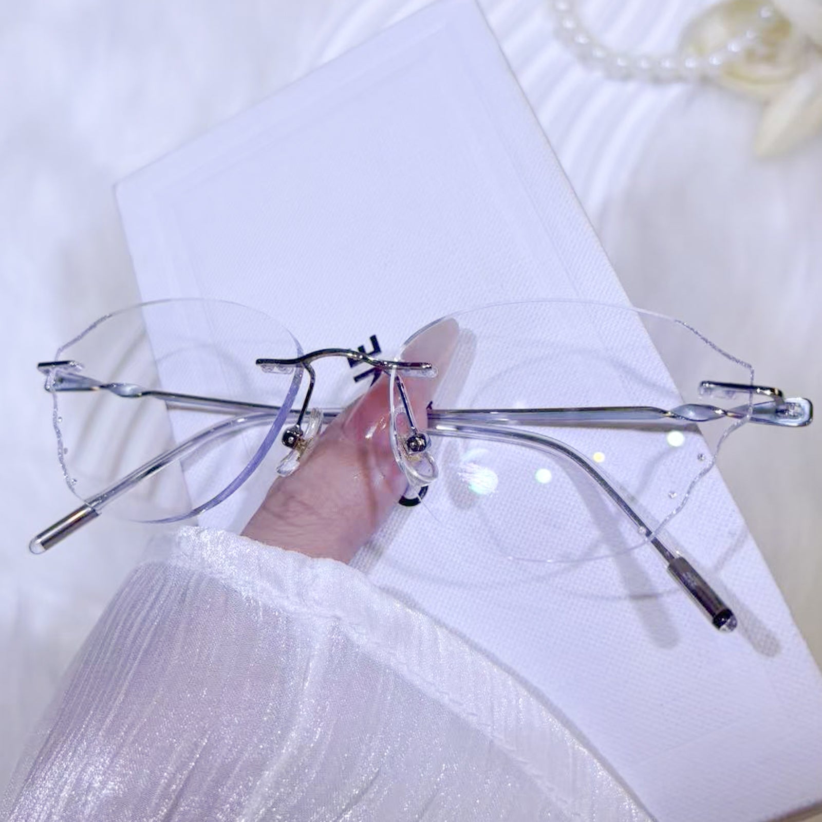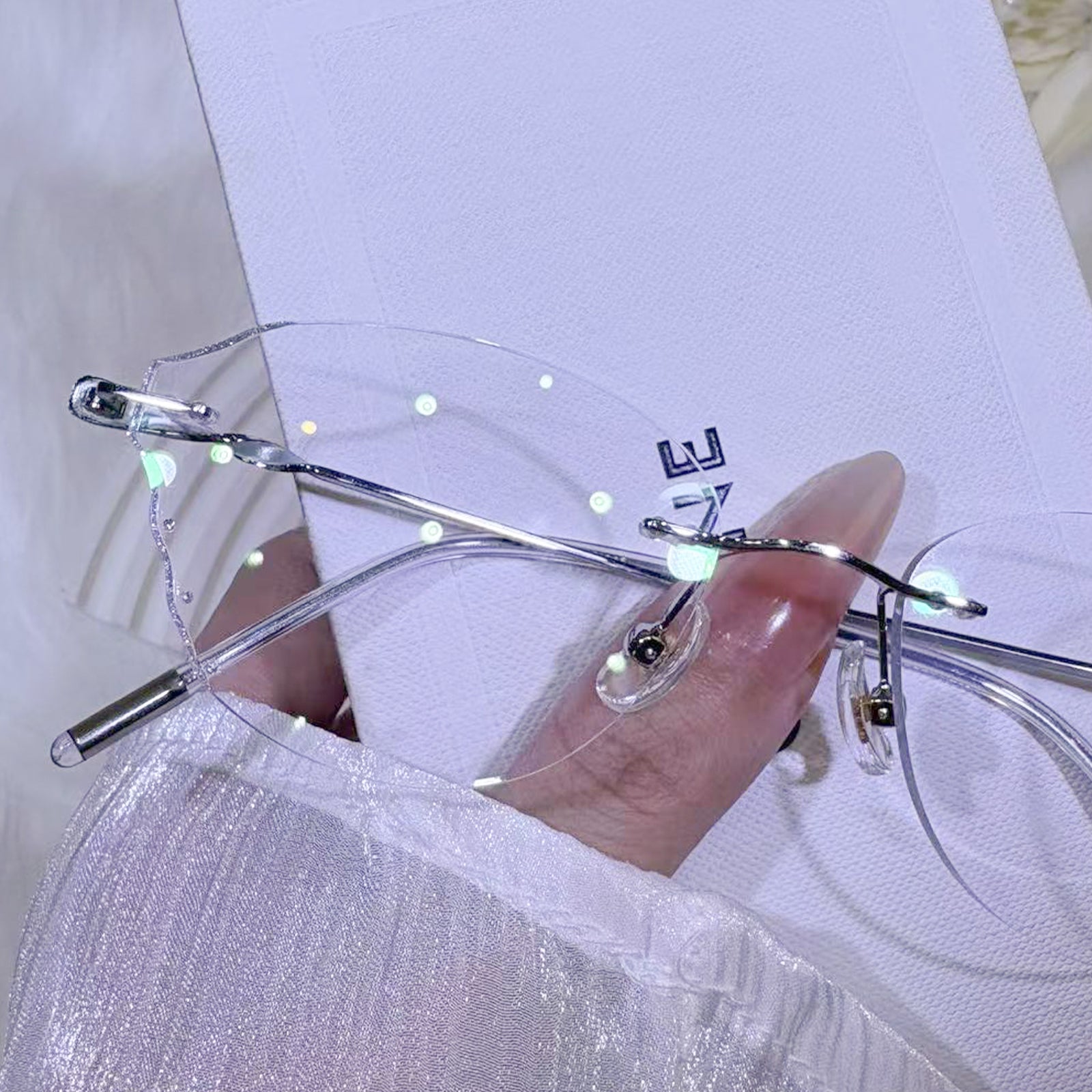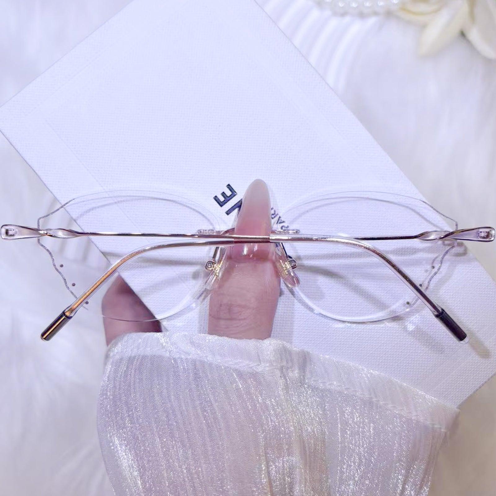 Inspired by delicate butterfly wings, these rimless glasses feature sparkling glitter and diamond accents on the lenses for a truly graceful look. Crafted from metal, they combine lightweight durability with refined elegance. Perfect for those who want to make a sophisticated, eye-catching statement.