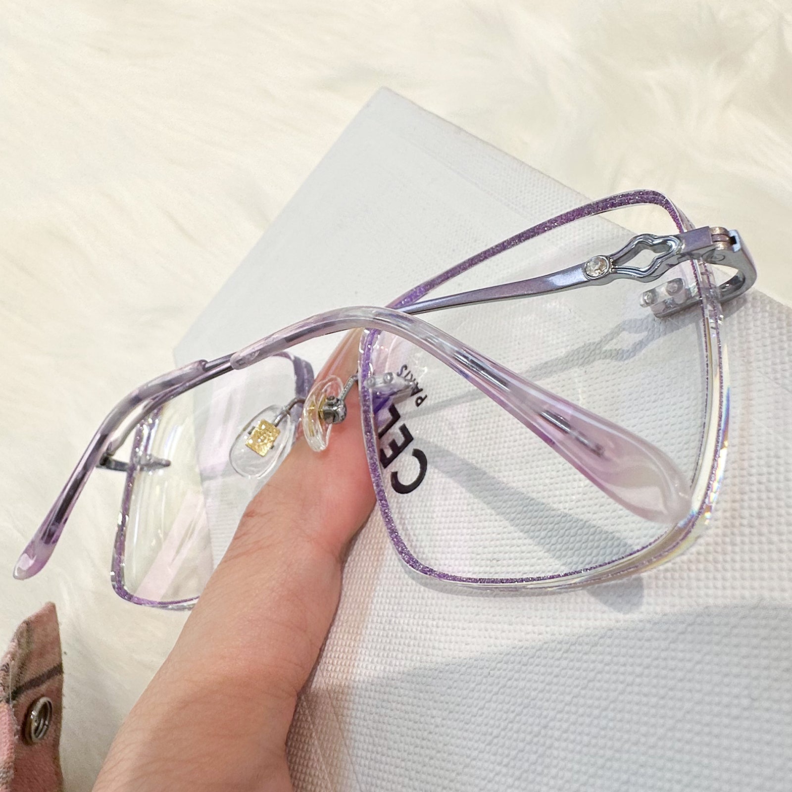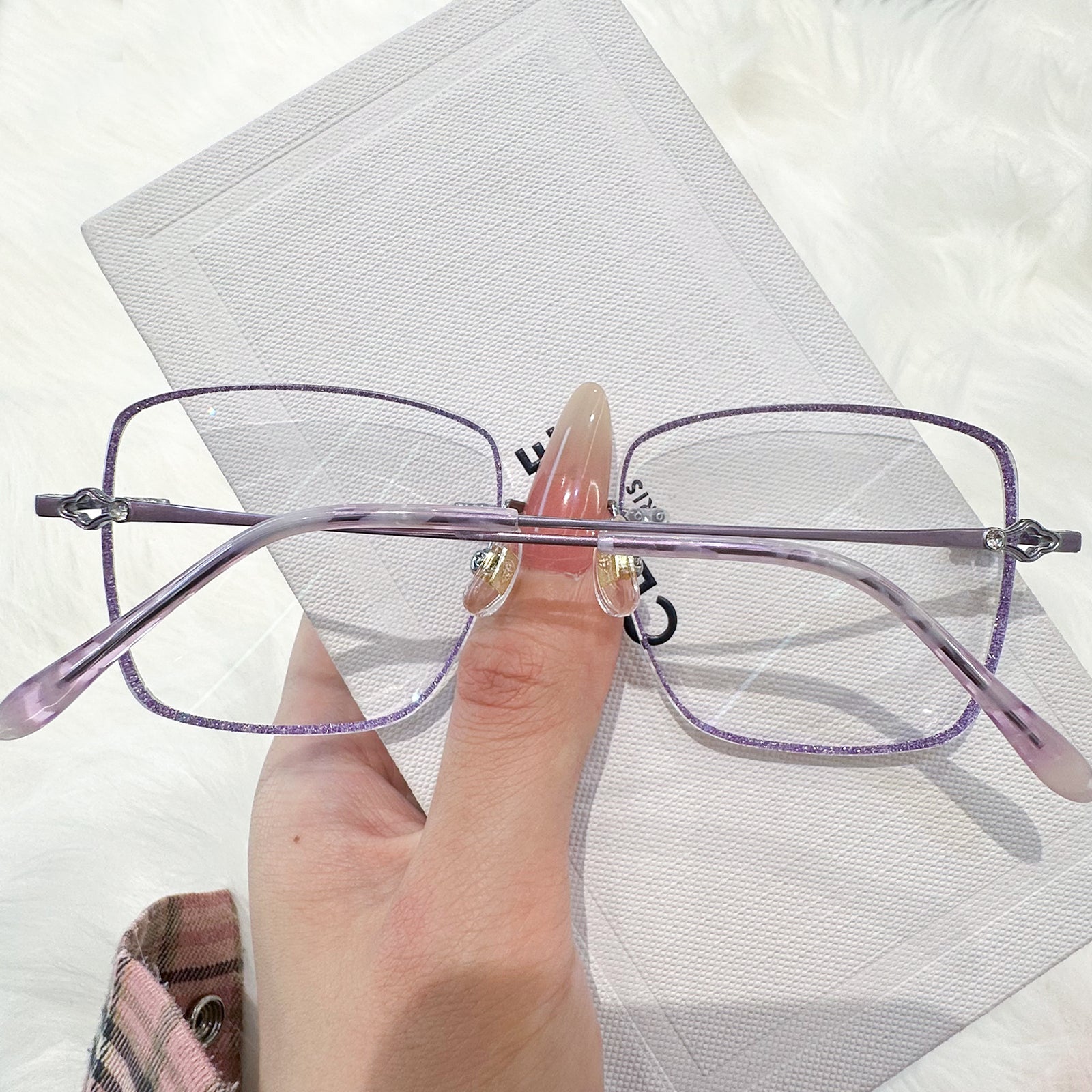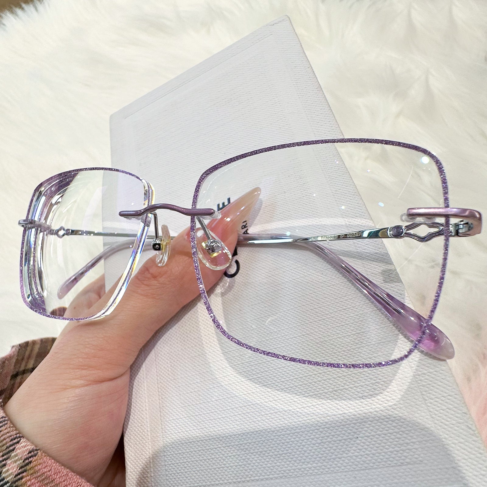 |Exclusive Design | Purple Glitter Square Rimless Glasses – a charming fusion of sparkle and sophistication. The square-shaped rimless lenses are adorned with fine purple glitter, adding a soft, dreamy glow to your look. Sleek metal temples are enhanced with elegant decorative details, making this pair both graceful and eye-catching. Perfect for adding a magical, feminine touch to your everyday style.