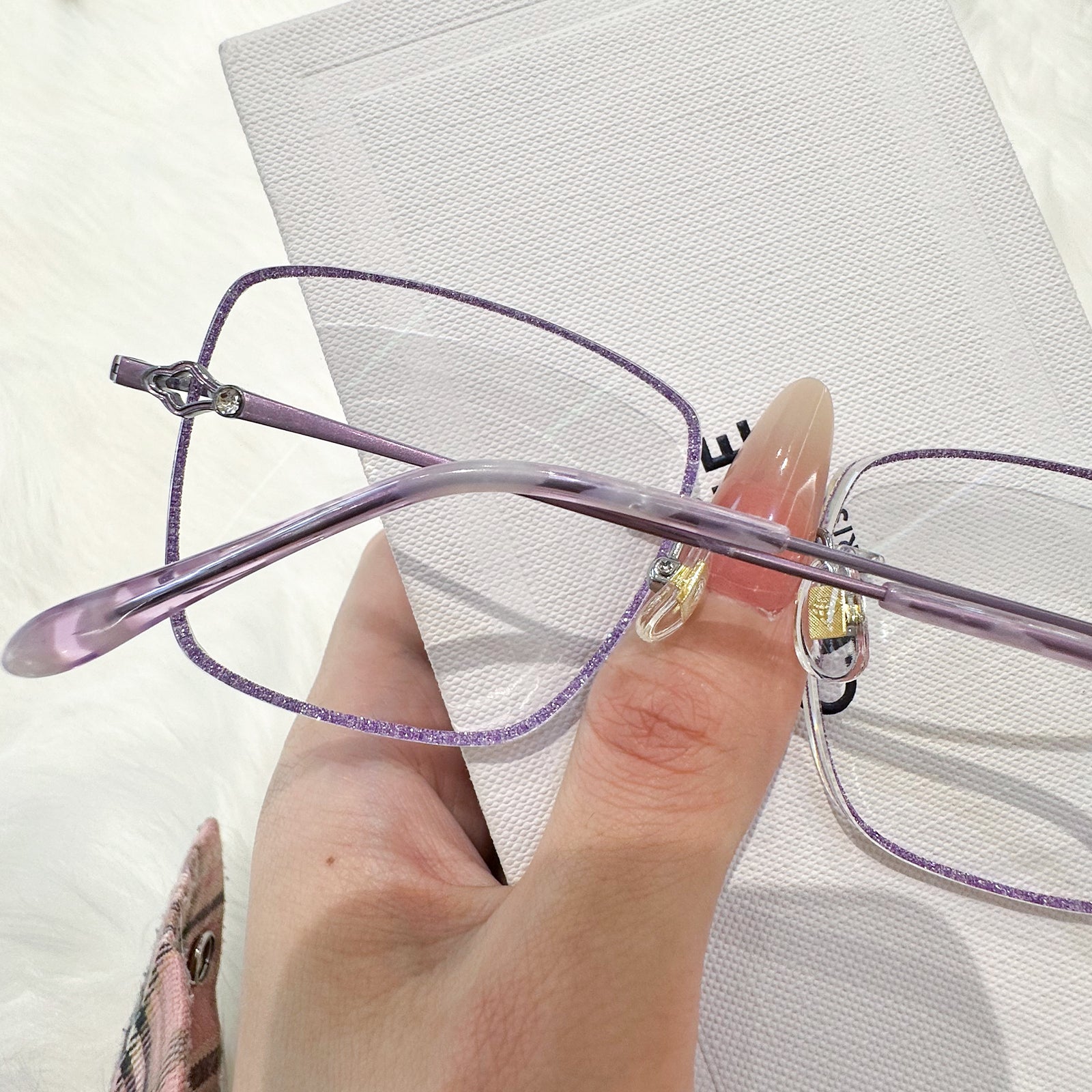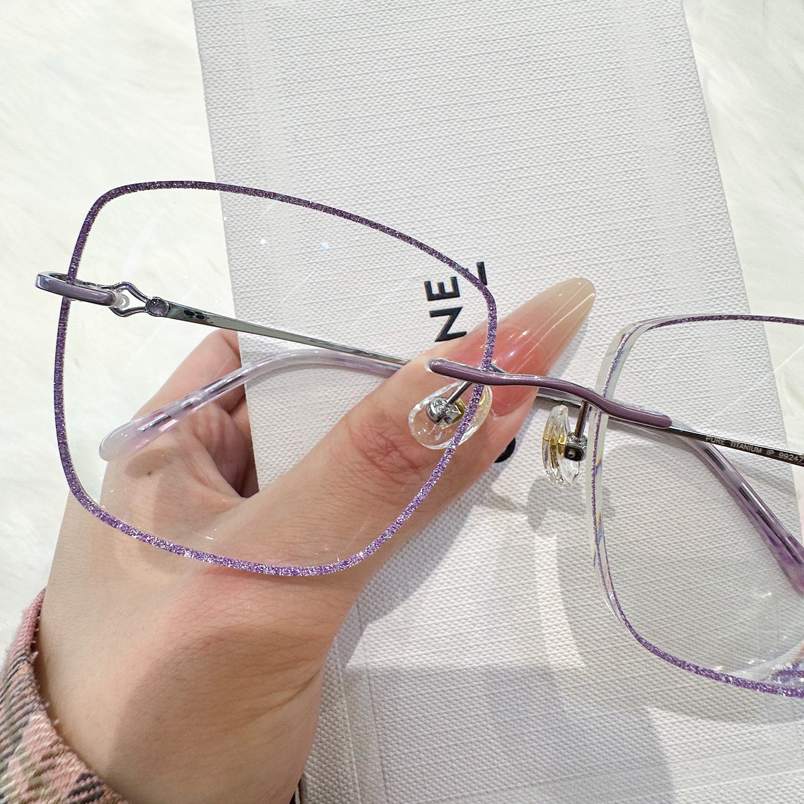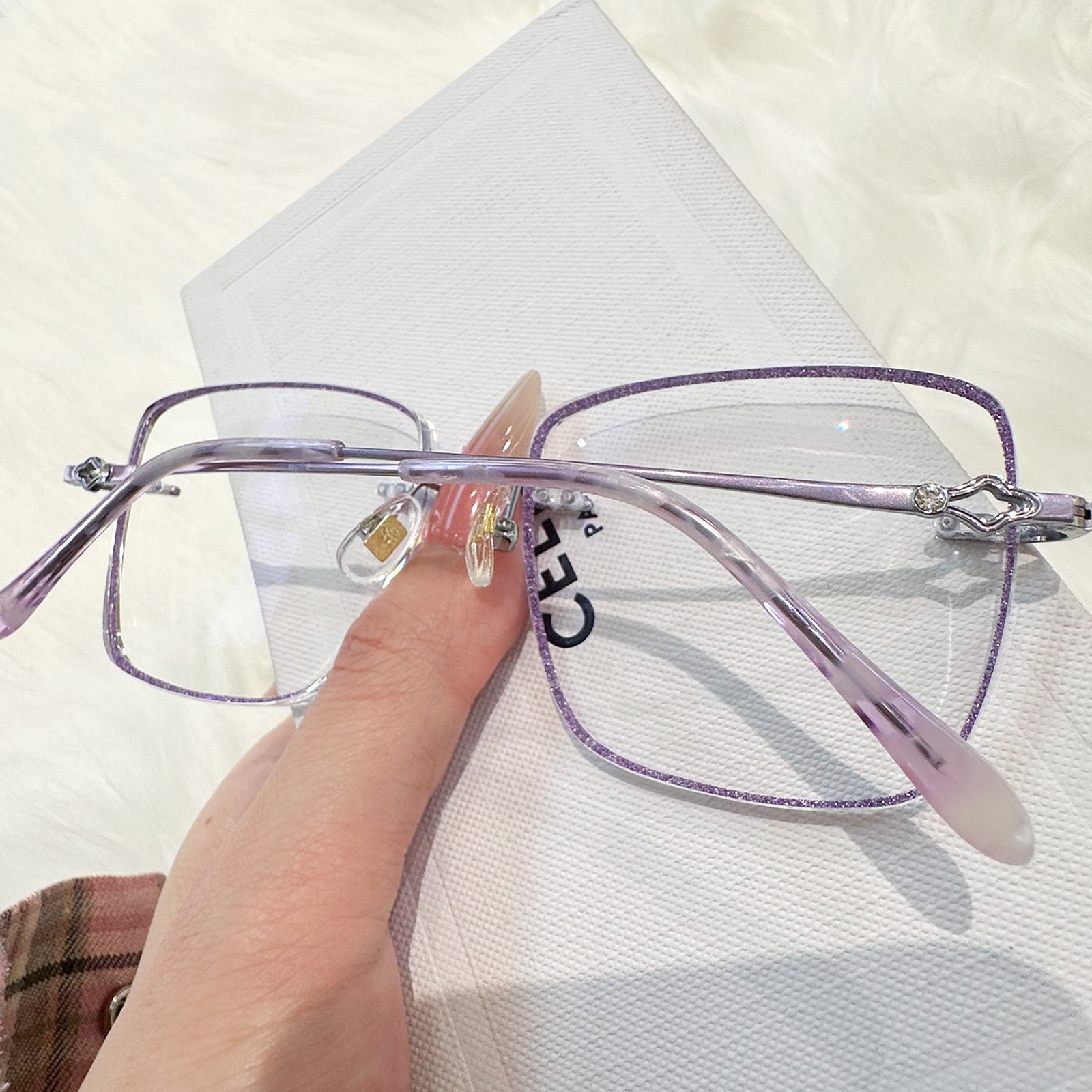 |Exclusive Design | Purple Glitter Square Rimless Glasses – a charming fusion of sparkle and sophistication. The square-shaped rimless lenses are adorned with fine purple glitter, adding a soft, dreamy glow to your look. Sleek metal temples are enhanced with elegant decorative details, making this pair both graceful and eye-catching. Perfect for adding a magical, feminine touch to your everyday style.