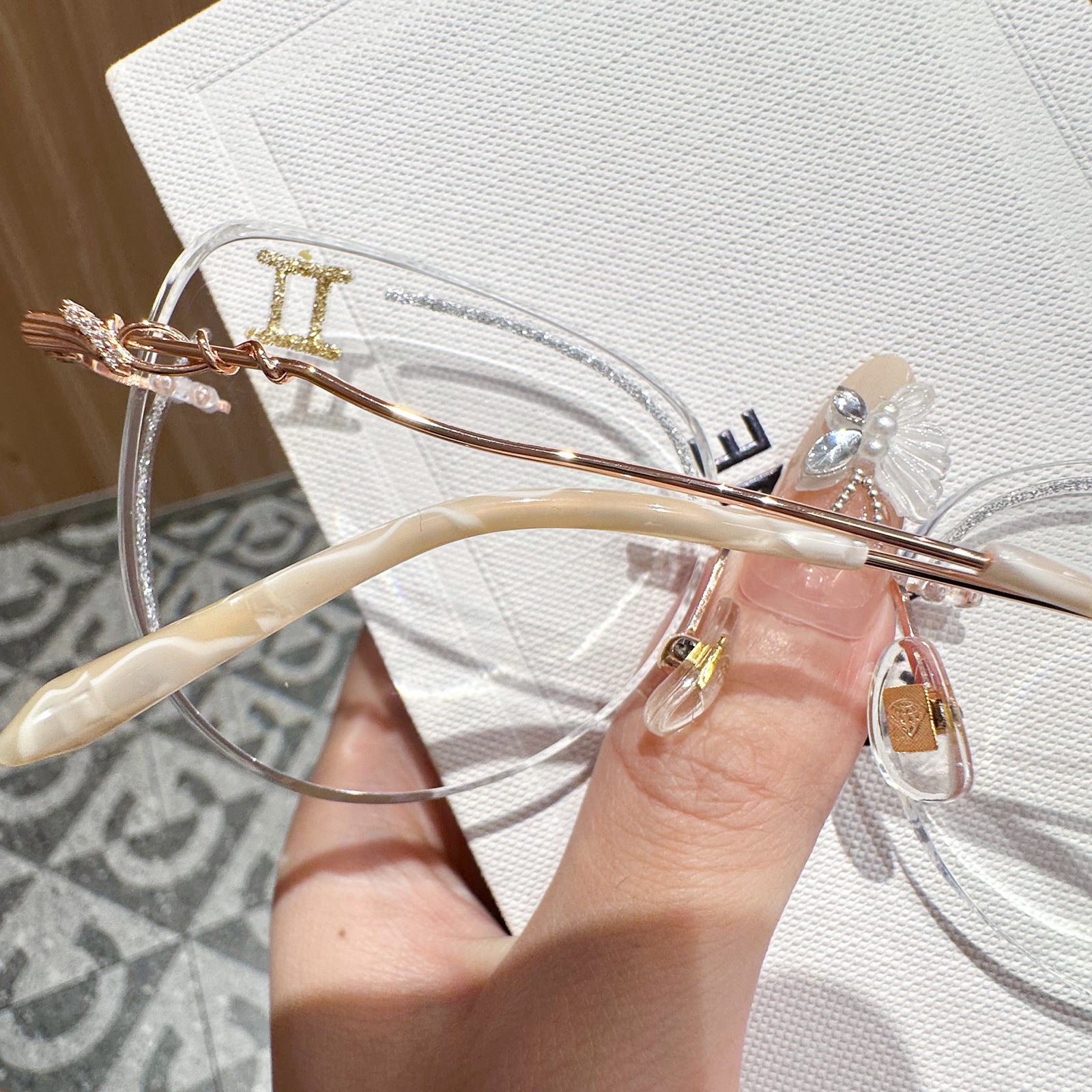 Charming and adaptable, Gemini is a master of communication and versatility. Playful and versatile, the Gemini-inspired rimless glasses showcase golden glitters on lenses and finely crafted metal temples. Light and flexible, they reflect Gemini's dynamic and ever-changing spirit.