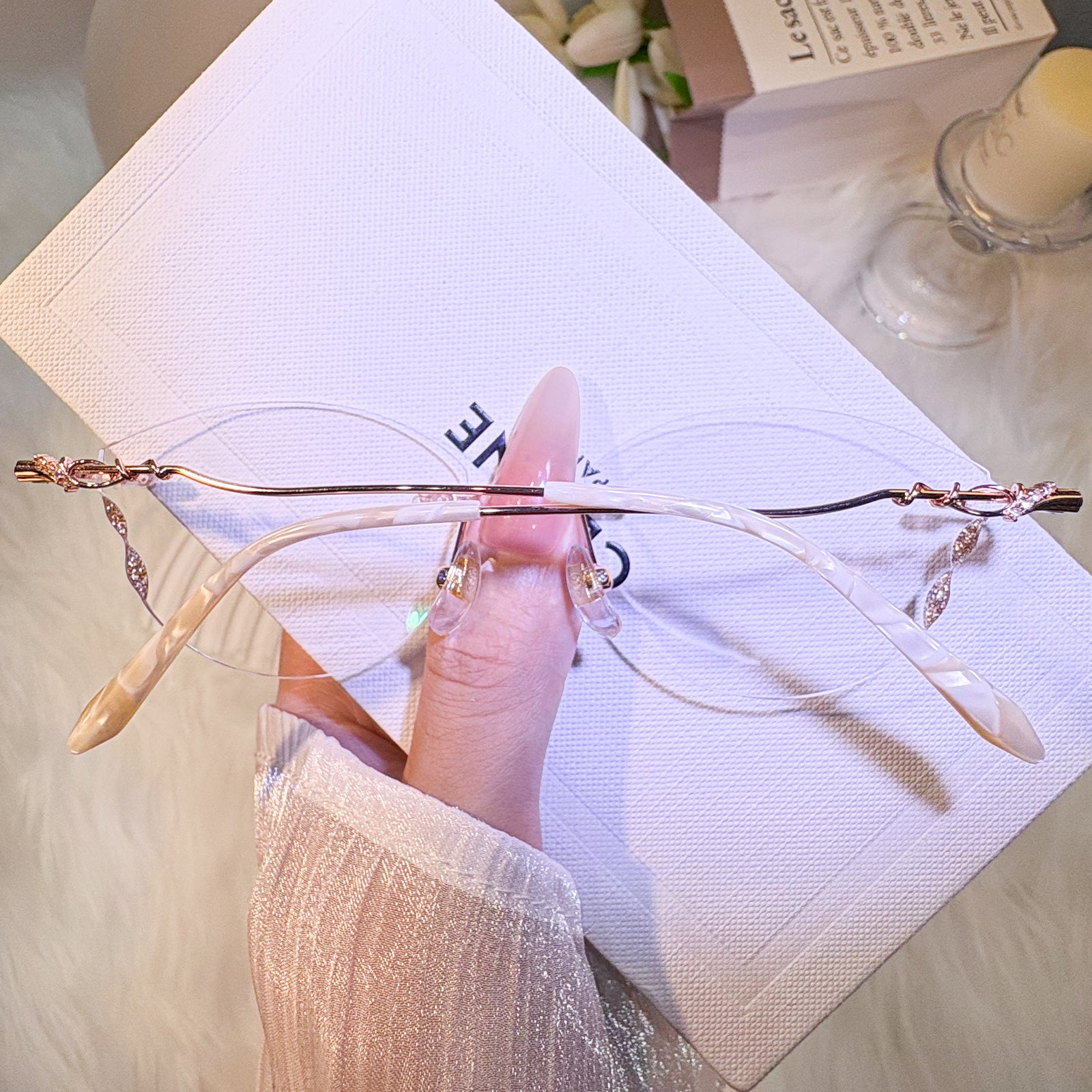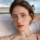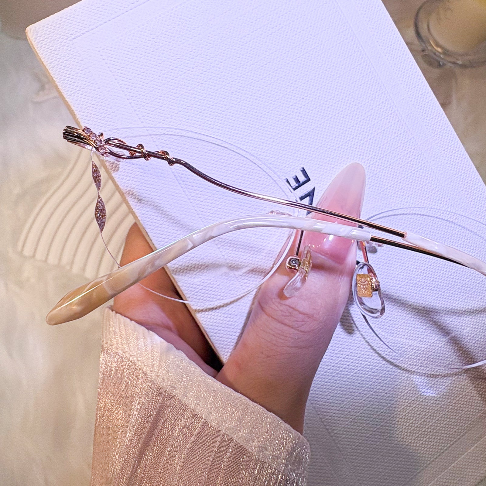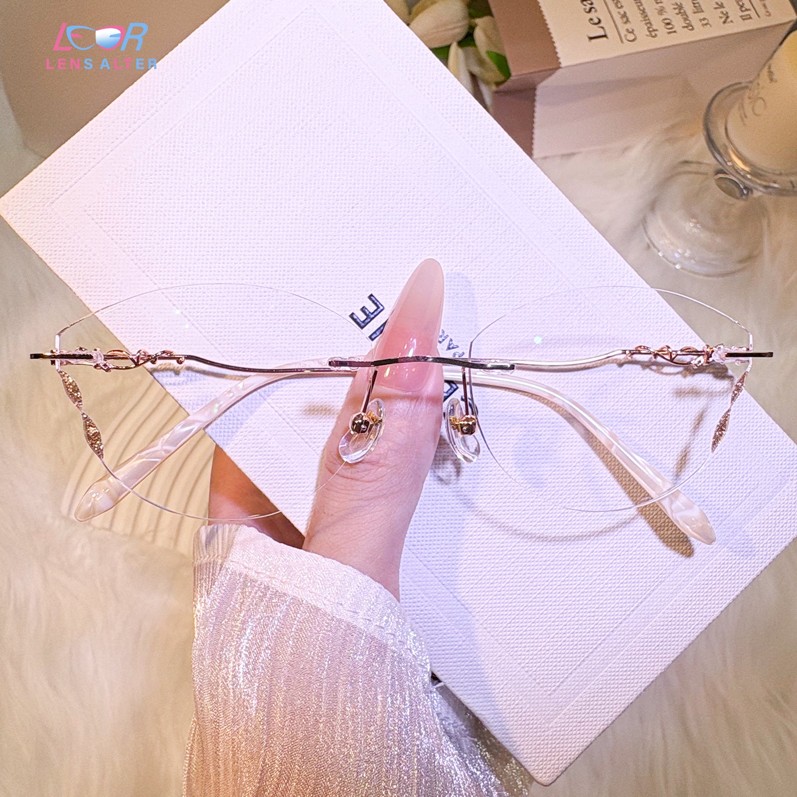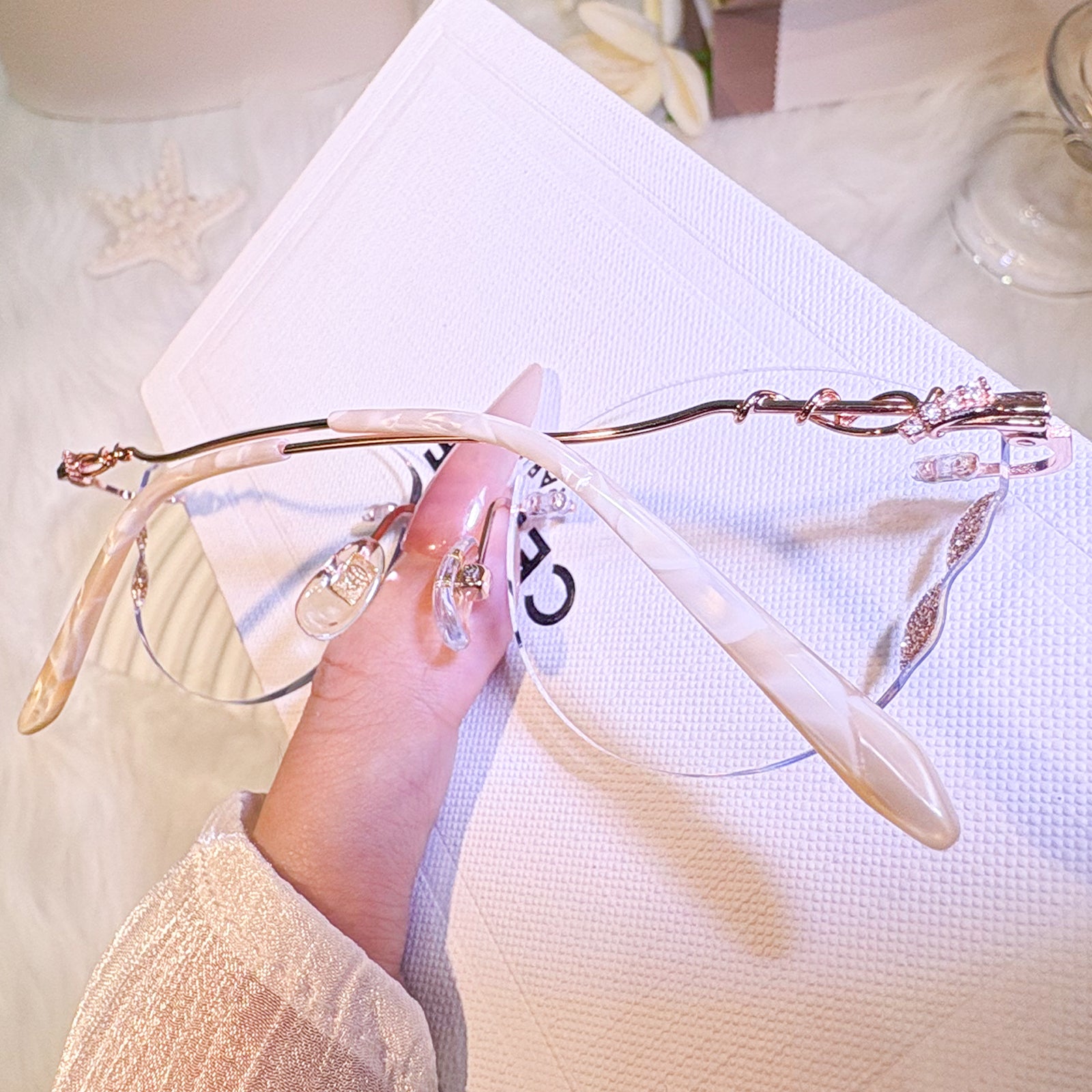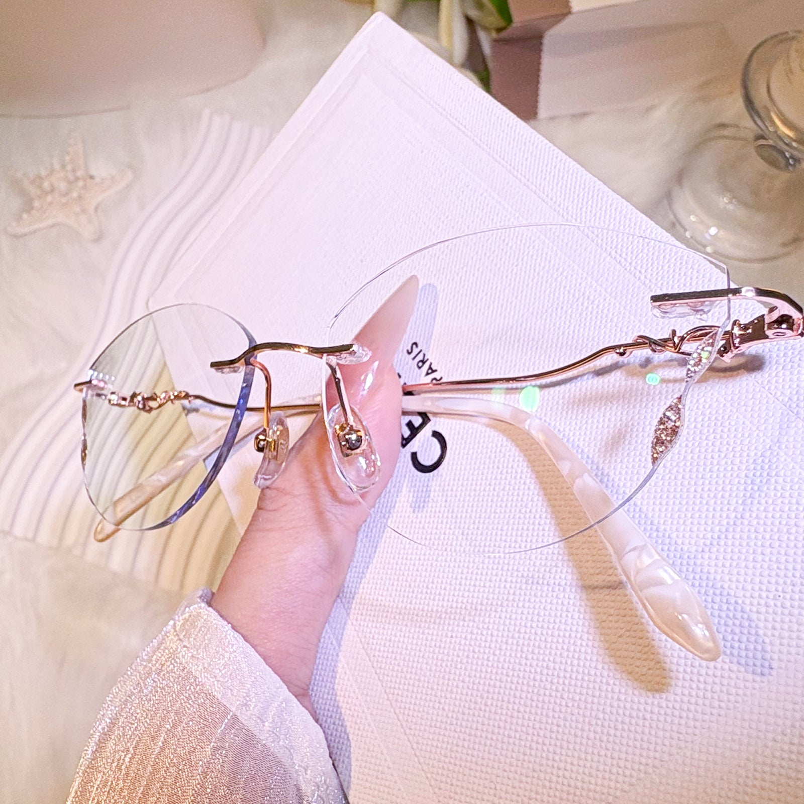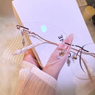 | Exlusive Design | This frameless pair features lenses shaped like delicate butterfly wings, adding a whimsical and ethereal charm. The subtle glitter on the lenses catches the light beautifully, while the intricately designed metal temples complete the look with elegance. A dreamy, feminine piece for those who love standout, graceful details.