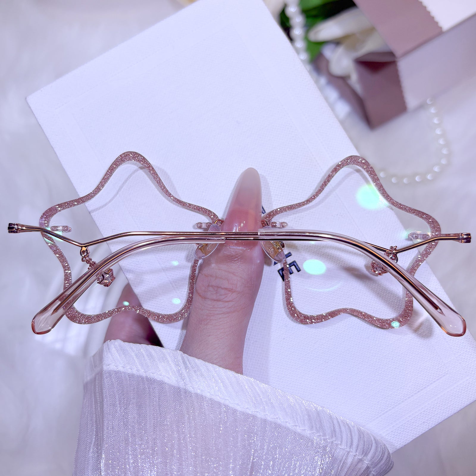 | Exclusive Design | These new star-shaped rimless glasses shine with bold, full glitter across the lenses, creating a dazzling, celestial sparkle from every angle. The temples feature tiny star accents for an extra touch of cosmic charm, while the smooth, silky texture adds a luxurious feel. A dreamy statement piece for anyone who loves all things bright and magical.