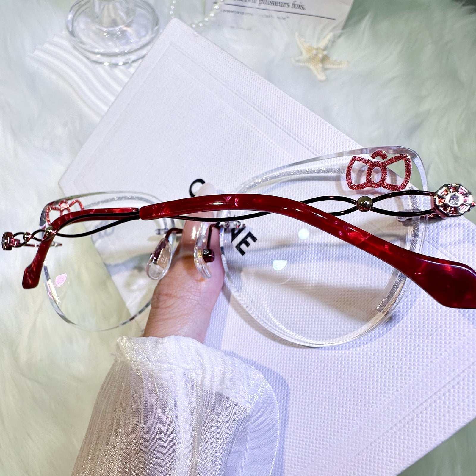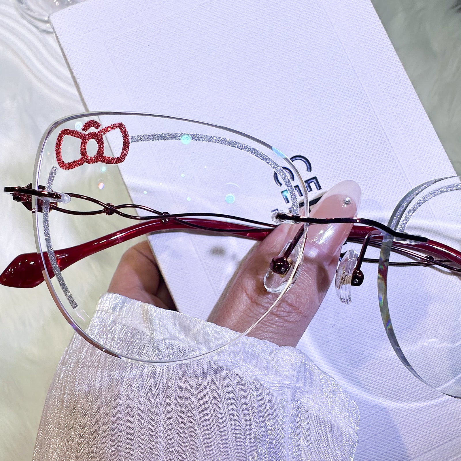 Kitty is wide rimless eyeglasses in rose golden and pink, crafted from high-quality metal with adorable kitty bows and silver glitters. Use the adorable collision of cartoon and sheen to show your inner innocence.