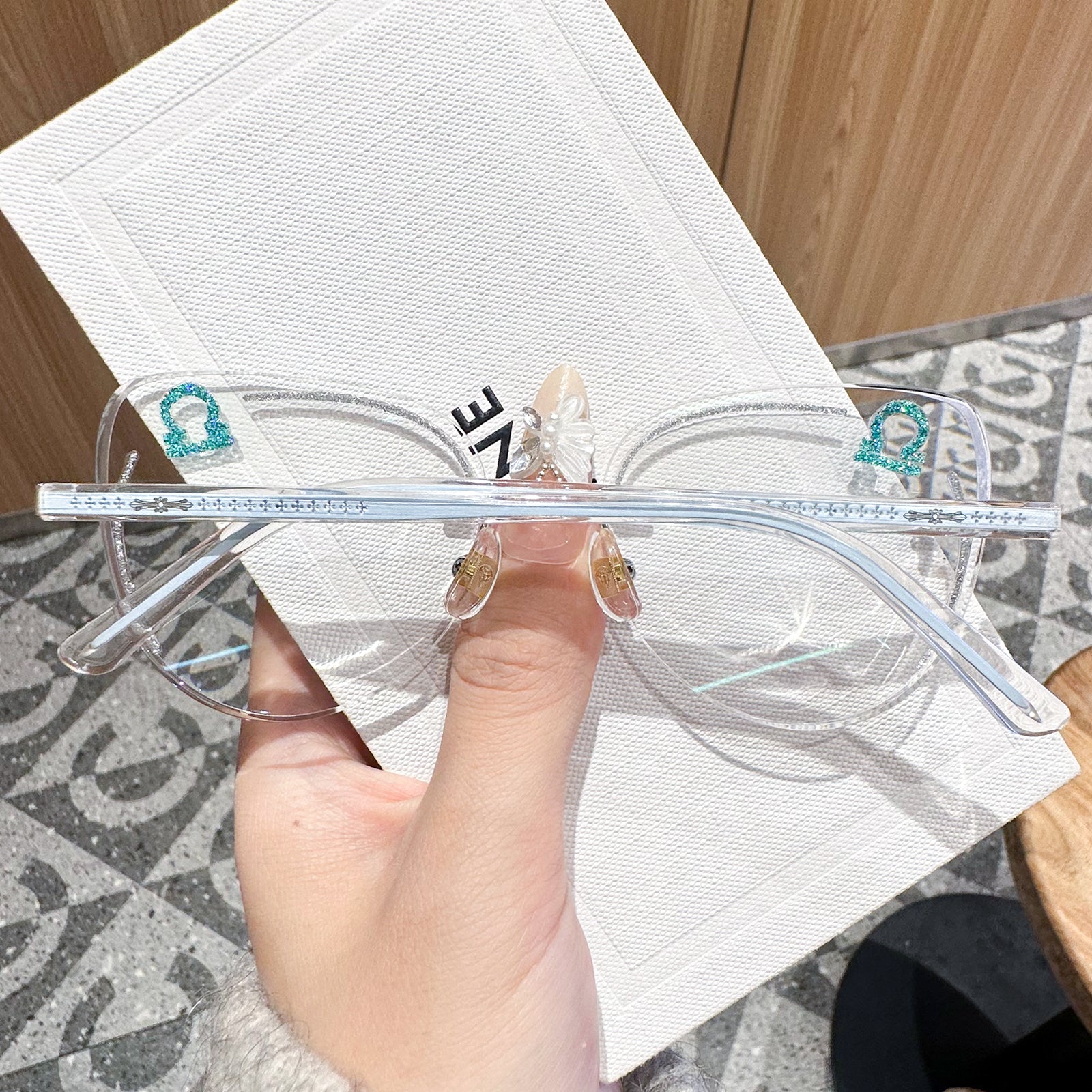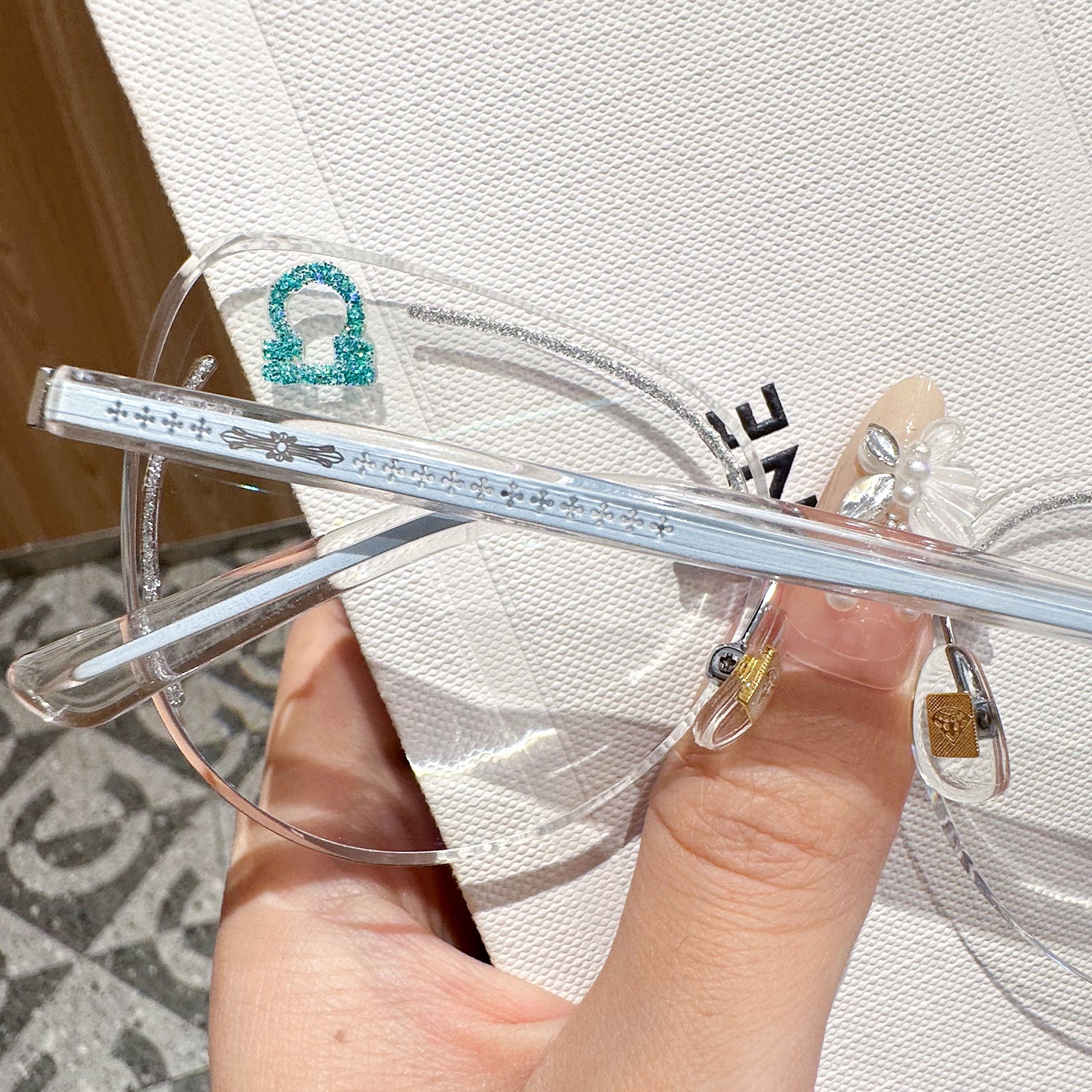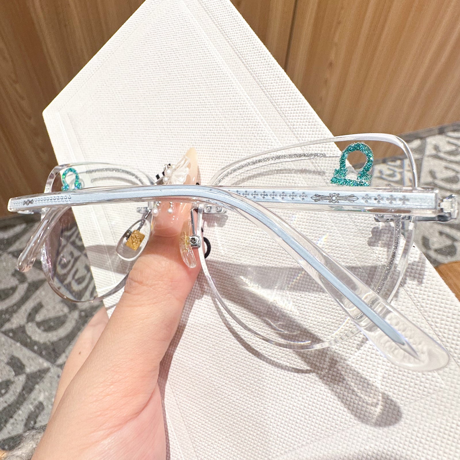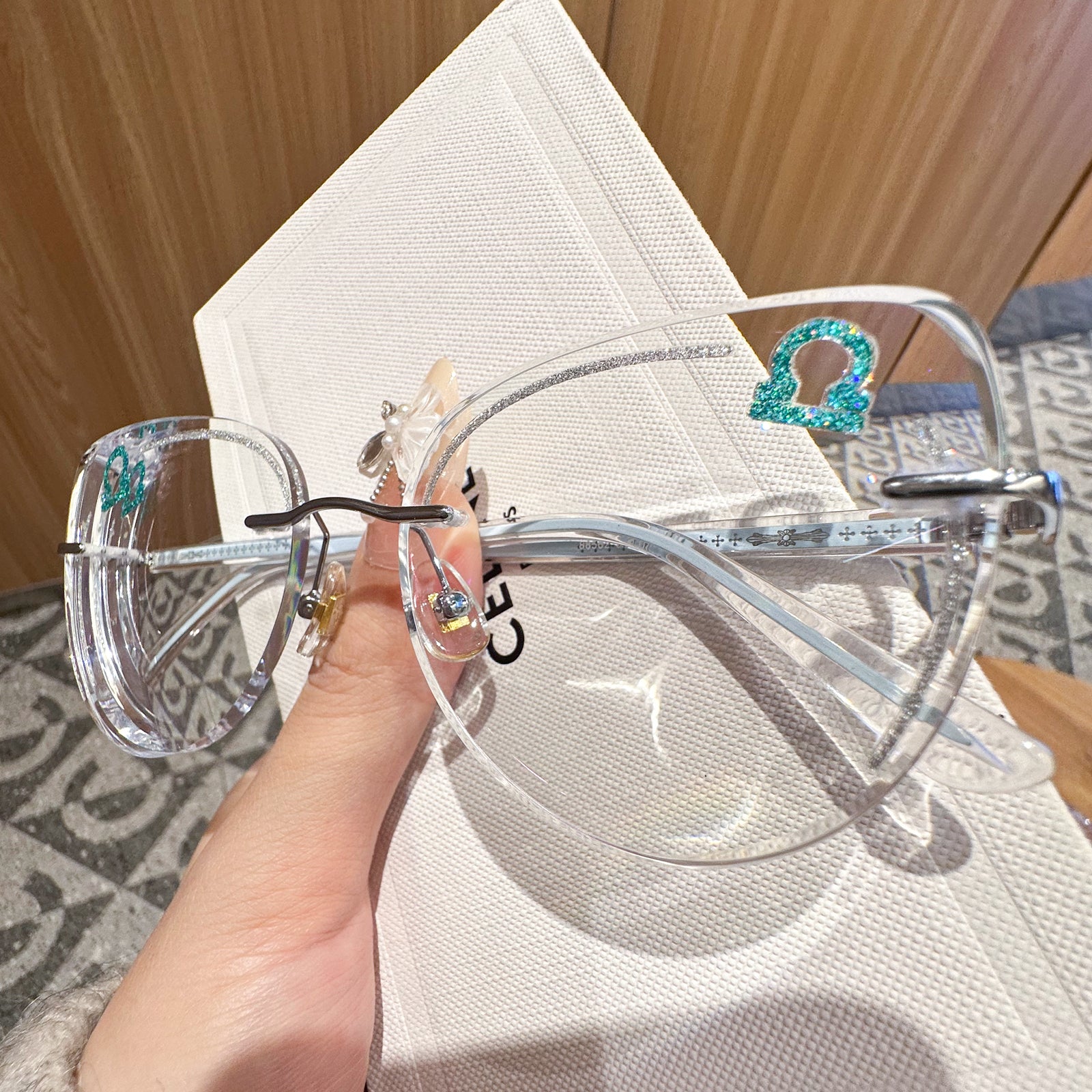 Balanced and charming, Libra seeks beauty and harmony in all things. The Libra-inspired rimless glasses feature soft blue tones and delicate fashion details on the temples. These frames embody harmony and effortless charm.