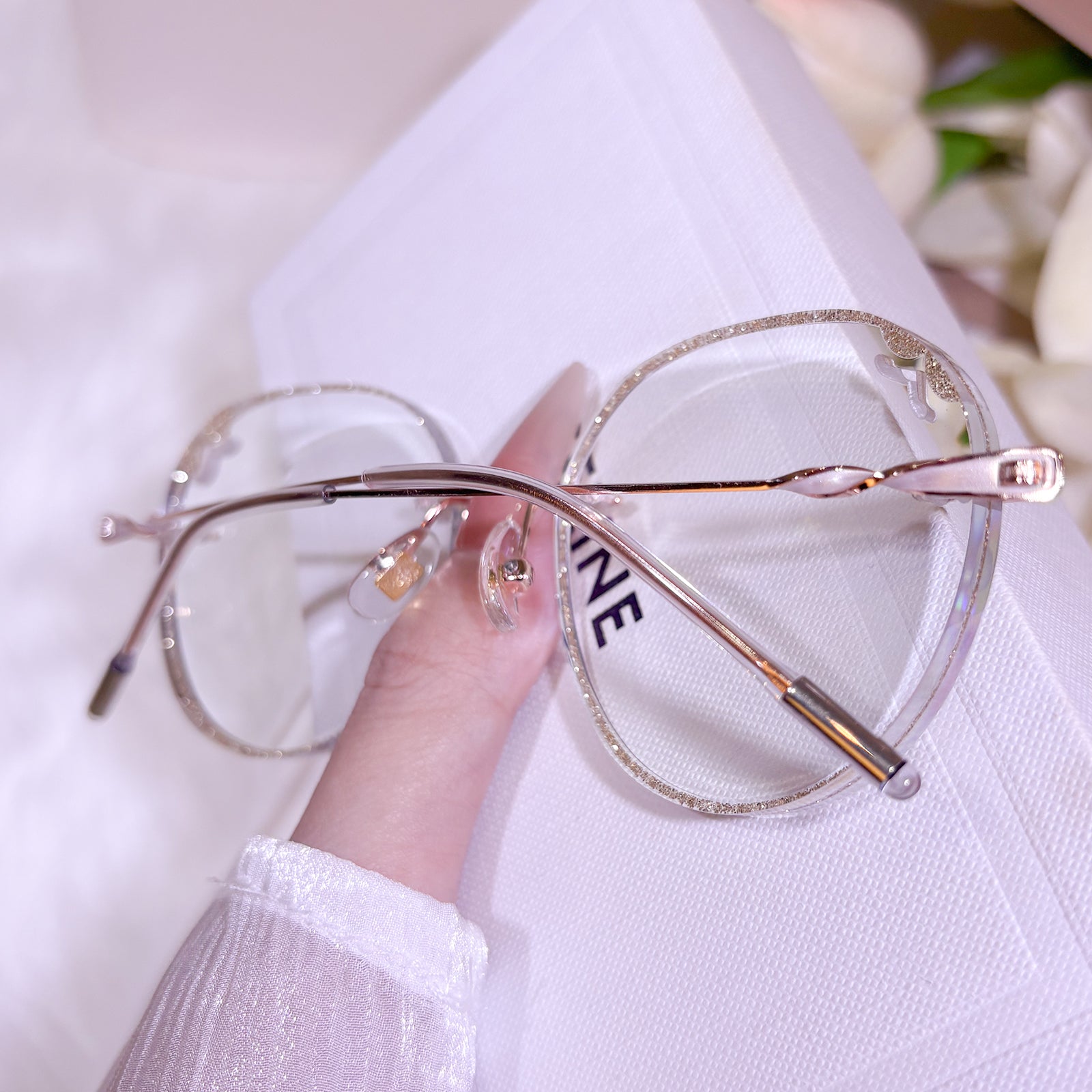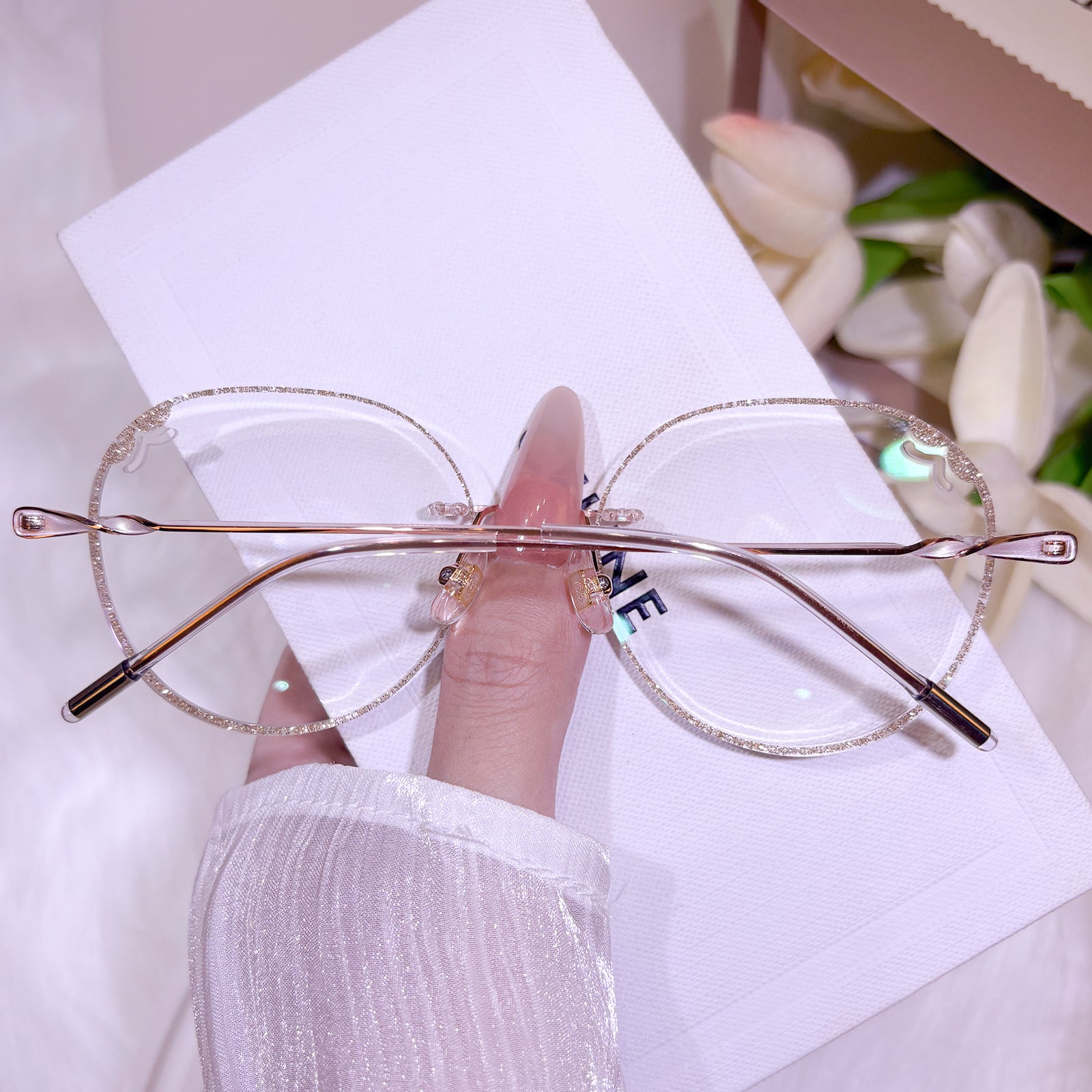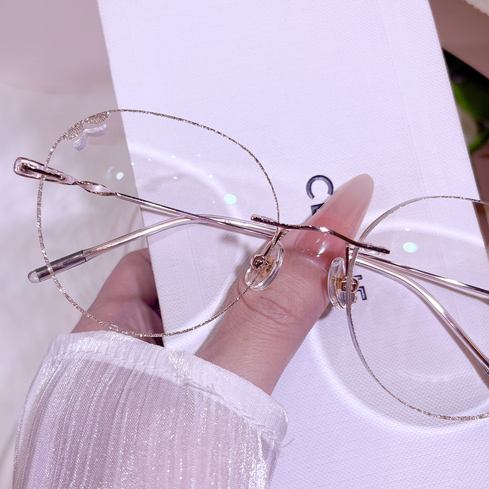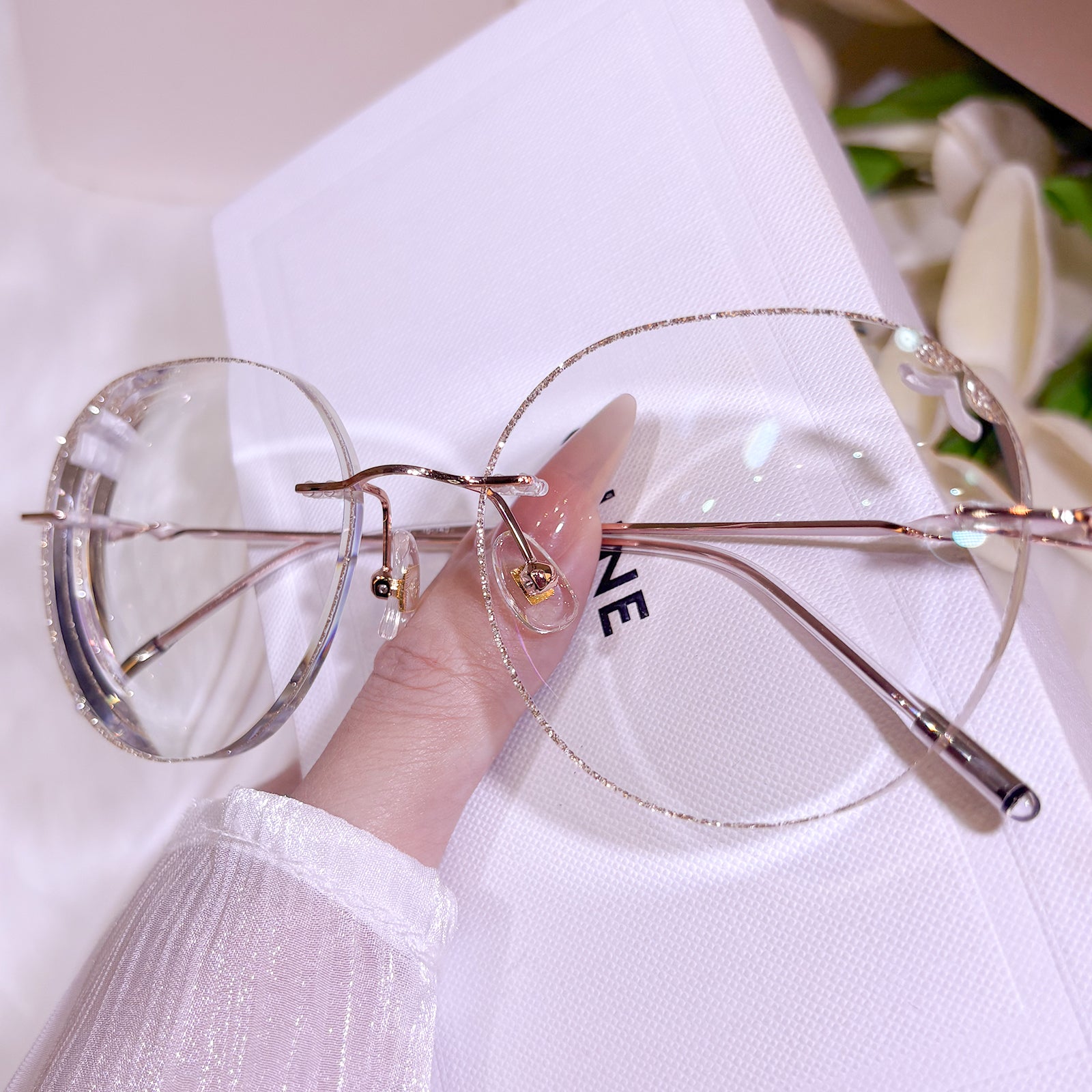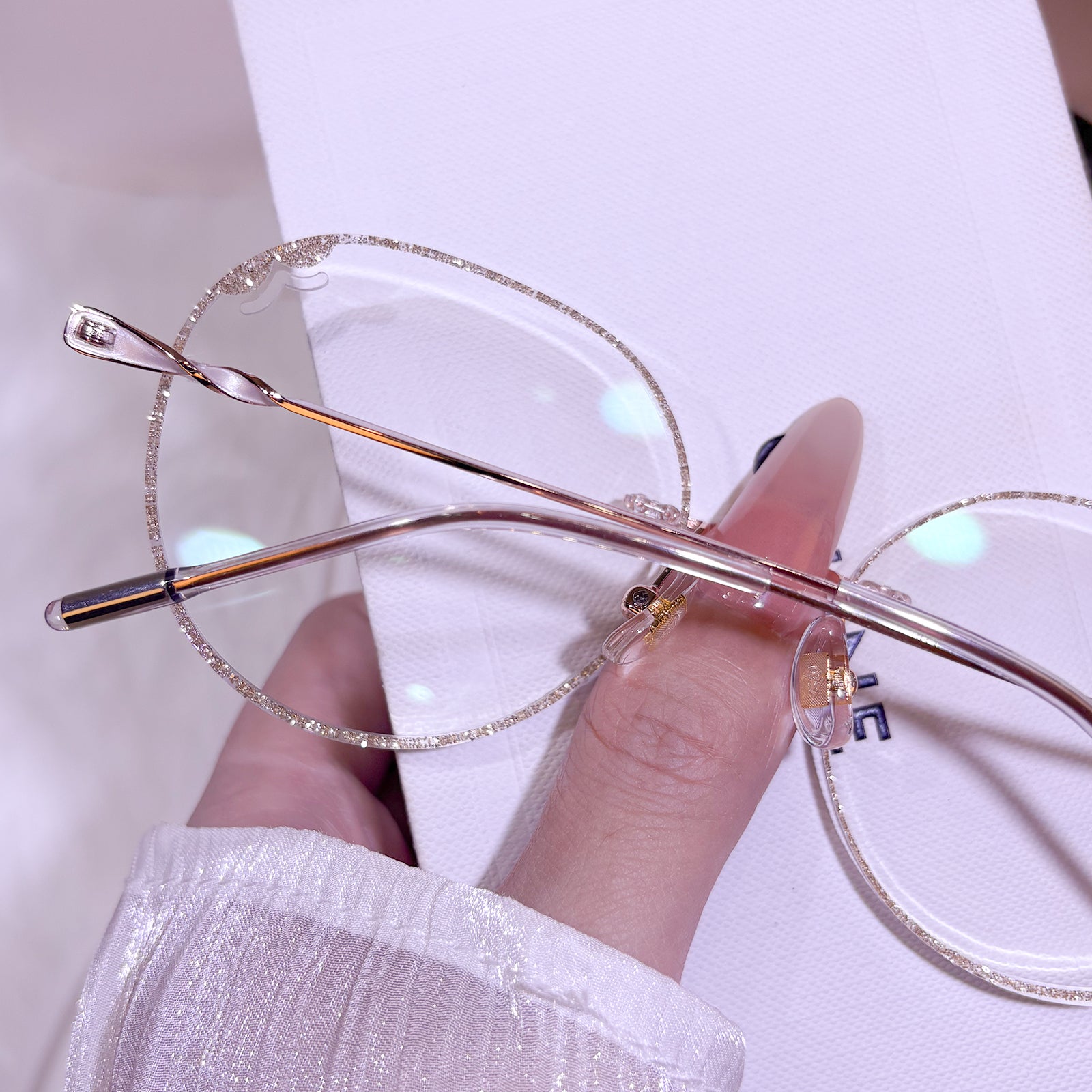 | Exclusive Design | These round rimless glasses exude sophistication, with lenses delicately surrounded by shimmering glitter. The unique notch design on the lenses adds a bold, artistic touch, while the slender temples enhance their refined and elegant silhouette. A truly glamorous accessory for those who love to shine with style.