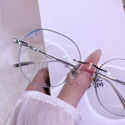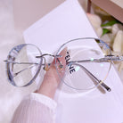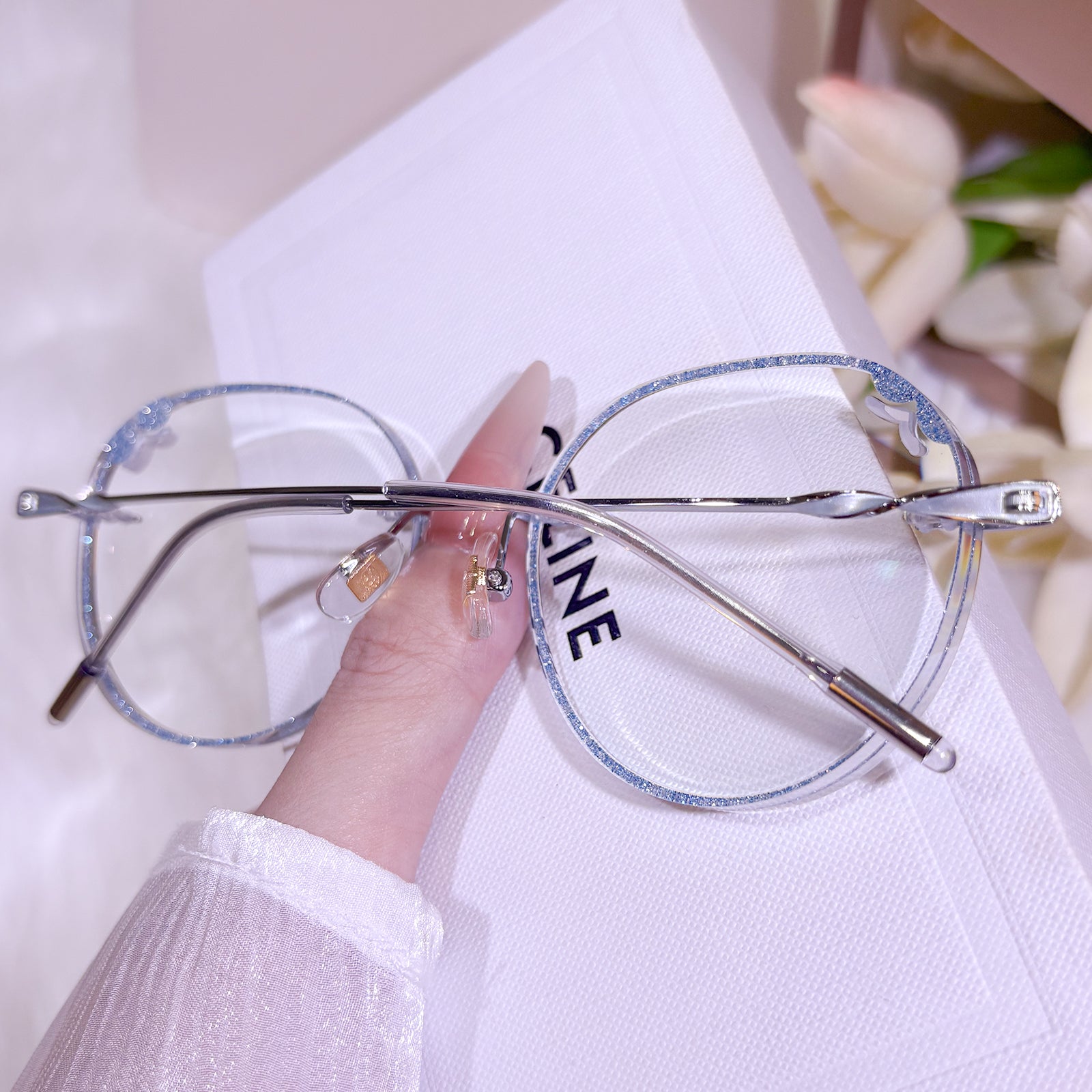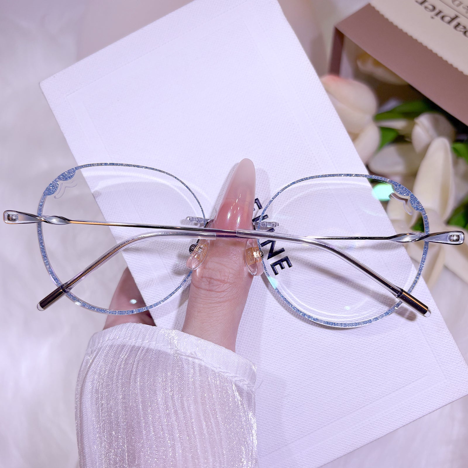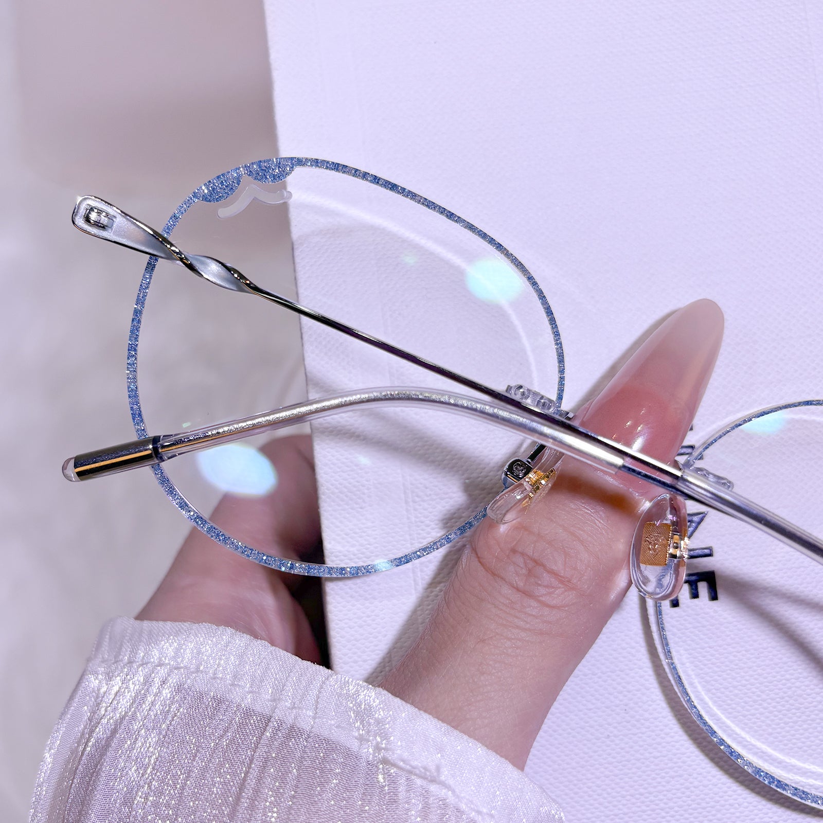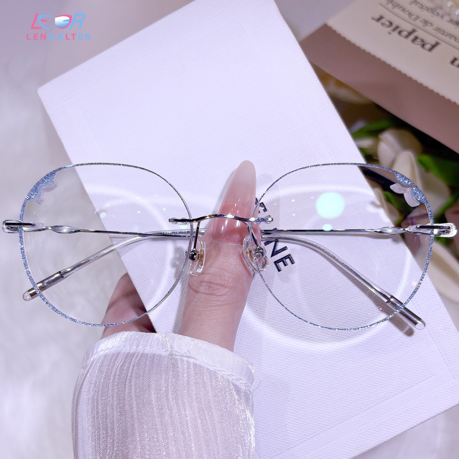 | Exclusive Design | These round rimless glasses exude sophistication, with lenses delicately surrounded by shimmering glitter. The unique notch design on the lenses adds a bold, artistic touch, while the slender temples enhance their refined and elegant silhouette. A truly glamorous accessory for those who love to shine with style.