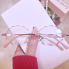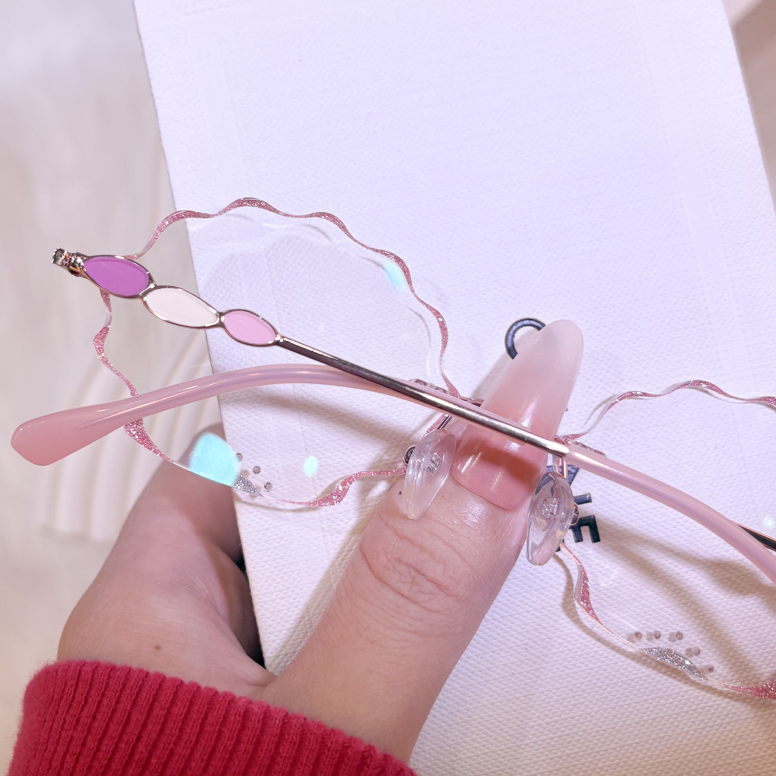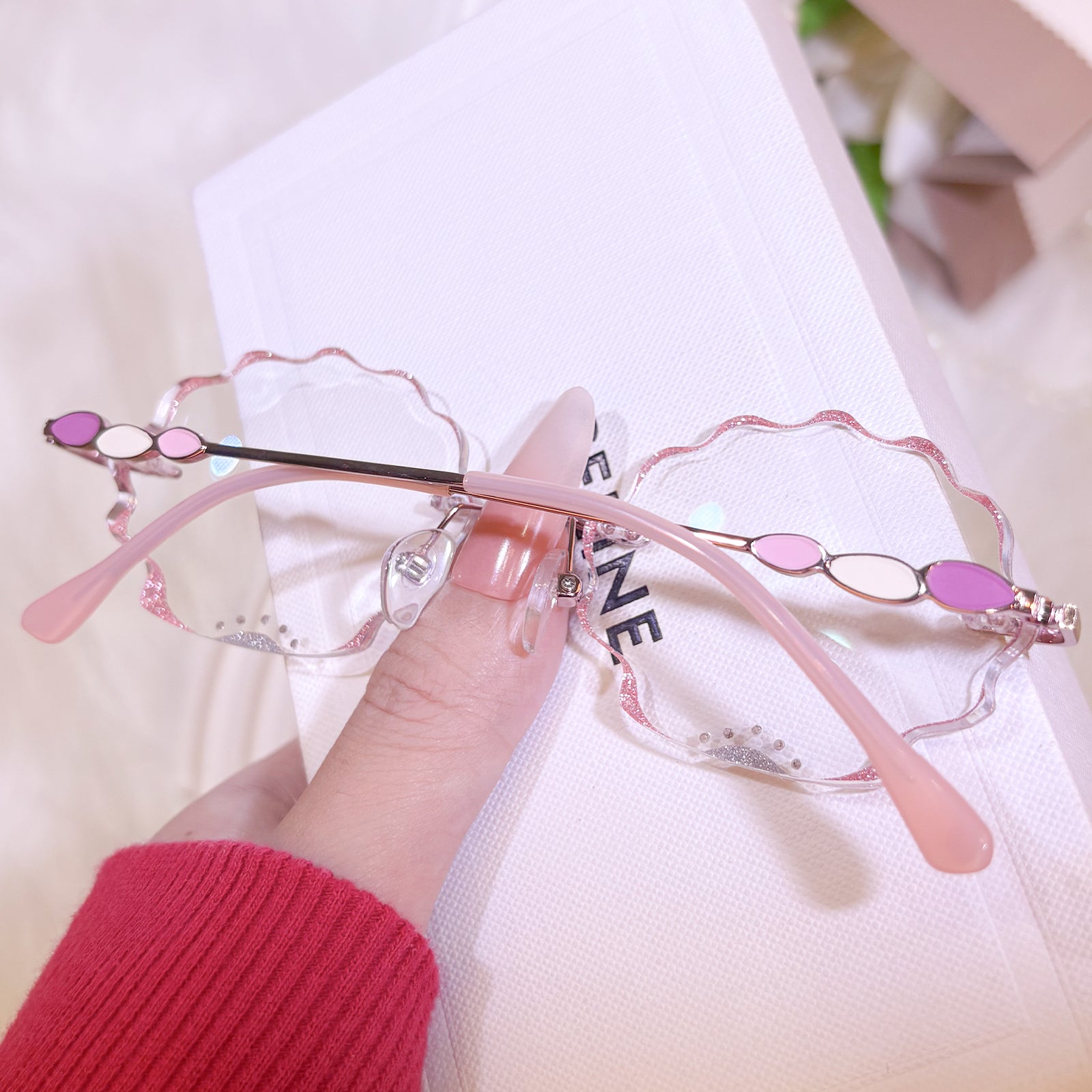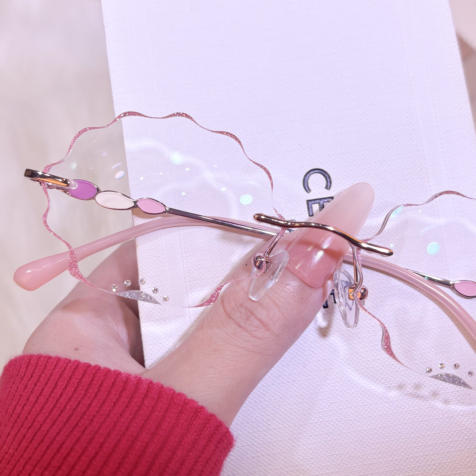 | Exclusive Design | This pink scallop-shaped rimless eyewear is irresistibly charming, featuring shimmering glitter edges and a sprinkle of tiny diamond accents that make the lenses sparkle with every angle. The vibrant temples add a playful pop of color, creating a dreamy, eye-catching design that feels both whimsical and beautifully unique. Perfect for anyone who loves standout, mermaid-core inspired accessories.
