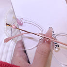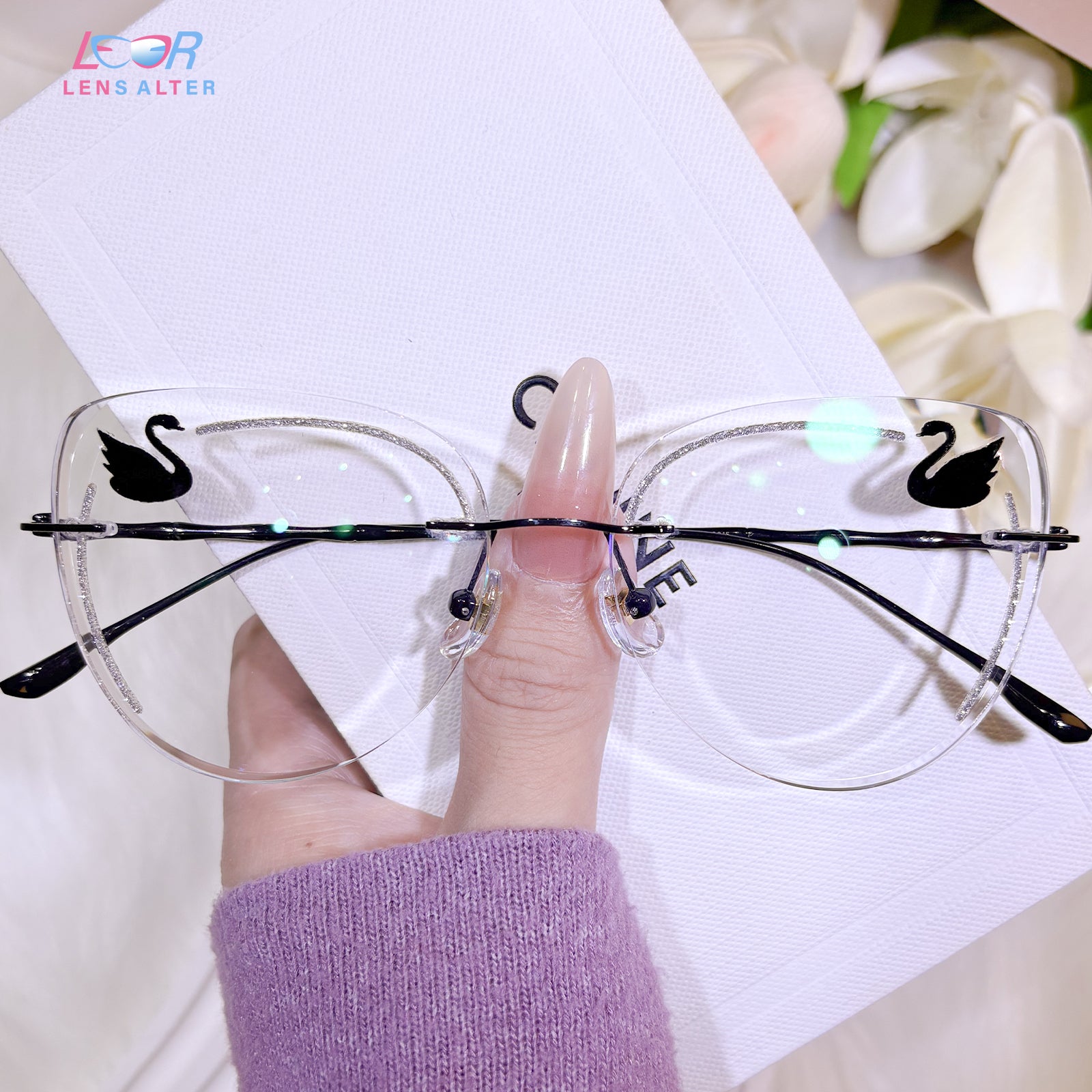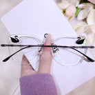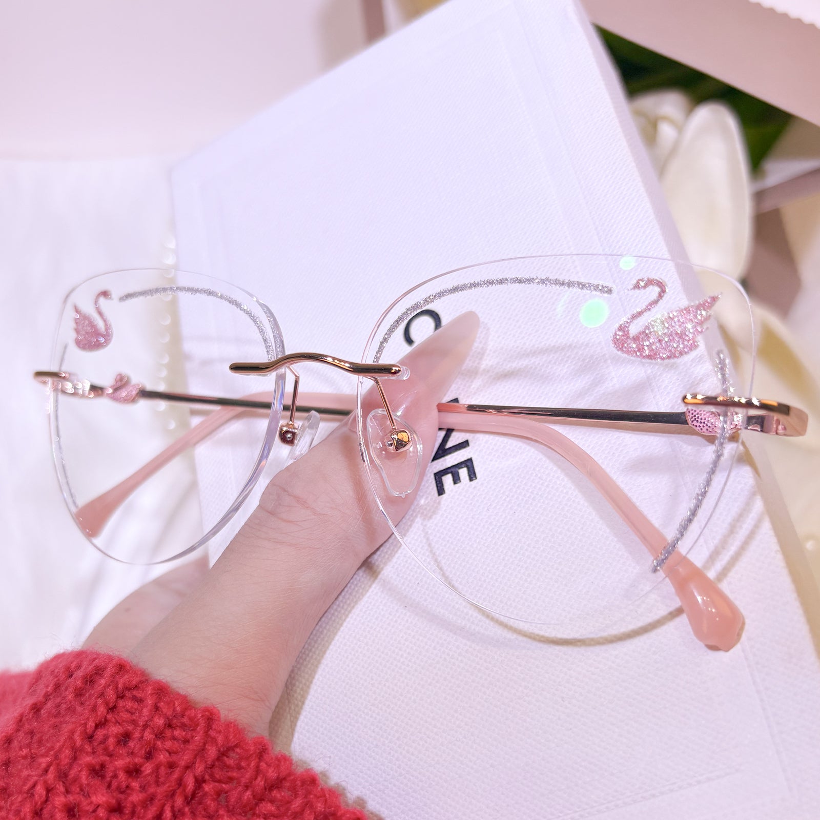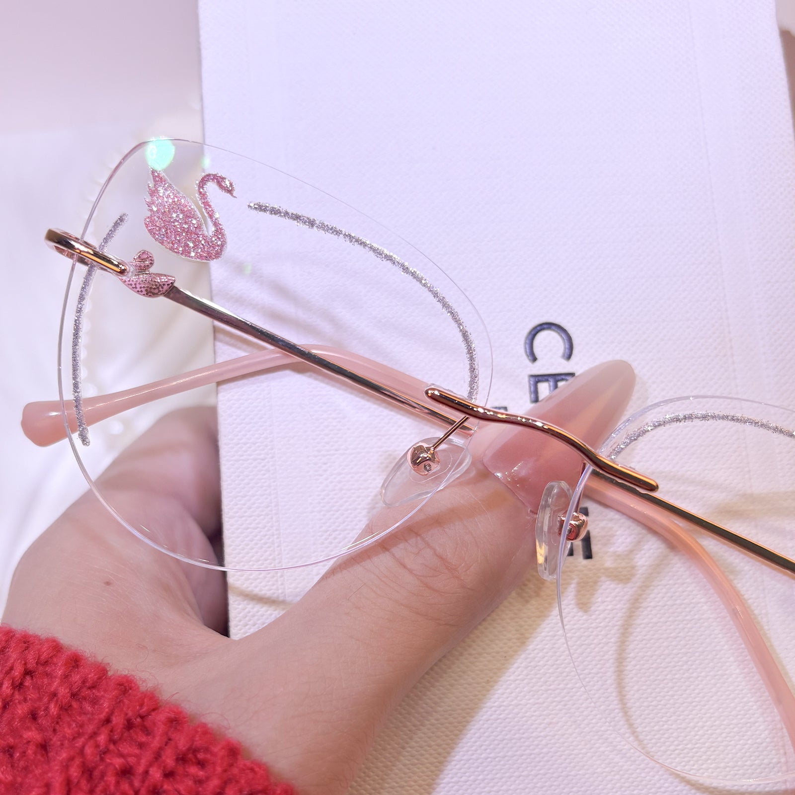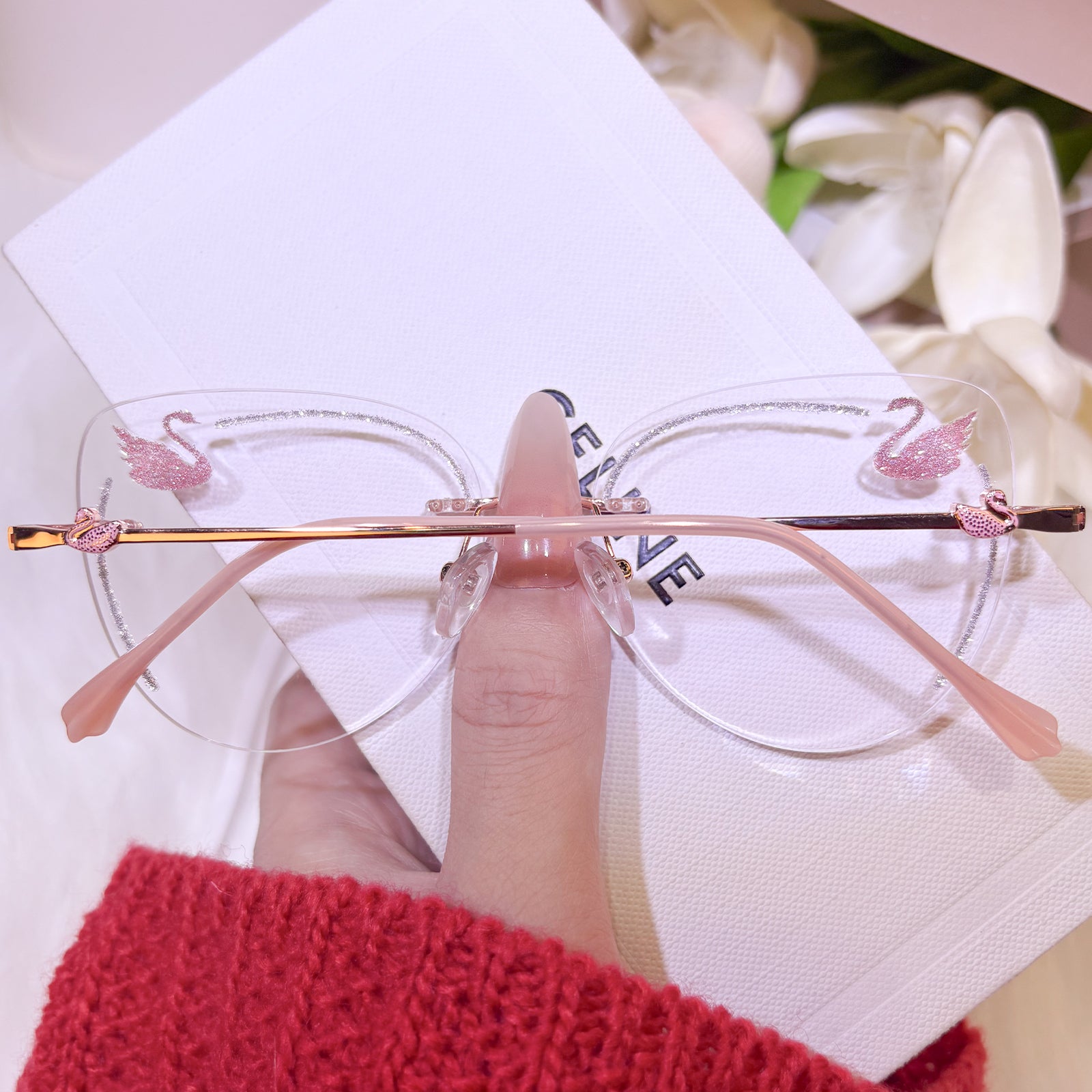 | Exclusive Design | These delicately minimalist glasses for women feature a weightless metal frame in soft blush pink, where the frameless design draws full attention to the graceful swan motif adorning each temple tip. The elegant swan appears in mid-flight, its form sculpted with poetic precision against the warm-toned metal, creating a look that balances ethereal beauty with structured refinement. For the modern woman who carries both strength and grace in her every gesture.
